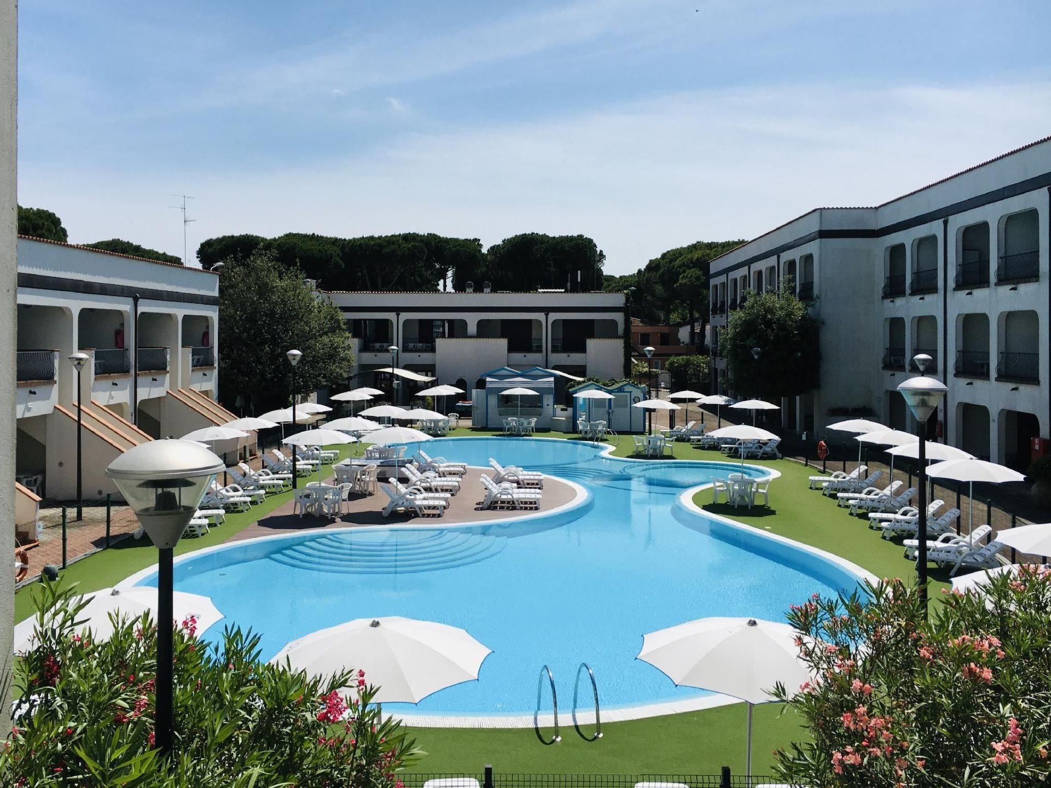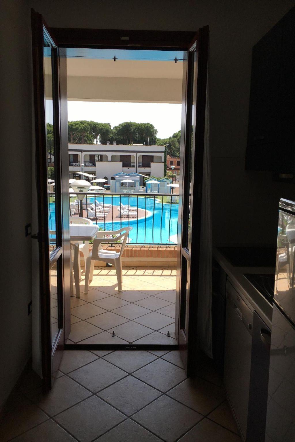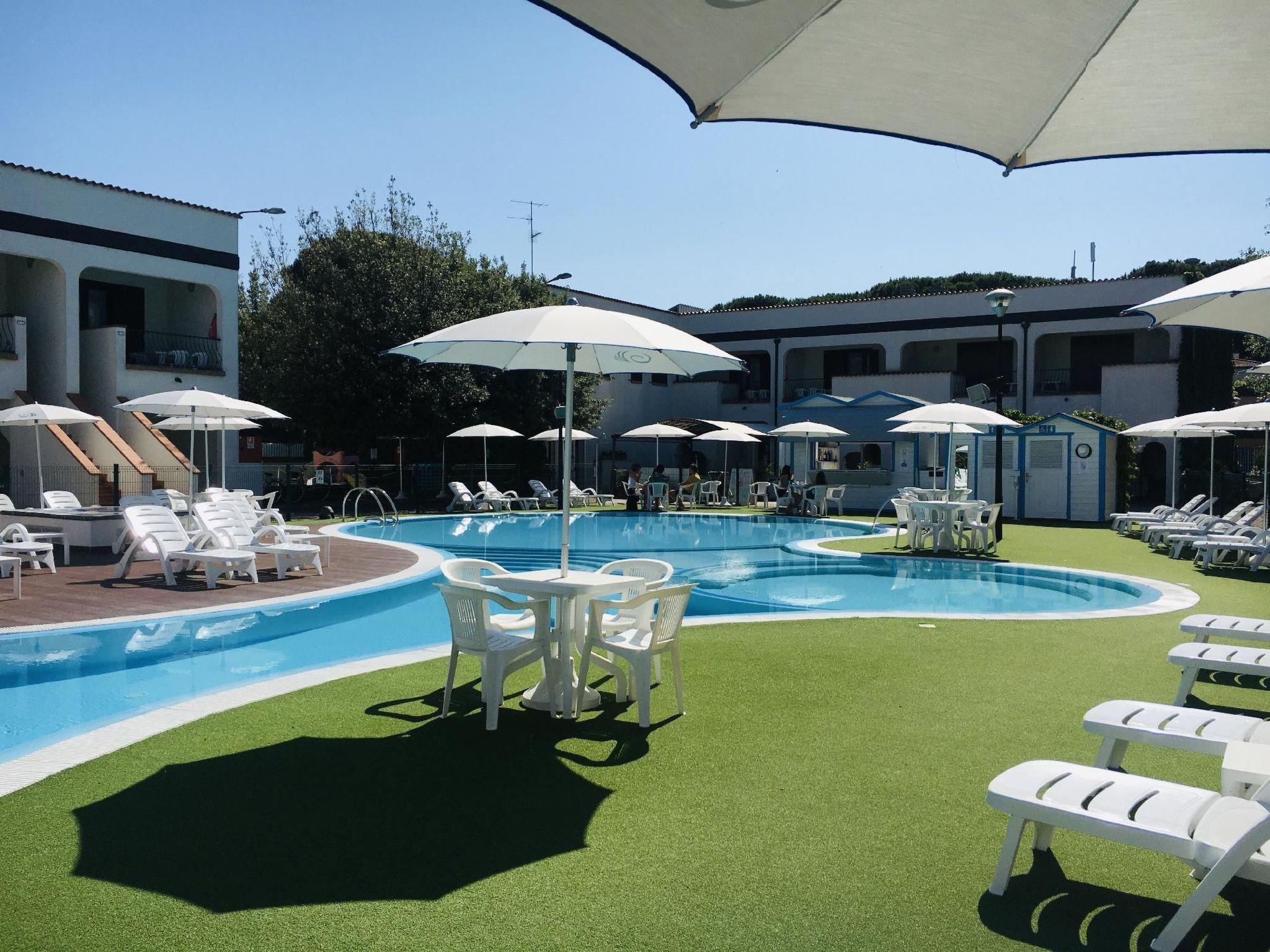 First floor living room with two beds and sofa, TV/sat, separate kitchen with electric hotplates, fridge with freezer, dishwasher, microwave oven, eavesdropper, bathroom with shower cubicle, large covered loggia balcony over the pool equipped with tables and chairs, air conditioning/heating system, wireless internet connection. On the second floor a bedroom with double bed and covered loggia balcony over the pool, and a bedroom with bunk bed plus single bed and covered loggia balcony, bathroom with shower cubicle, safe, air conditioning/heating system. Parking space for exclusive use on the outer perimeter of the residence. 1 beach umbrella + 2 sun loungers at the beach included in the price. DOGS ARE ALSO WELCOME IN THESE FLATS!