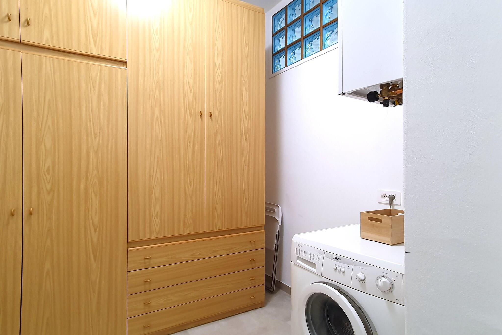 I 3. etasje: (Stue(dobbel sovesofa, TV, spisebord, sittehjørne), åpent kjøkken(komfyr med kokeplater, kjøkkenvifte, stekovn, mikrobølgeovn, oppvaskmaskin, kjøleskap med fryser, håndvask), soveværelse(dobbeltseng, balkon), bad(dusj, håndvask, toalett, bidet), vaskerom(vaskemaskin), klimaanlegg) spisebord, takterrasse, solsenge, Parasoll