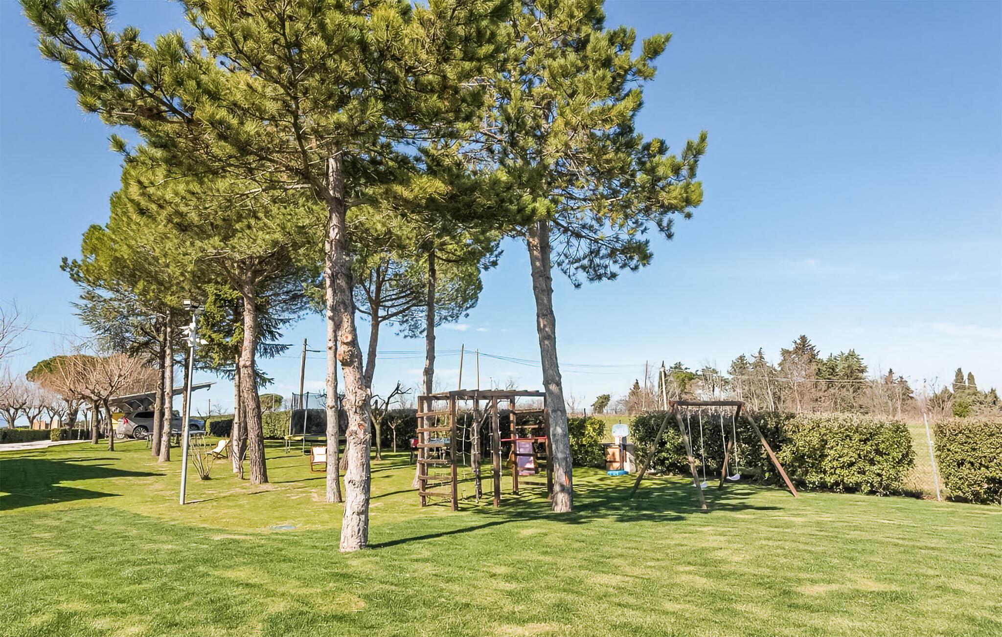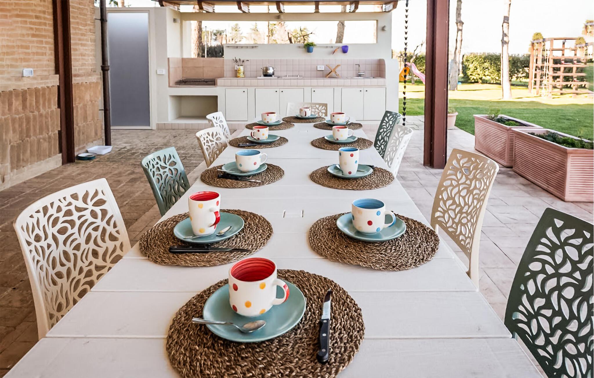 Slå deg ned på den overbygde terrassen, tilbered maten på utekjøkkenet og tilbring lange kvelder i en avslappet atmosfære. La barna løpe rundt på de mange lekeapparatene, eller ta et slag fotball eller bordtennis sammen.