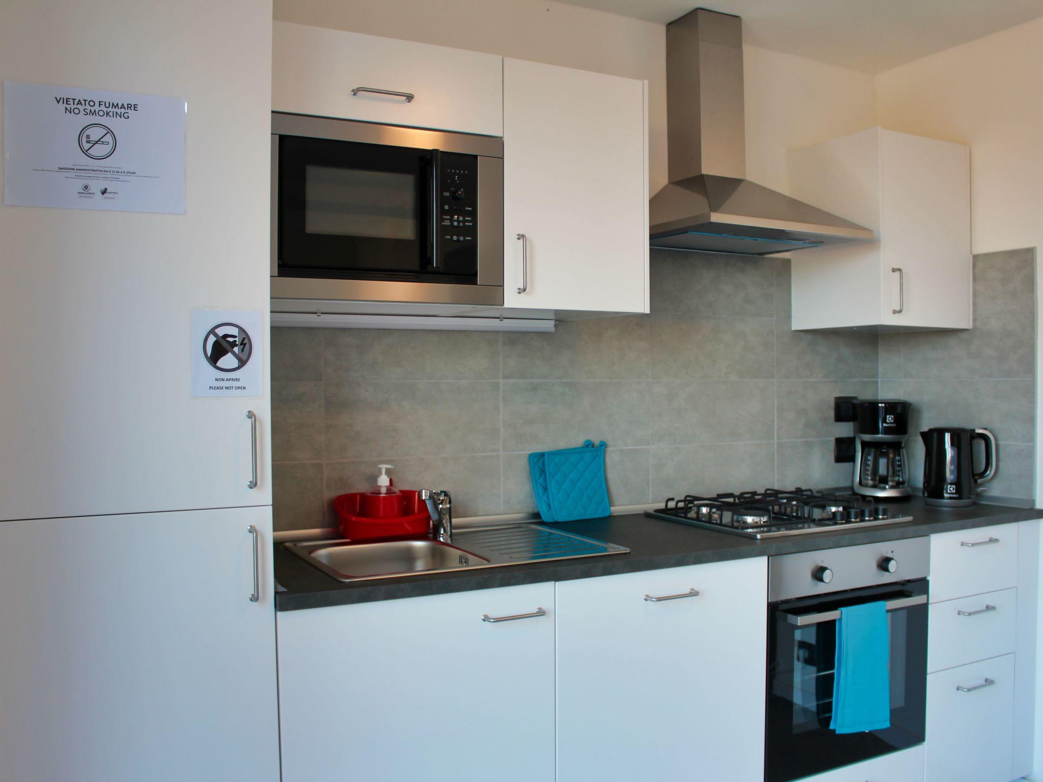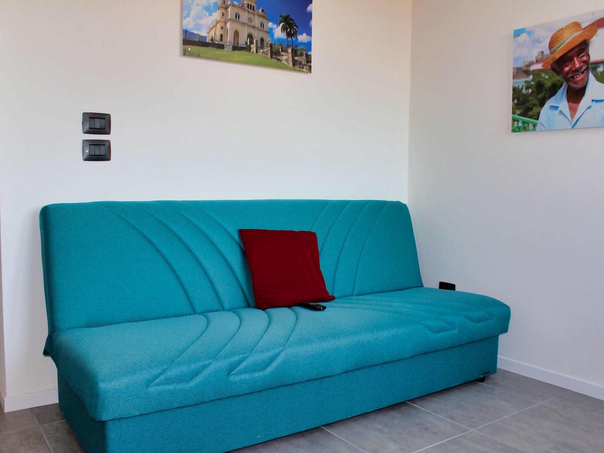 Inside, the flat boasts a wealth of amenities including a fully equipped kitchenette with electric oven, hob, refrigerator, dishwasher and microwave, ensuring complete autonomy for preparing meals. The living room is cosy, furnished with a comfortable single sofa bed, a 32-inch LCD TV with USB and HDMI ports, air conditioning and heating, providing an ideal atmosphere for relaxation. The private bathroom is equipped with a shower, washing machine and hairdryer, and a first set of bed linen and towels is provided at no extra cost.