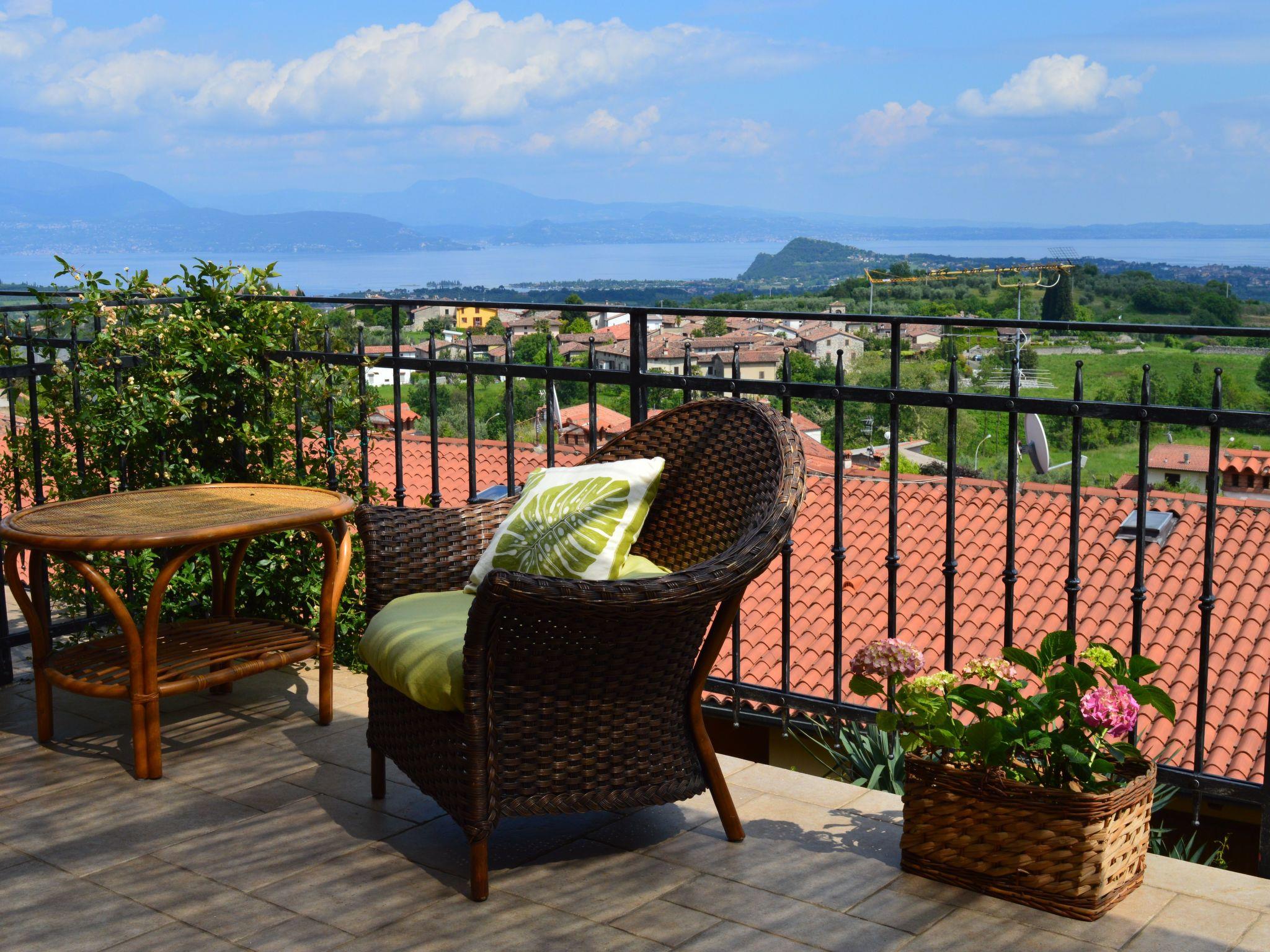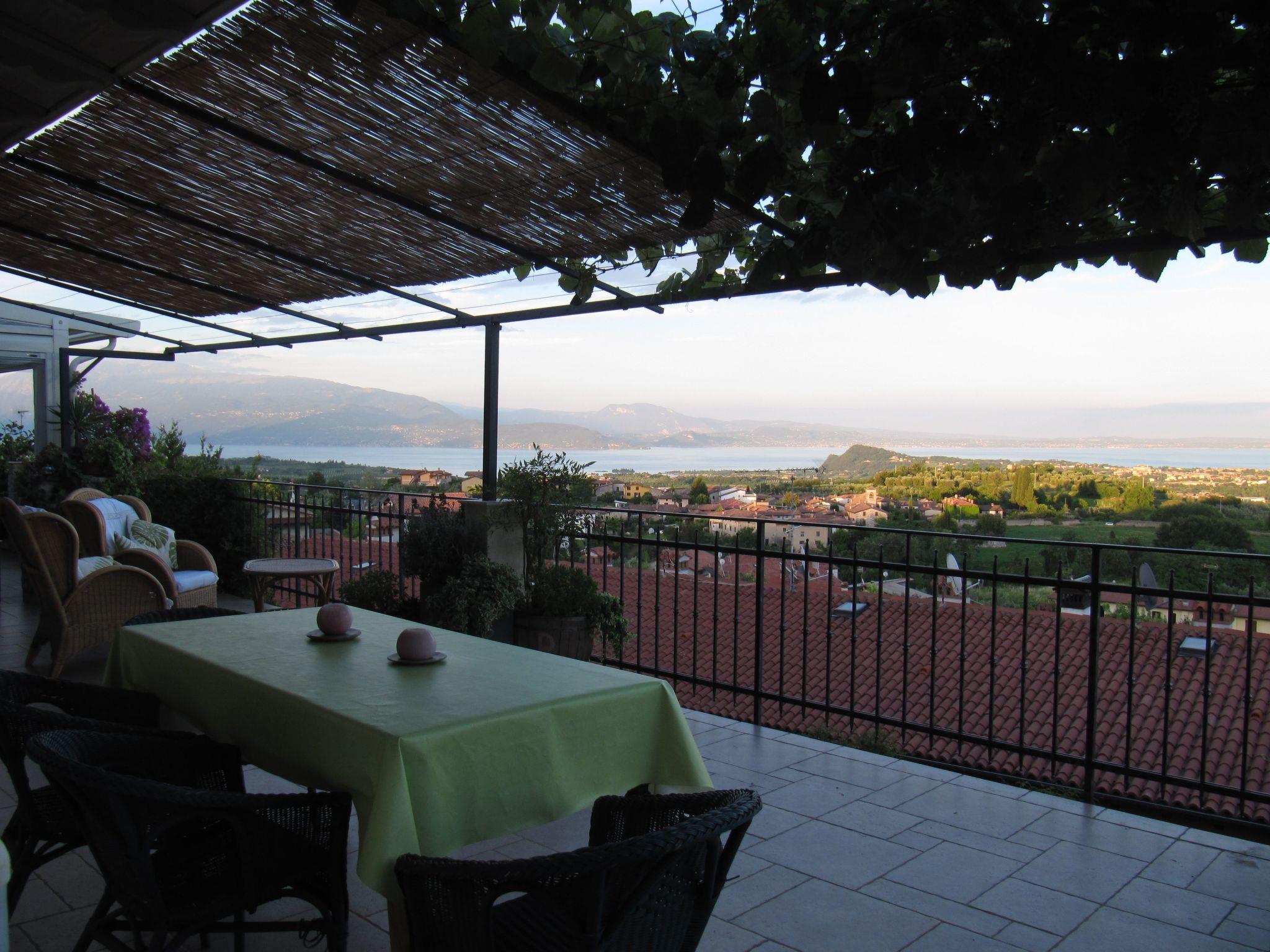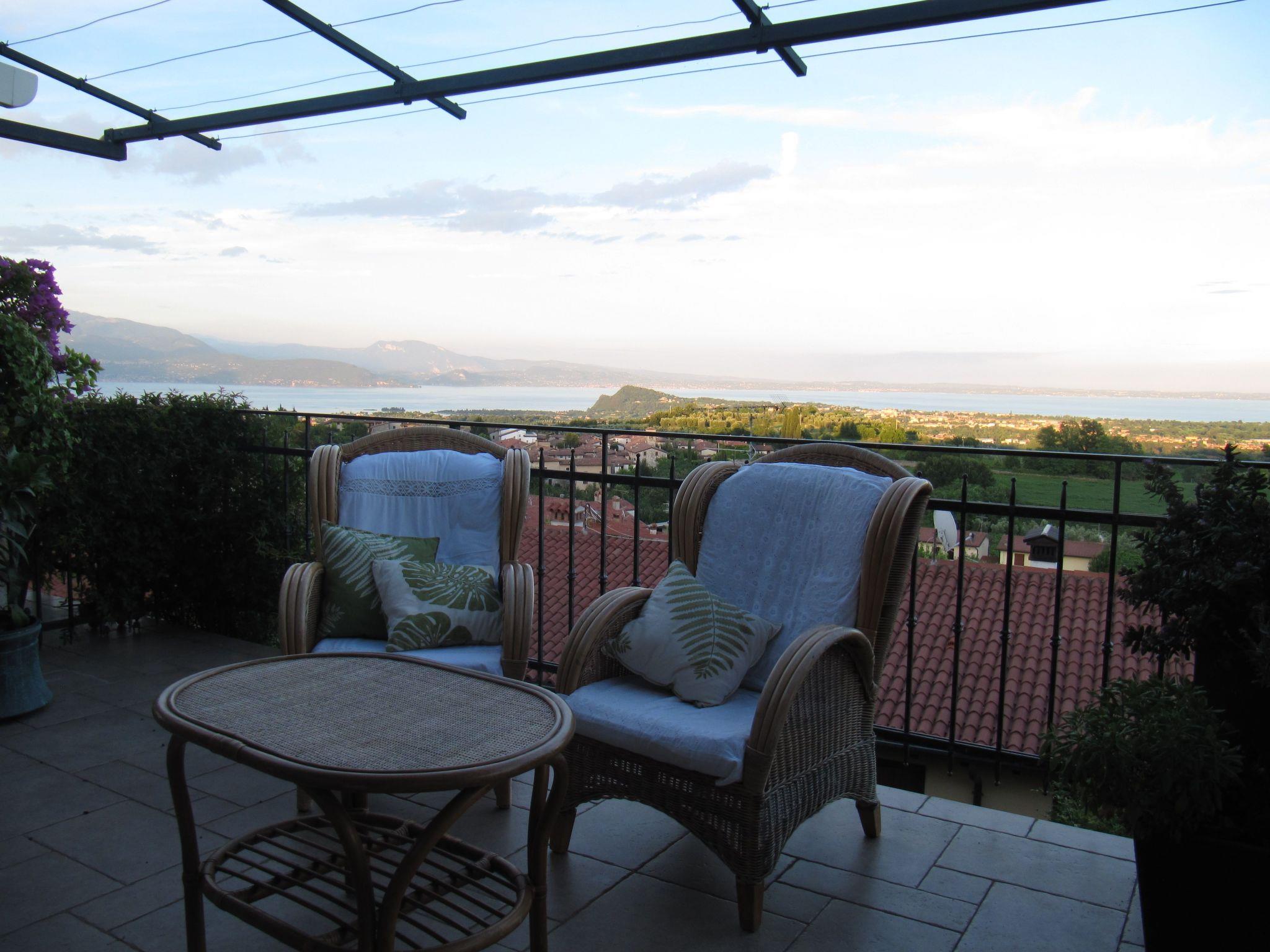 The flat "TERRAZZE SUL GARDA" is fantastic and unique; it is located on the first and last floor of a two-storey house, is accessed by a separate entrance and is surrounded by a large and well-kept garden. The flat is very bright thanks to the high wooden ceilings and large windows. It measures about 100 sqm and opens onto a terrace of about 40 sqm, from which one can enjoy one of the most incredible views of Lake Garda and the Valtenesi hills. The flat enjoys modern comforts such as a dishwasher, TV, heating, internet, etc., but is furnished with period furniture. It consists of 2 double bedrooms with parquet flooring, from which there is access to a further terrace overlooking the surrounding hills; both have a private bathroom with shower and bidet. A large living room with a fully equipped kitchenette and a relaxation area with a double sofa bed opens onto the terrace of over 40 sq m, equipped for outdoor dining. The flat is ideal for families of 5/6 people or for two couples.