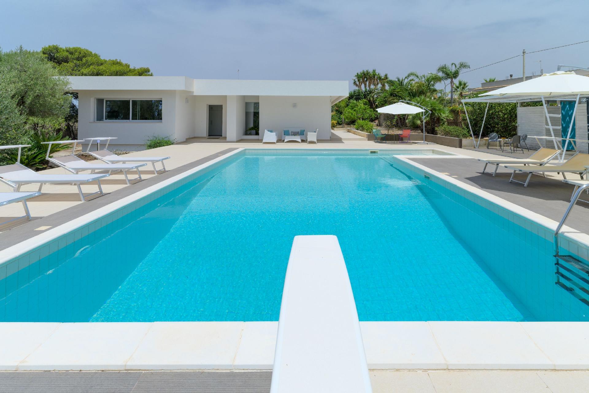 It has a large private swimming pool with diving board, surrounded by greenery, with a large solarium furnished with sun loungers.