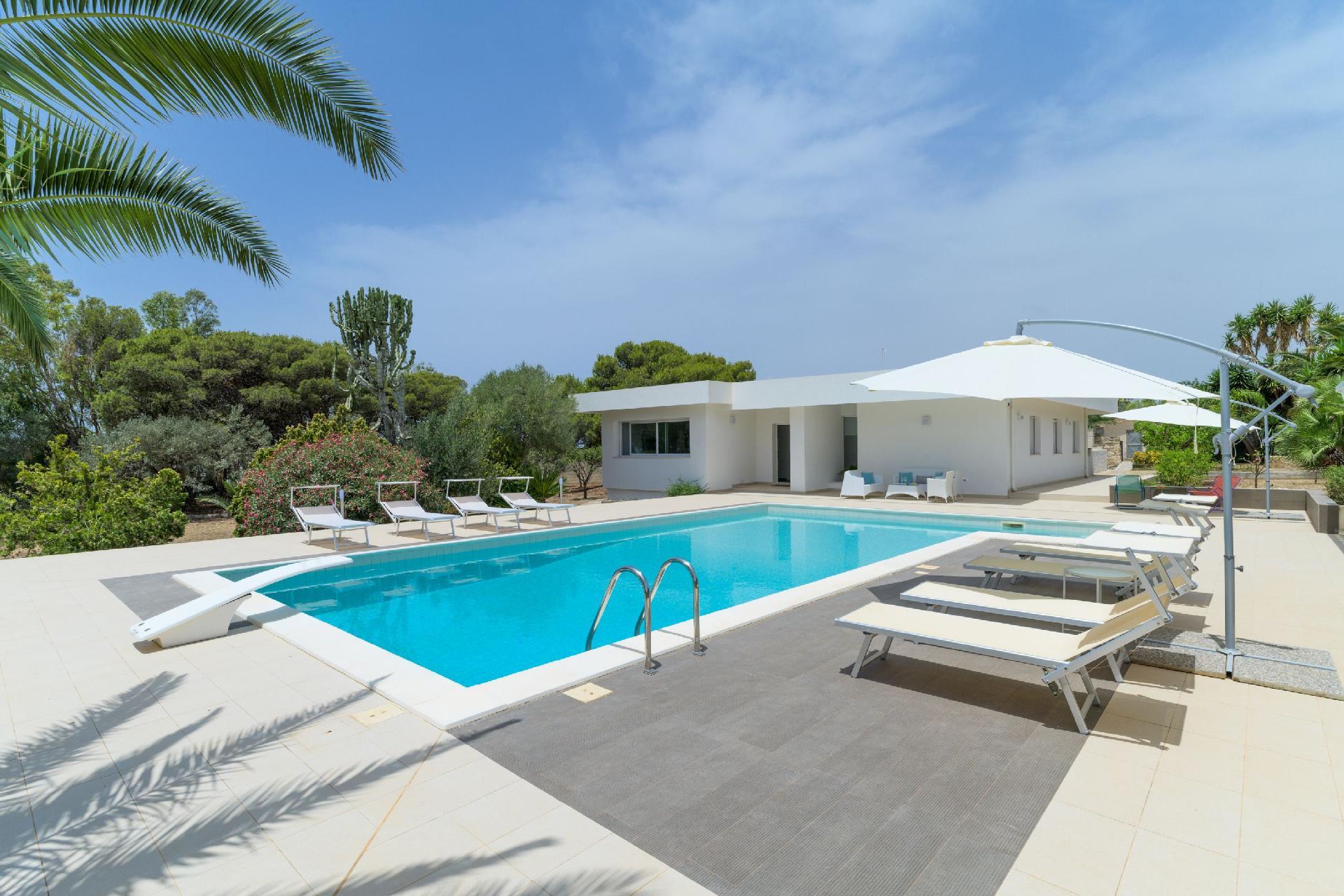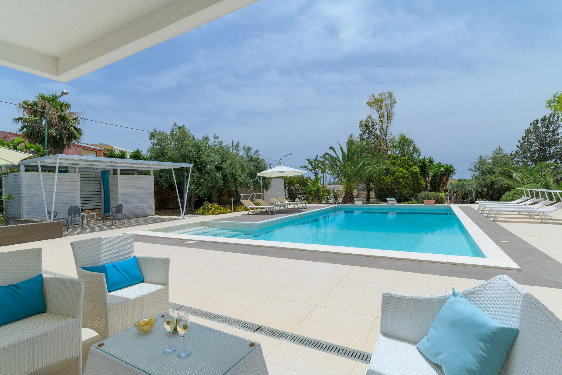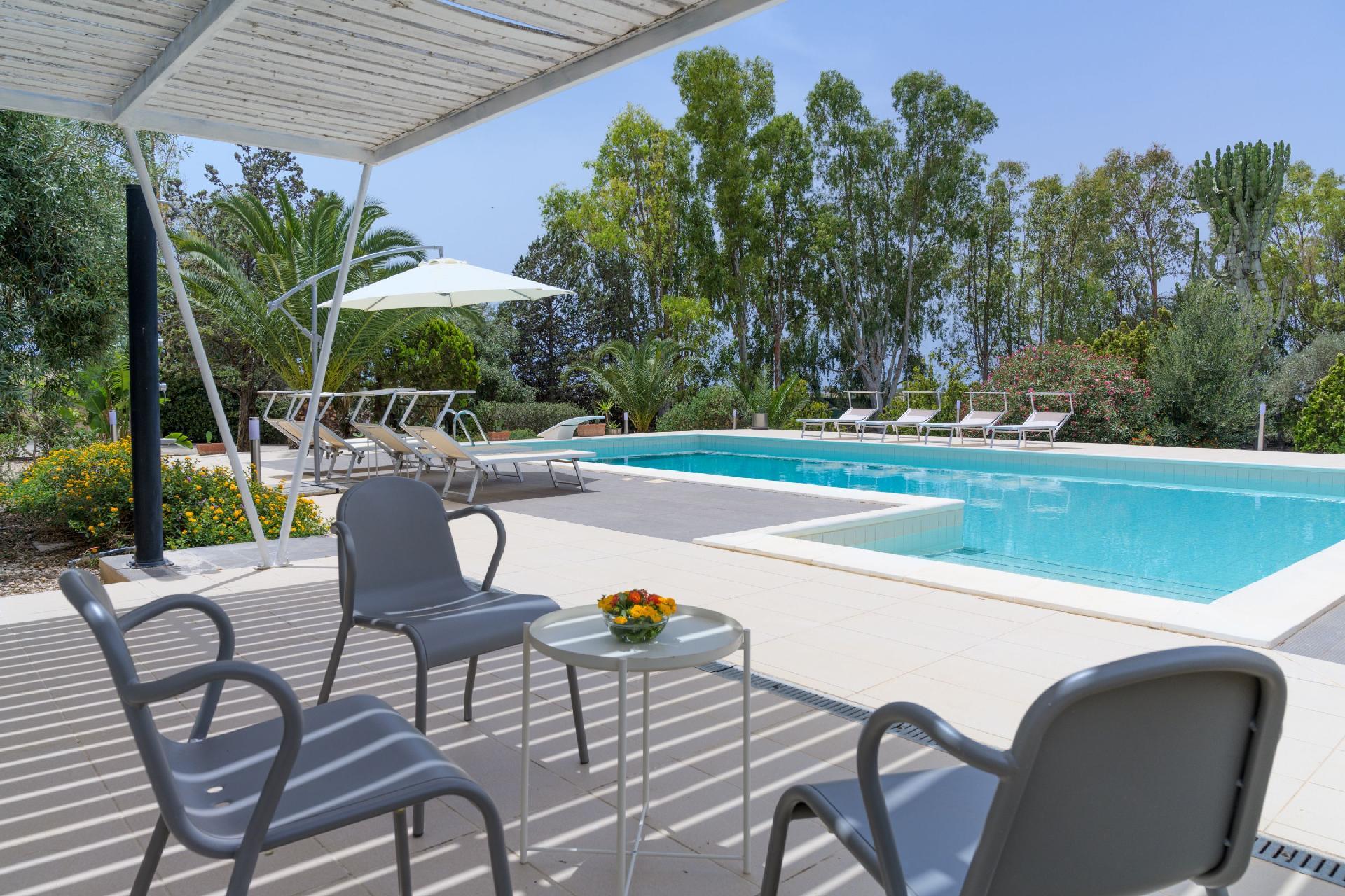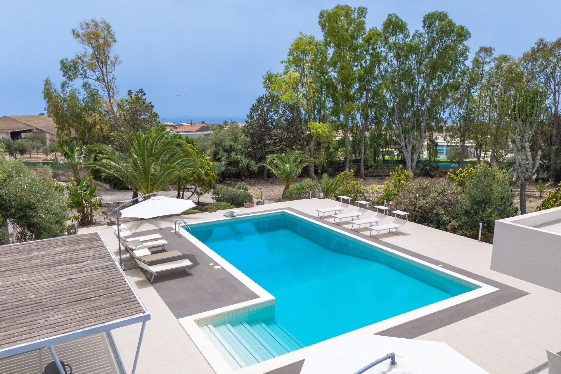 Pool, sea and exterior of villa Thalìa in Marina di Ragusa