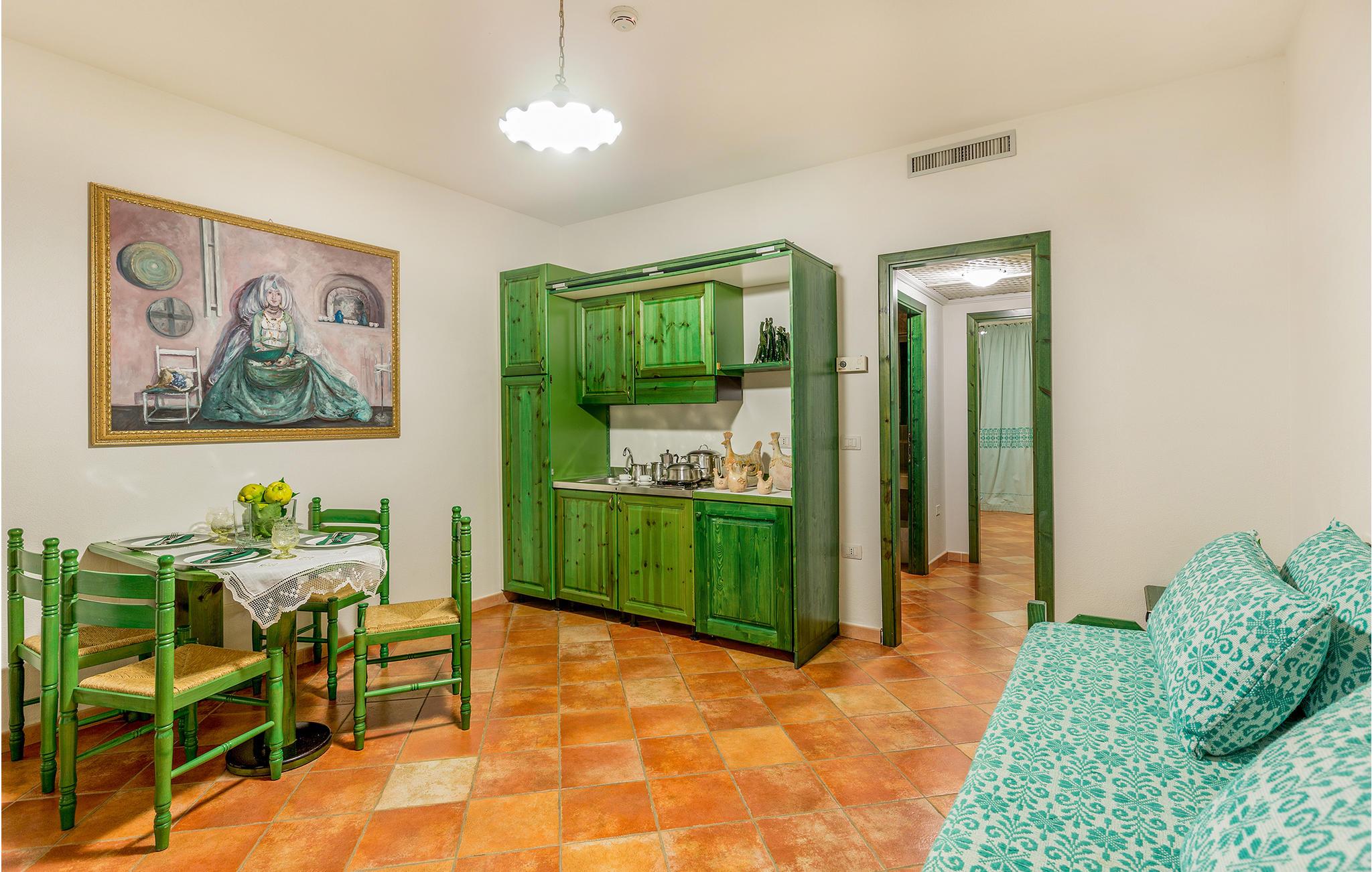 Denne fargerike ferieleiligheten med flisgulv tilbyr deg et koselig oppholdsrom med kjøkken, spisestue, stue og soverom. I tillegg kan du sette deg godt til rette i solsengene ved det felles utendørsbassenget og bli brun.