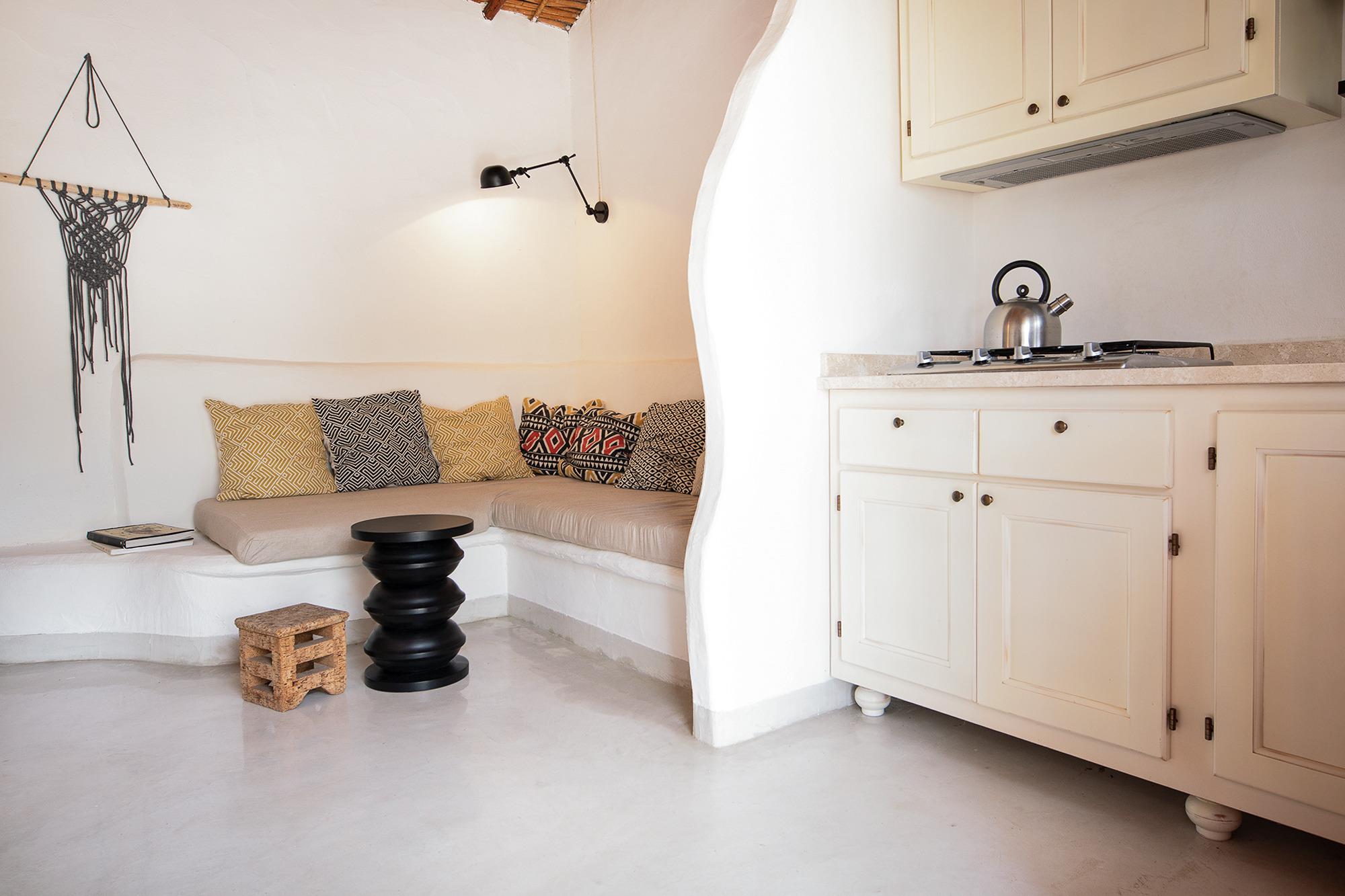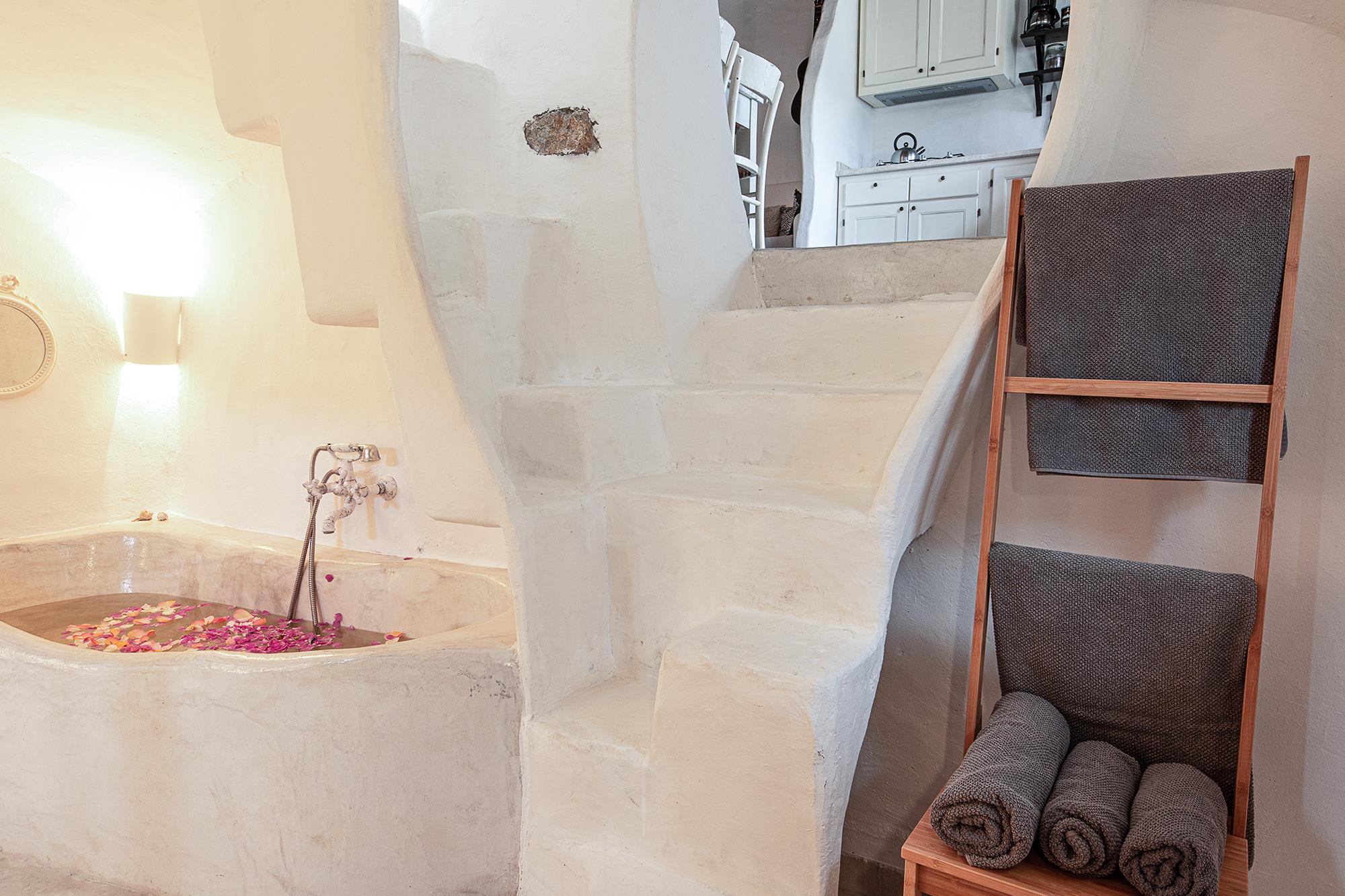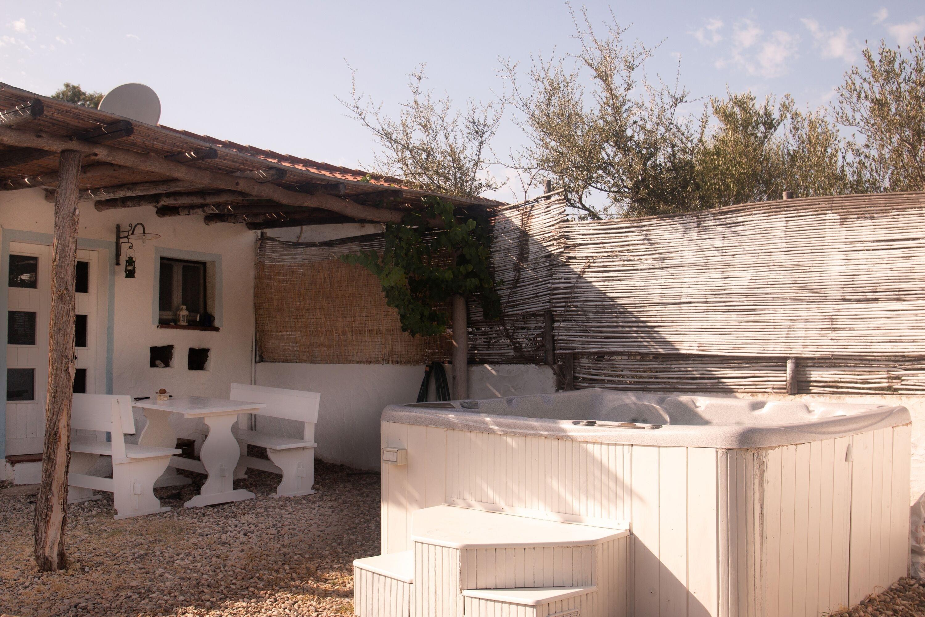 Das kleine Haus erstreckt sich auf drei Ebenen, mit einer Deckenhöhe von etwa 3 Metern im Erdgeschoss und 2 Metern in den anderen Räumen. Das Boutique Ferienhaus verfügt über helle Wände, Zementböden, Schilfdecken und ein einzigartiges Badezimmer, bei dem ihr euch endlich trauen könnt auf die Wände zu schmieren. Im Sommer könnt ihr reife Feigen im Garten pflücken, im Frühjahr ein gutes Buch am kleinen Bach lesen. Ein besonderes Highlight ist der beheizte Außen-SPA-POOL.