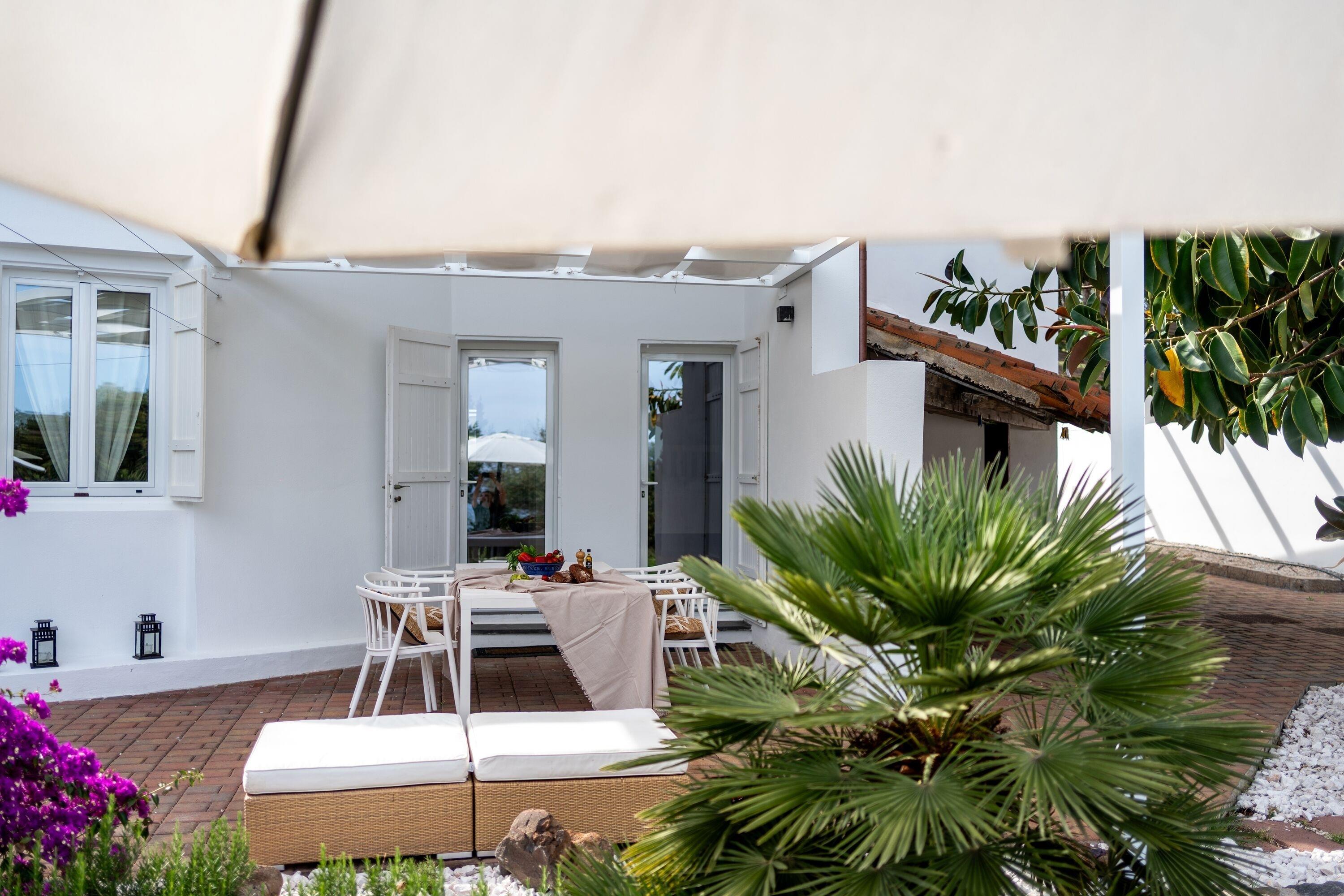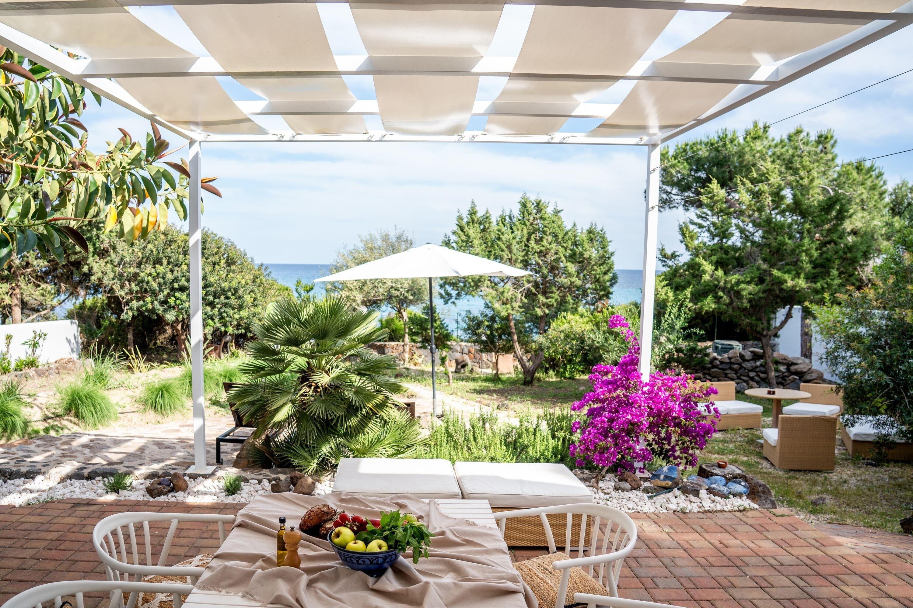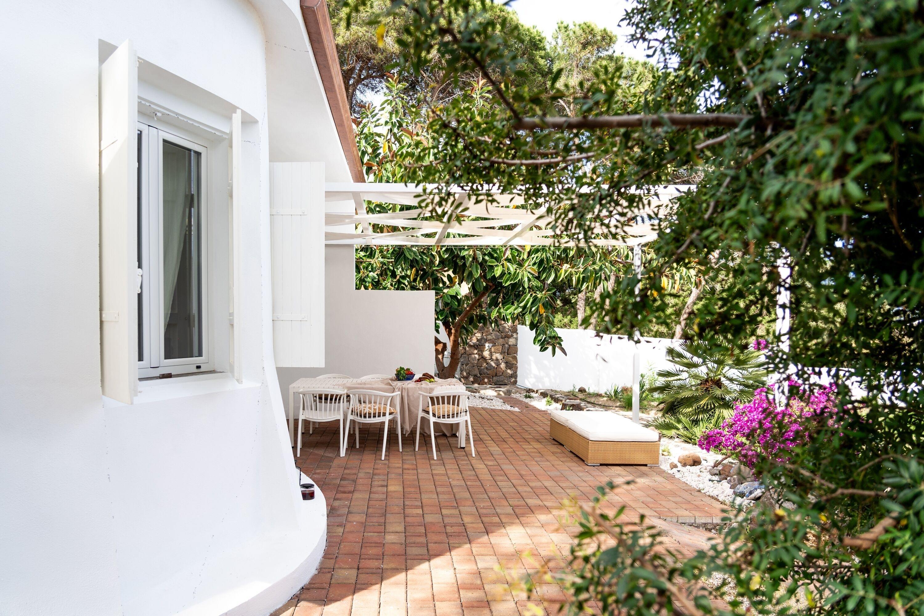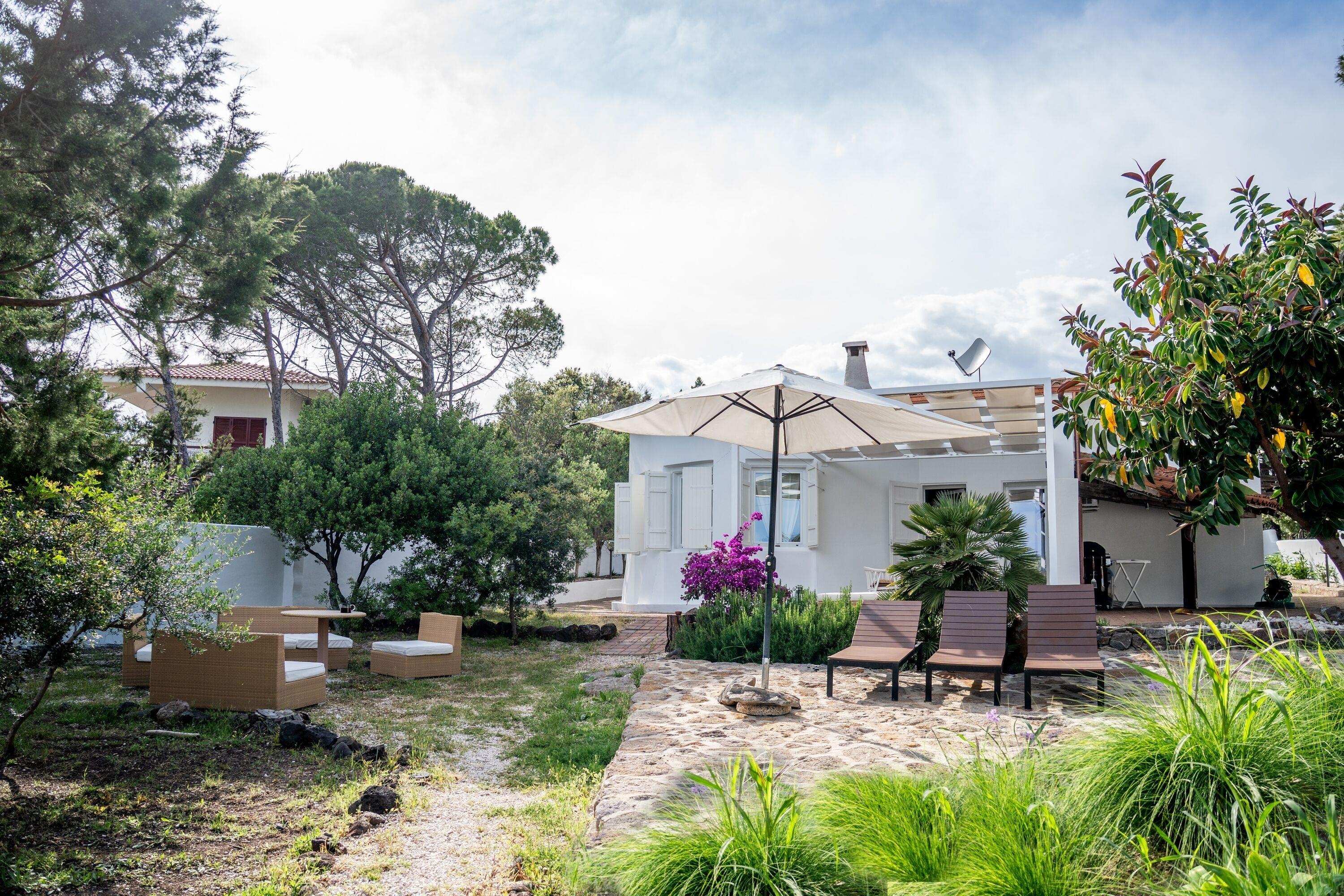 Das Haus wurde in den 80er Jahren erbaut und bietet Platz für bis zu sechs Personen. Der Wohnraum mit offener Küche und gemauertem Sofa hat eine abgerundete Form und erinnert an die Costa Smeralda. Das maritime Interieur sorgt für eine entspannte Atmosphäre. Das große Master-Schlafzimmer verfügt über ein Doppelbett, einen Wandschrank, ein eigenes Badezimmer und direkten Zugang zum Garten mit Meerblick. Das zweite Schlafzimmer hat ein französisches Doppelbett, aber keinen Schrank. Das dritte Schlafzimmer ist schmal und hat zwei Einzelbetten sowie einen Wandschrank. Auch von diesem Zimmer aus gelangt man direkt in den Garten. Ein zweites Badezimmer mit Dusche befindet sich im Flur.