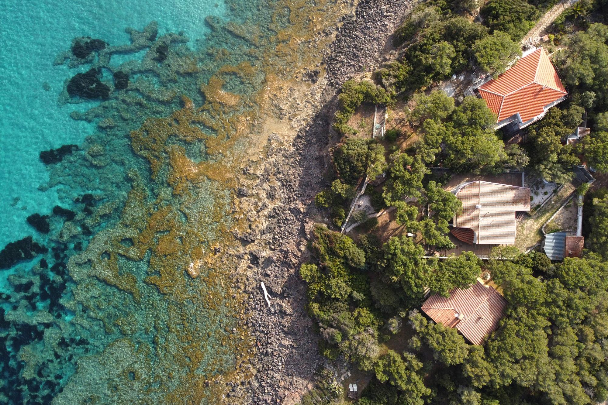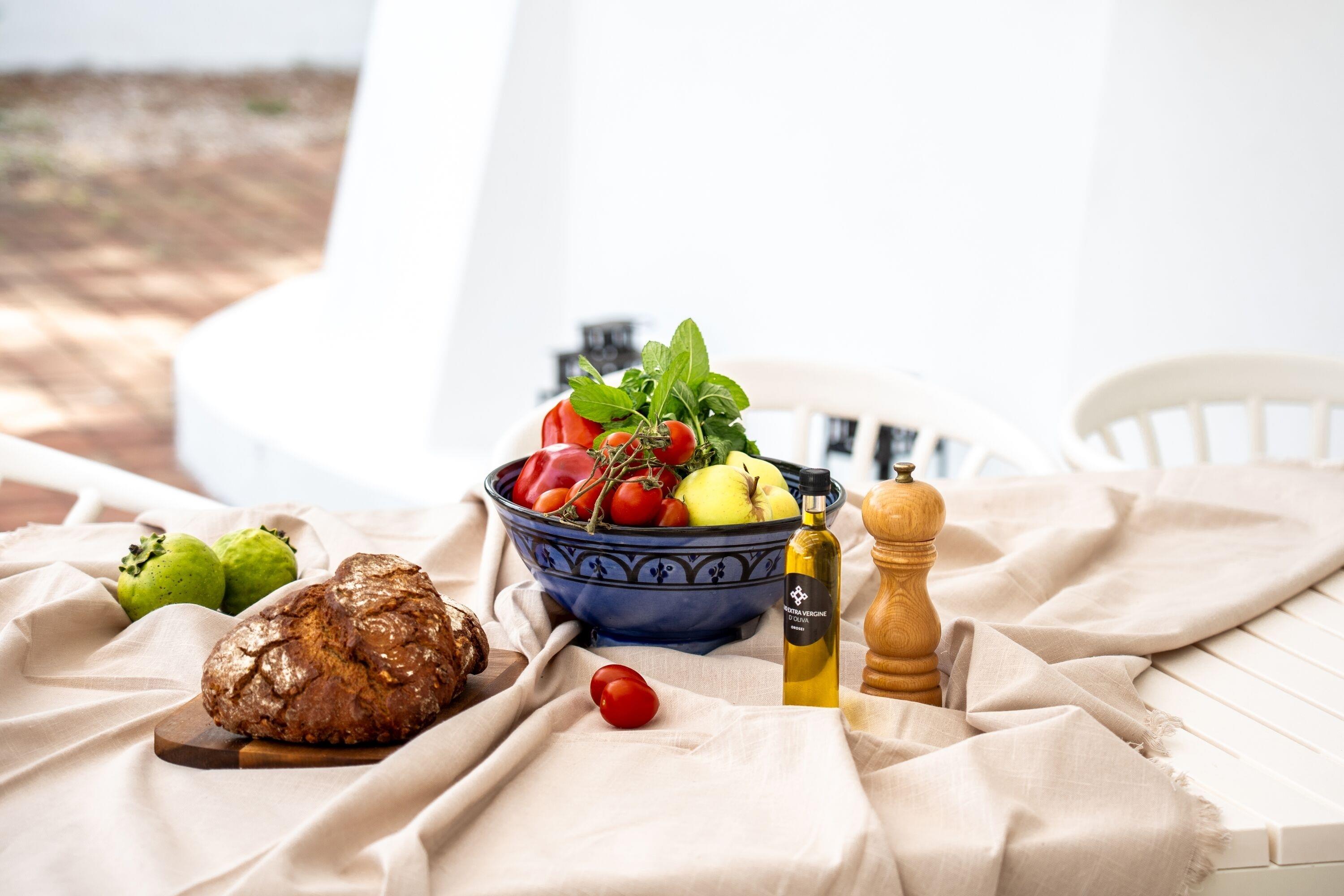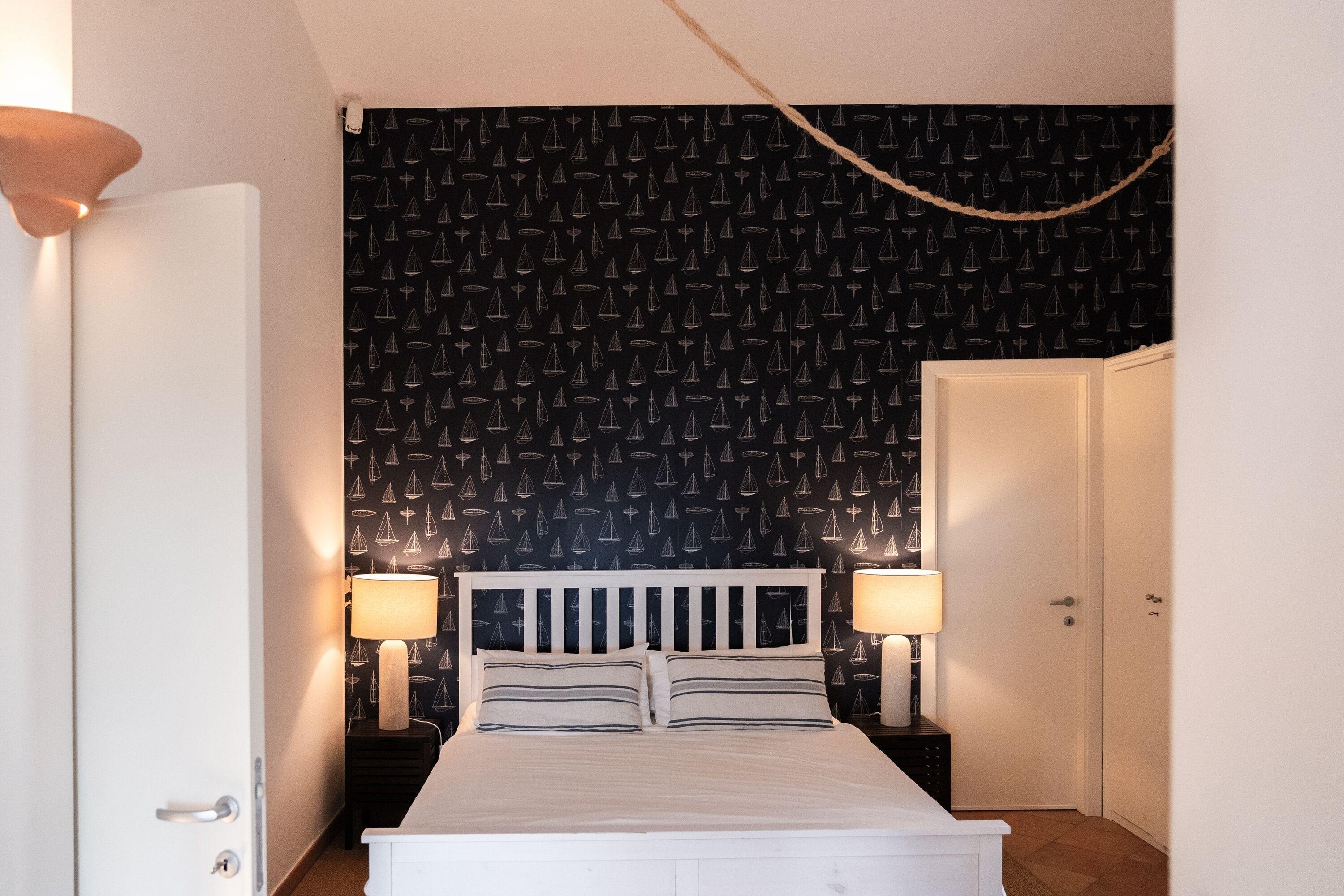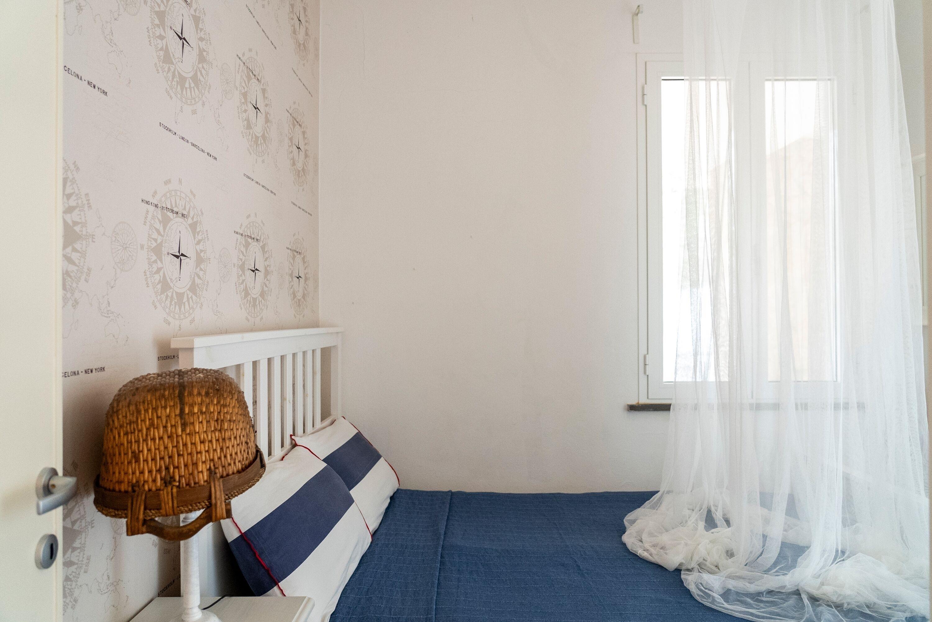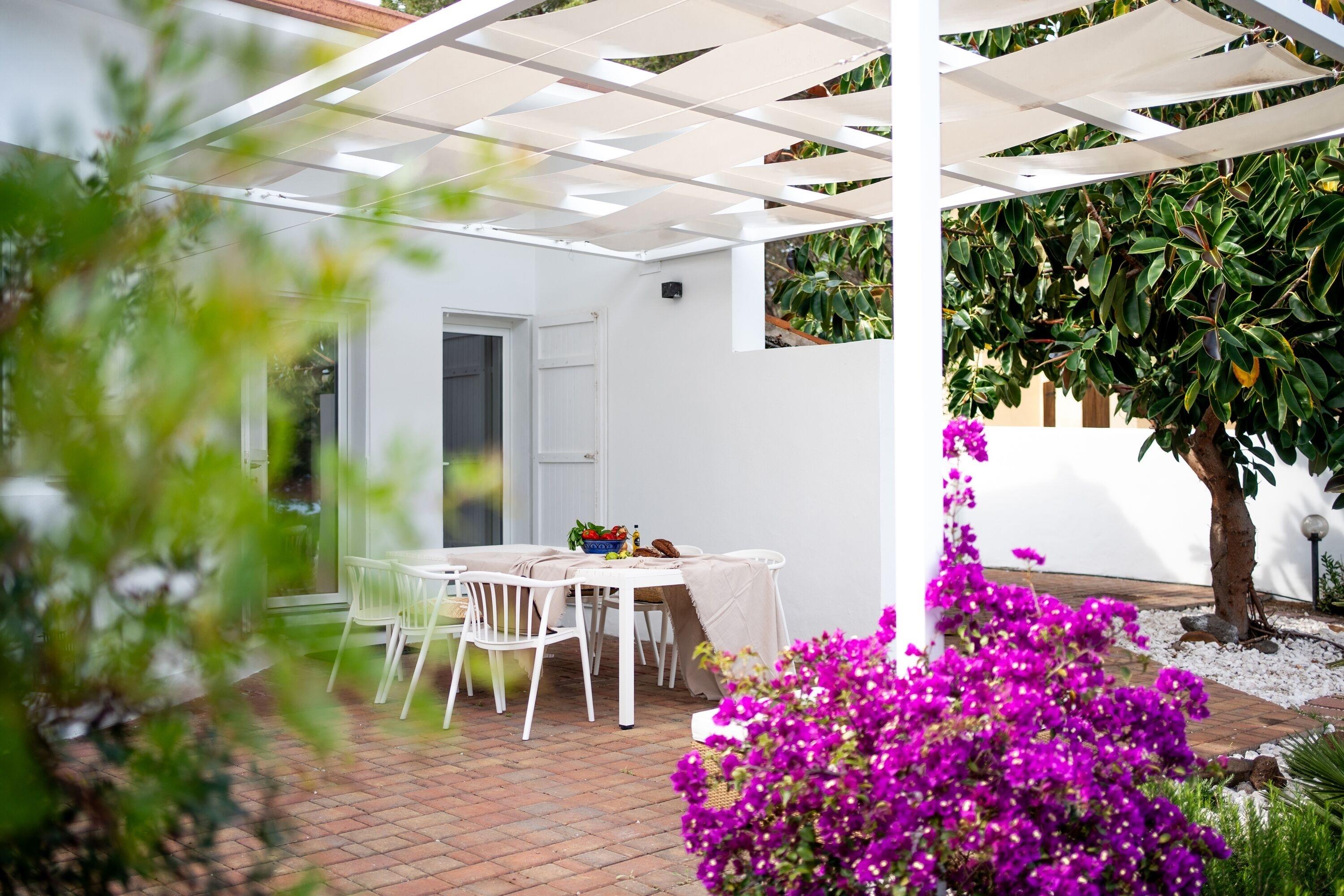 Das Haus wurde in den 80er Jahren erbaut und bietet Platz für bis zu sechs Personen. Der Wohnraum mit offener Küche und gemauertem Sofa hat eine abgerundete Form und erinnert an die Costa Smeralda. Das maritime Interieur sorgt für eine entspannte Atmosphäre. Das große Master-Schlafzimmer verfügt über ein Doppelbett, einen Wandschrank, ein eigenes Badezimmer und direkten Zugang zum Garten mit Meerblick. Das zweite Schlafzimmer hat ein französisches Doppelbett, aber keinen Schrank. Das dritte Schlafzimmer ist schmal und hat zwei Einzelbetten sowie einen Wandschrank. Auch von diesem Zimmer aus gelangt man direkt in den Garten. Ein zweites Badezimmer mit Dusche befindet sich im Flur.
