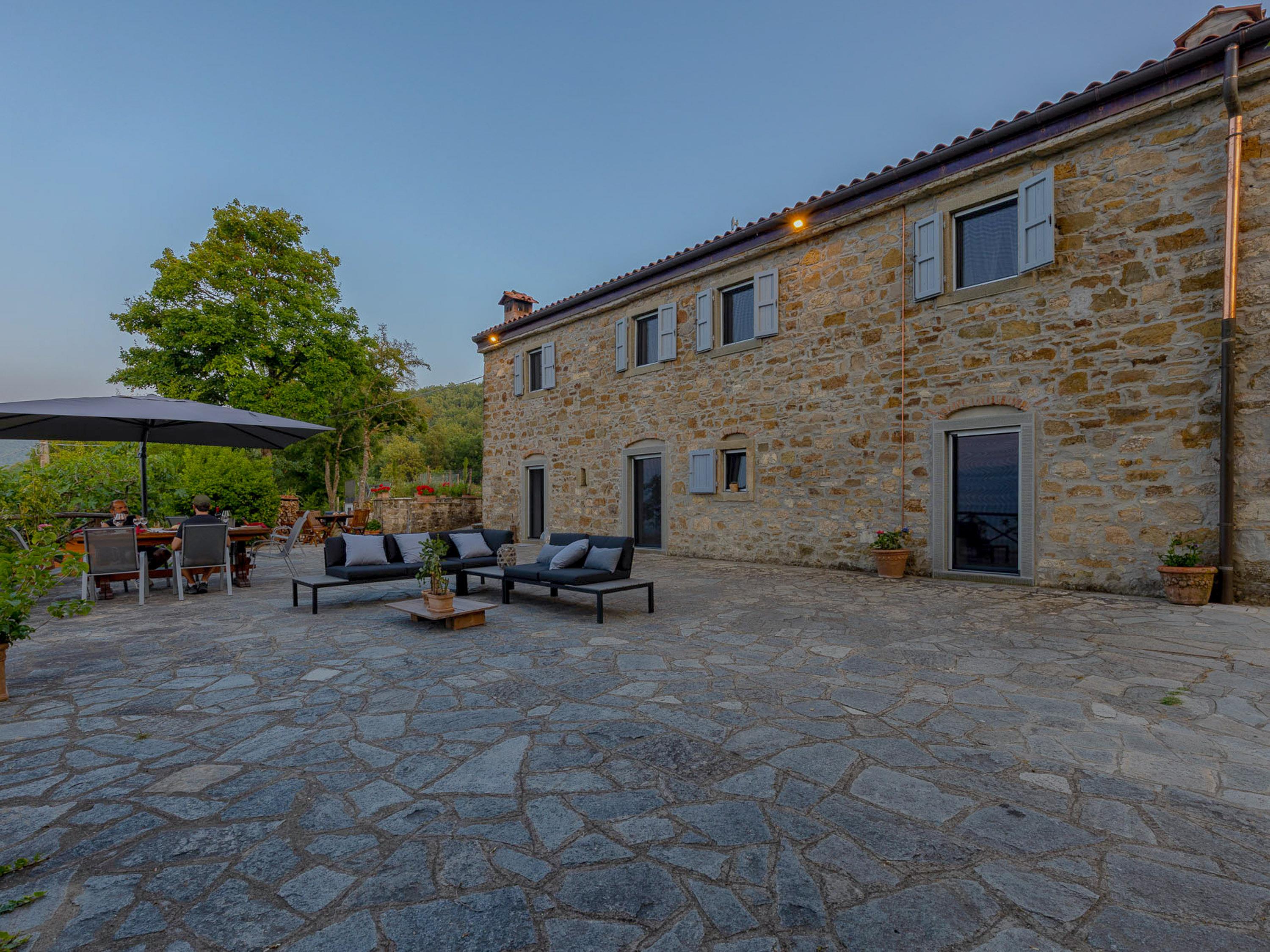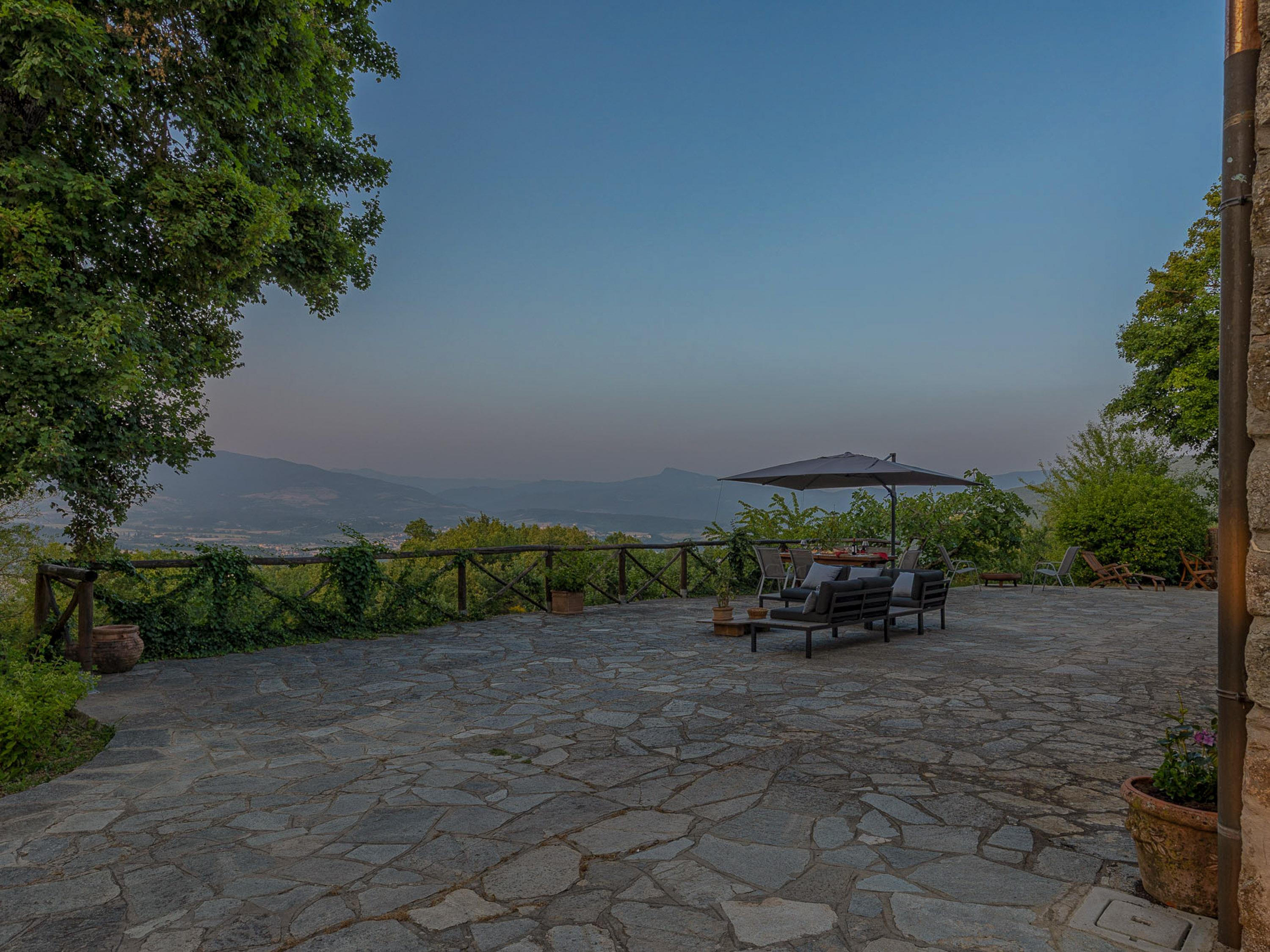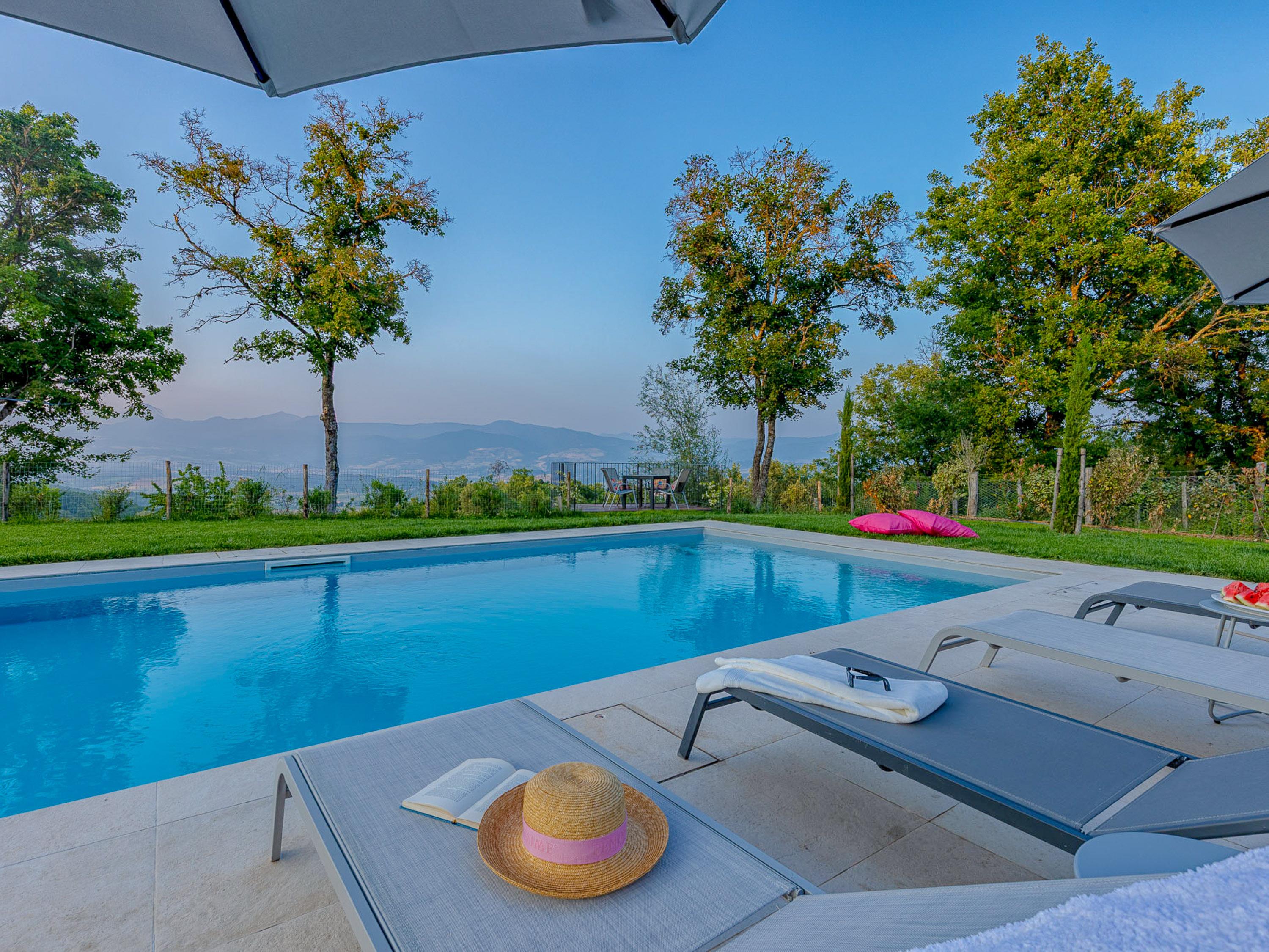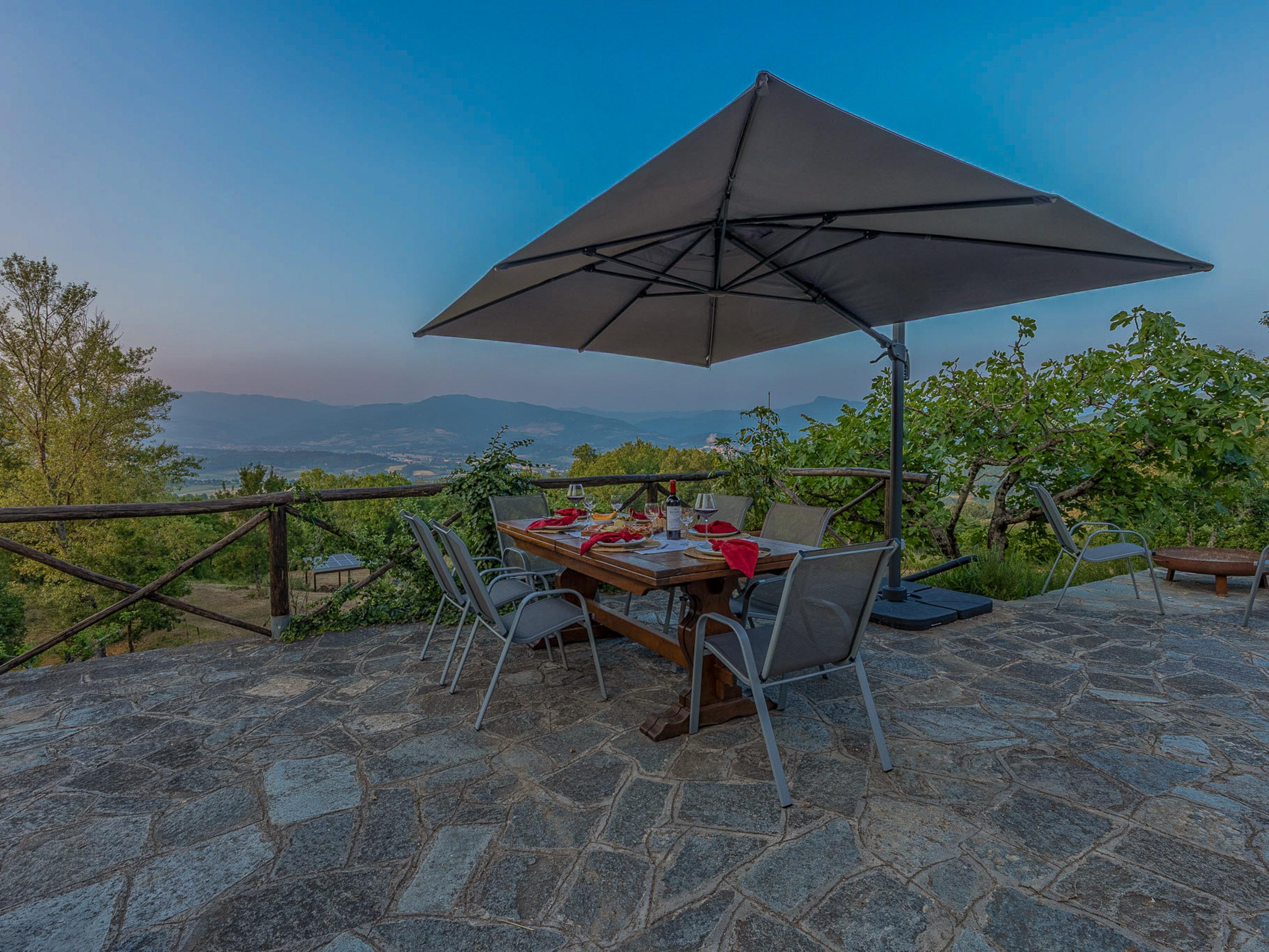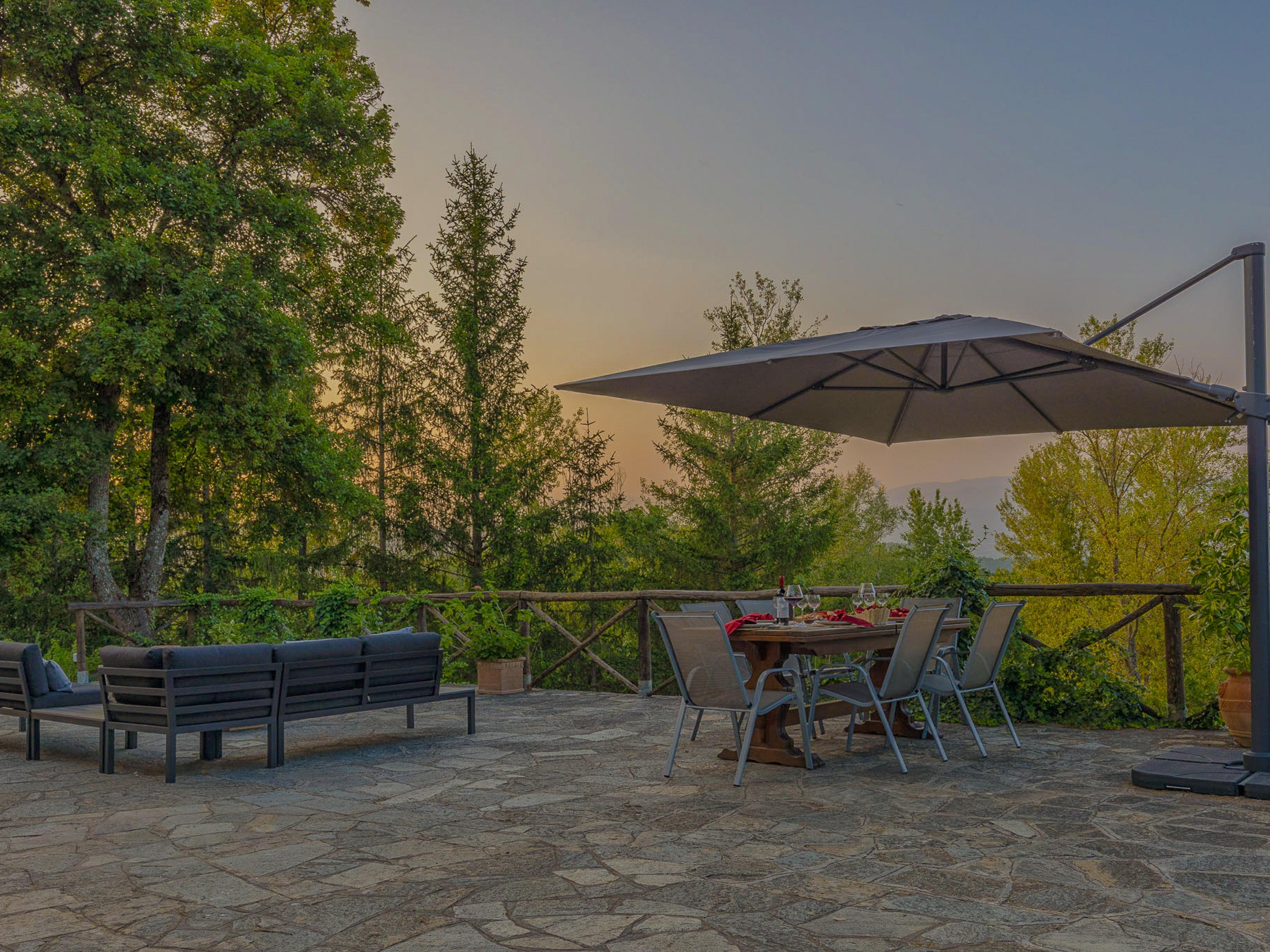 Ein großer Tisch mit integriertem Sonnenschutz lädt Familie und Freunde ein, gesellige Grillabende zu verbringen. Der Grillbereich ist optimal ausgestattet, damit Sie köstliche Speisen zaubern können, während Sie die frische Luft und die herrlichen Ausblicke in vollen Zügen genießen. Die Sitzlounge bietet zusätzlichen Raum für Entspannung und gesellige Abende. An einem ruhigen Abend können Sie hier mit einem Glas Wein in der Hand den Sonnenuntergang beobachten, während die sanften Hügel der Toskana im Hintergrund leuchten.