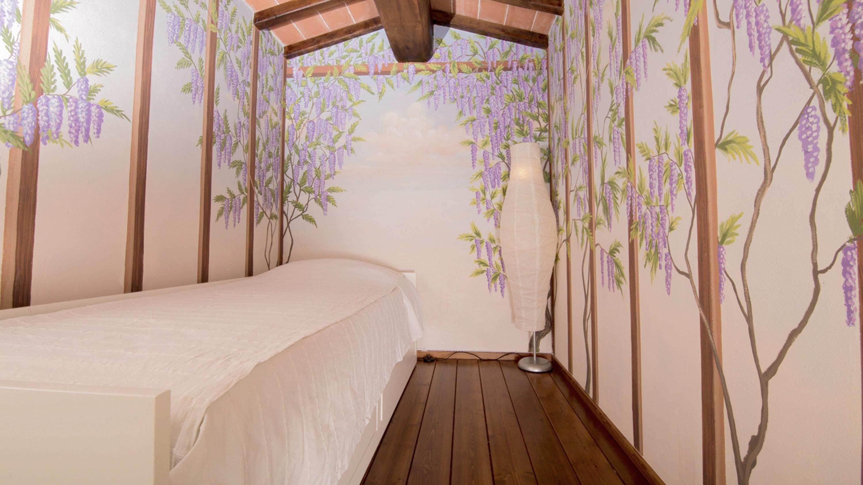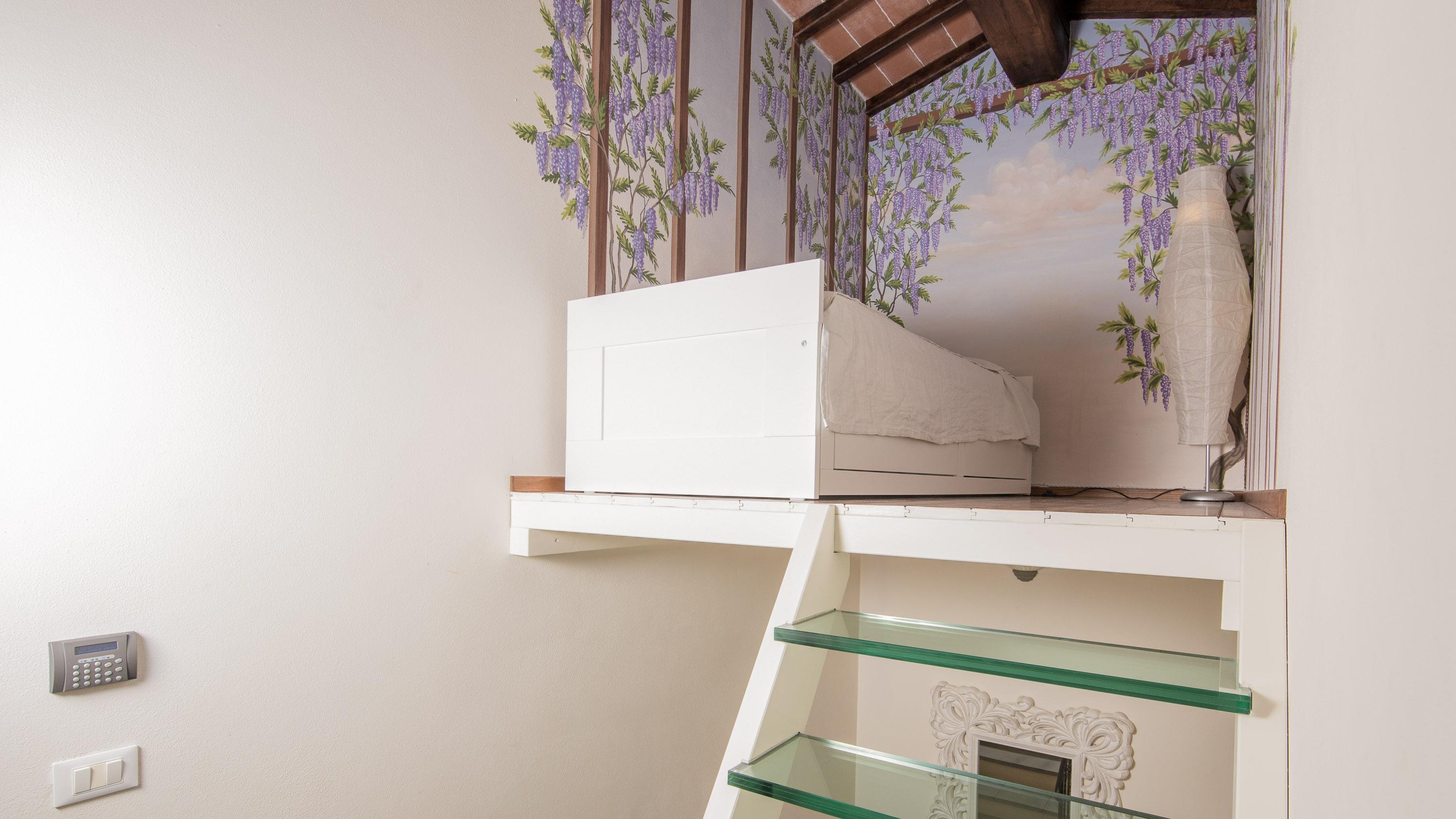 Über eine Innentreppe gelangen Sie in den ersten Stock, wo ein weiteres Doppelschlafzimmer und eine offene Mansarde mit einem Einzelbett für kleine Prinzen oder Prinzessinnen warten. Ein modernes Duschbad mit WC, Waschtisch und Bidet sorgt für zusätzlichen Komfort.