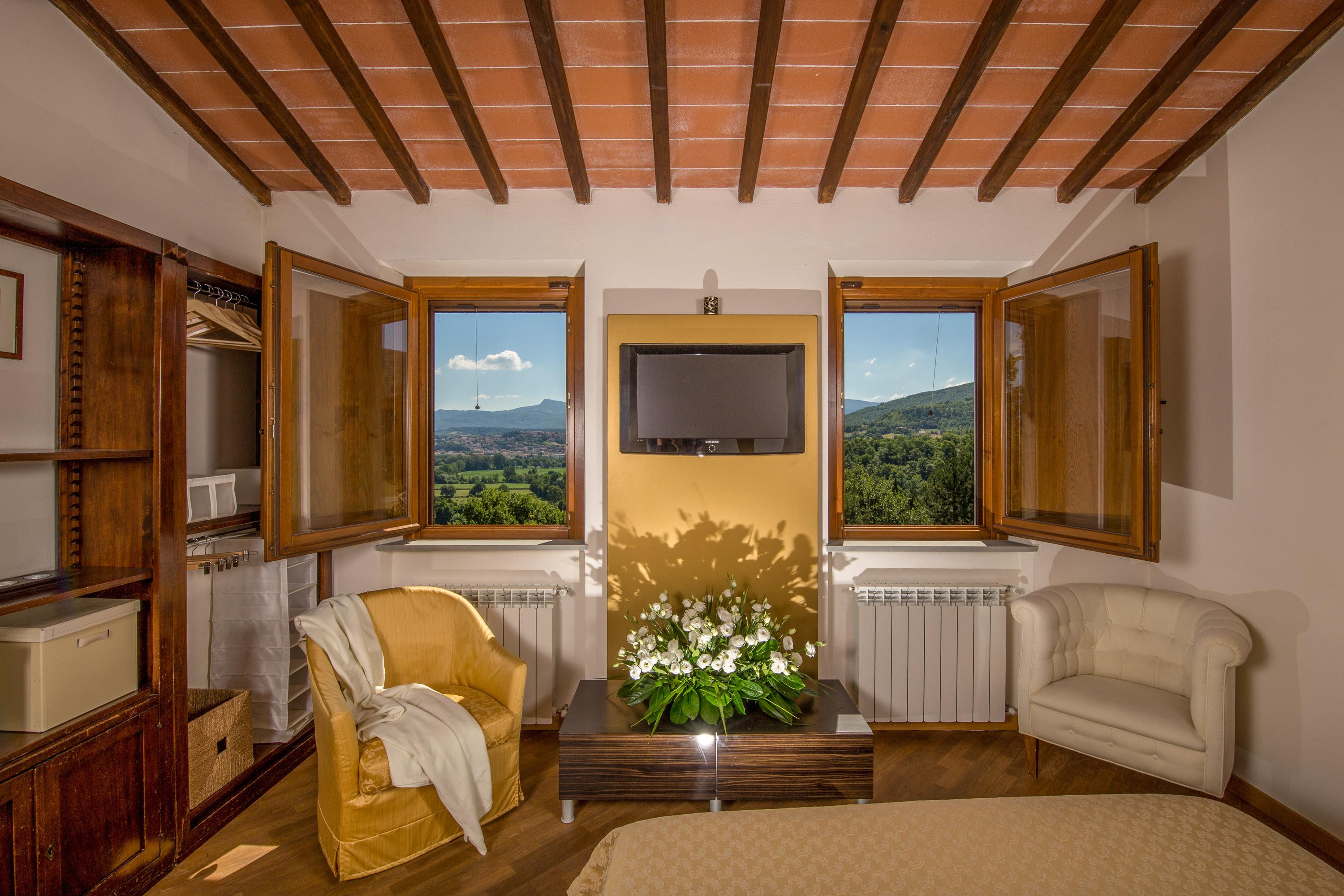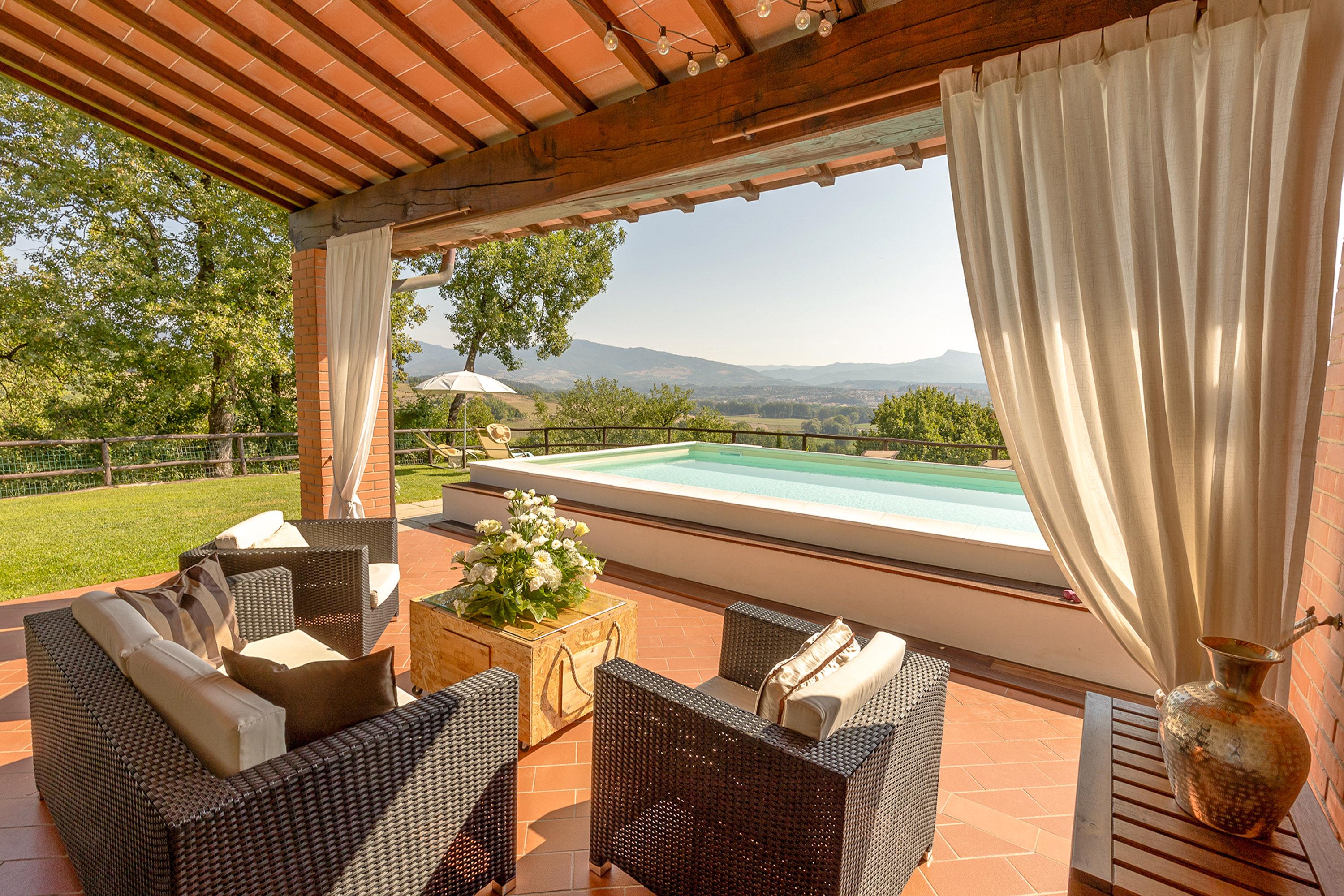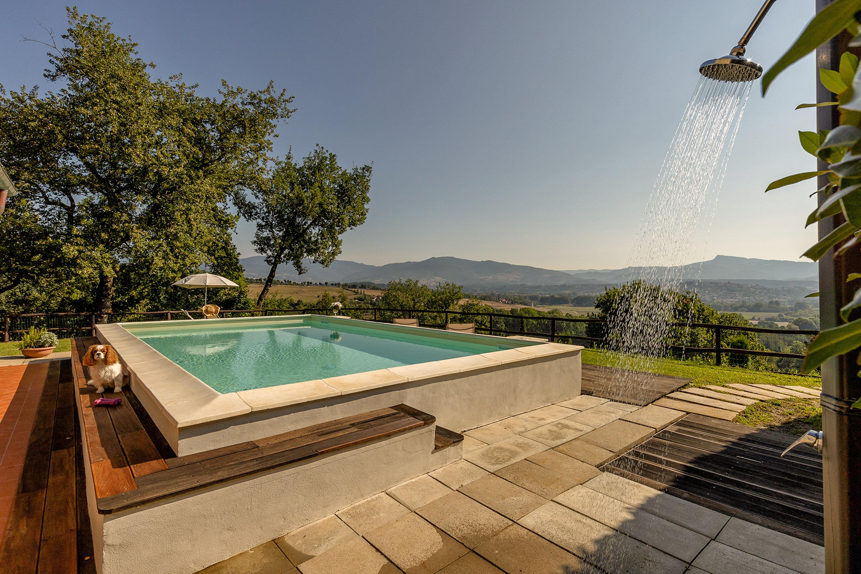 Das 1000 Quadratmeter große Grundstück ist von einem 1,20 Meter hohen Zaun umgeben und bietet einen geschlossenen Garten zur Alleinnutzung. Der neue Pool (8 x 4 Meter) mit Außendusche, ein Holzgrill und eine überdachte Loggia laden zum Verweilen ein. Ein großzügiger Carport mit E-Ladestation steht Ihnen für Ihr Fahrzeug zur Verfügung. Genießen Sie den traumhaften Ausblick auf Bibbiena, malerische Felder, endlose Wiesen und Olivenhaine – ein Erlebnis, das man einfach selbst erleben muss!