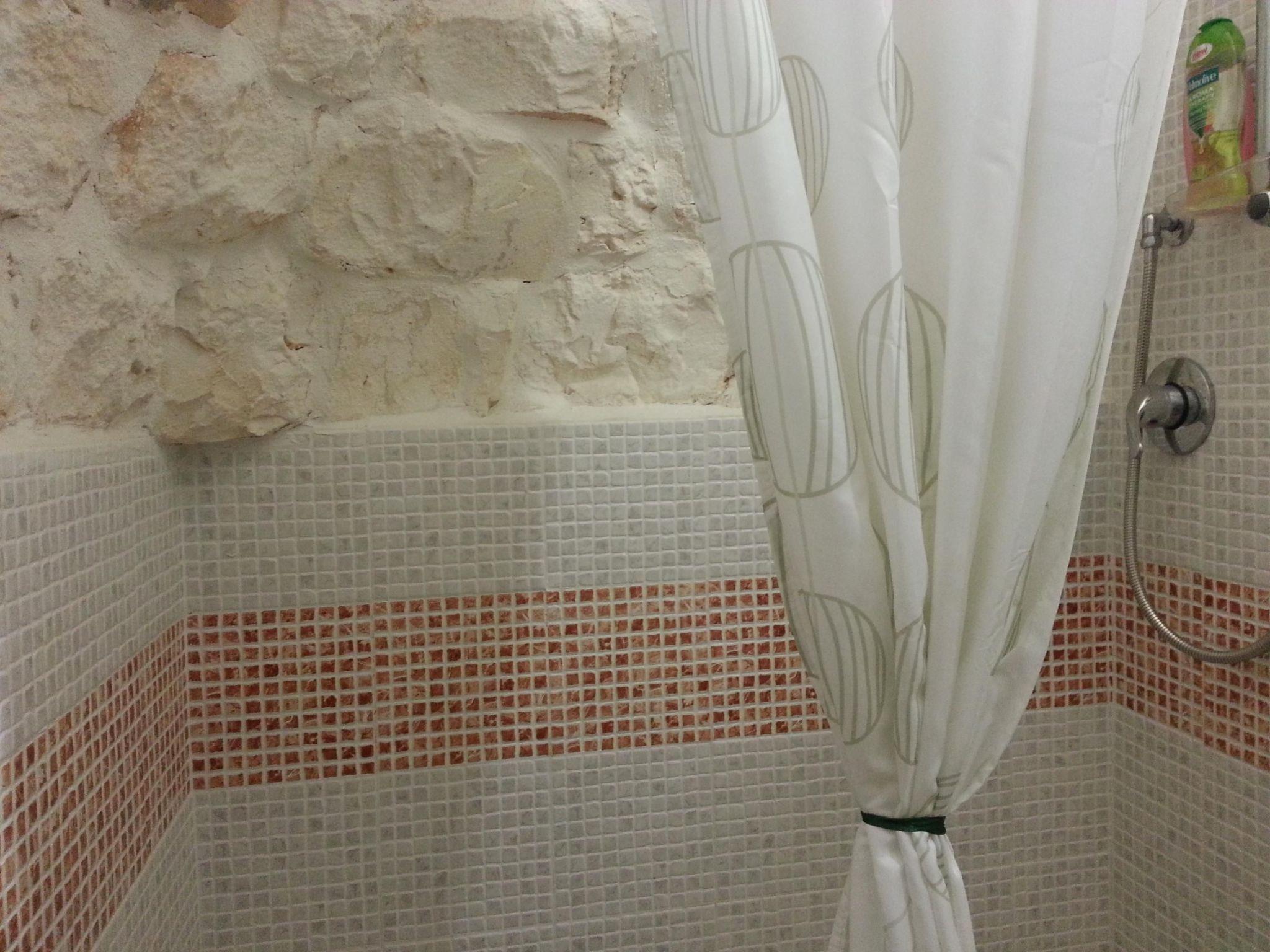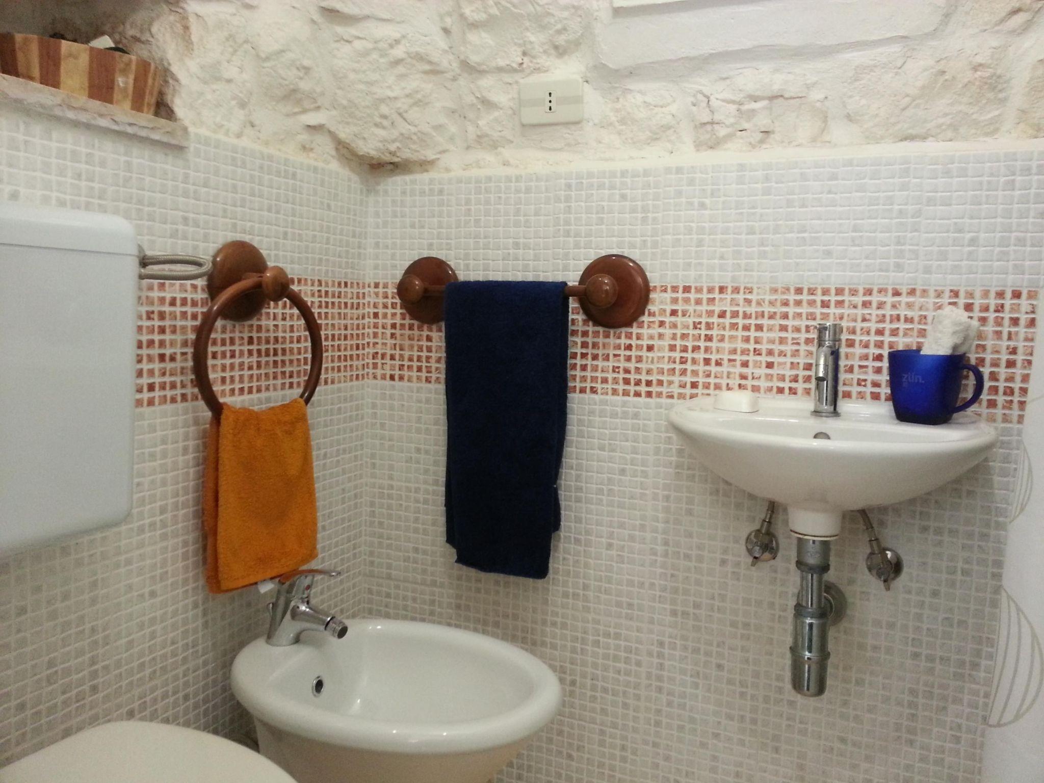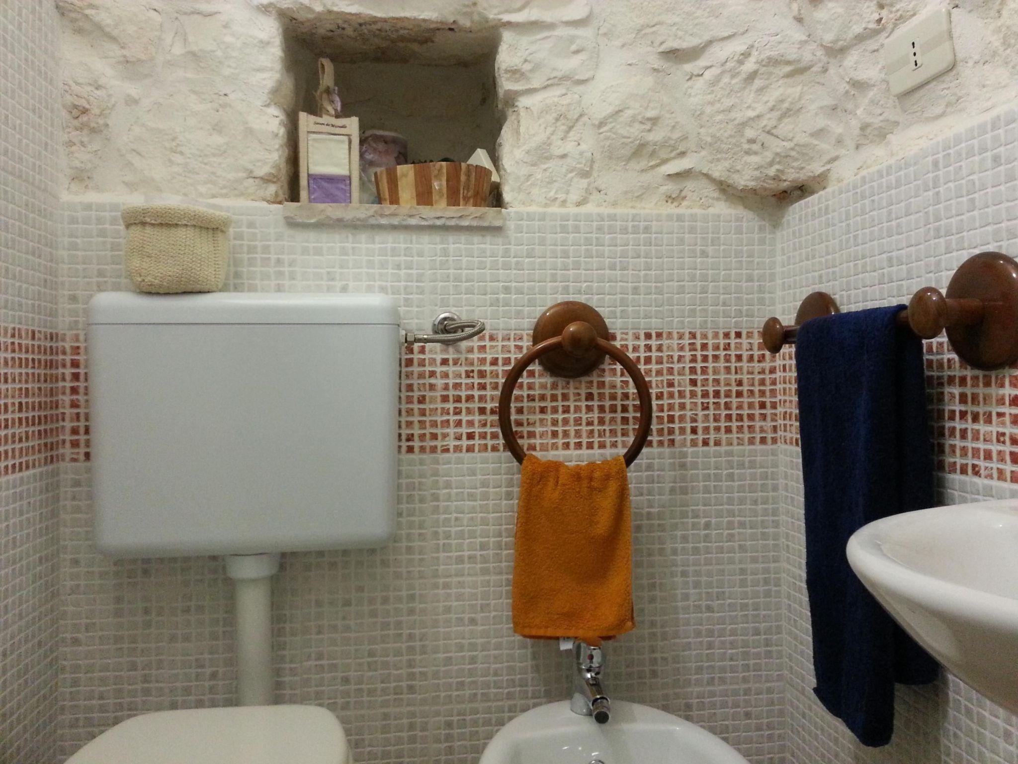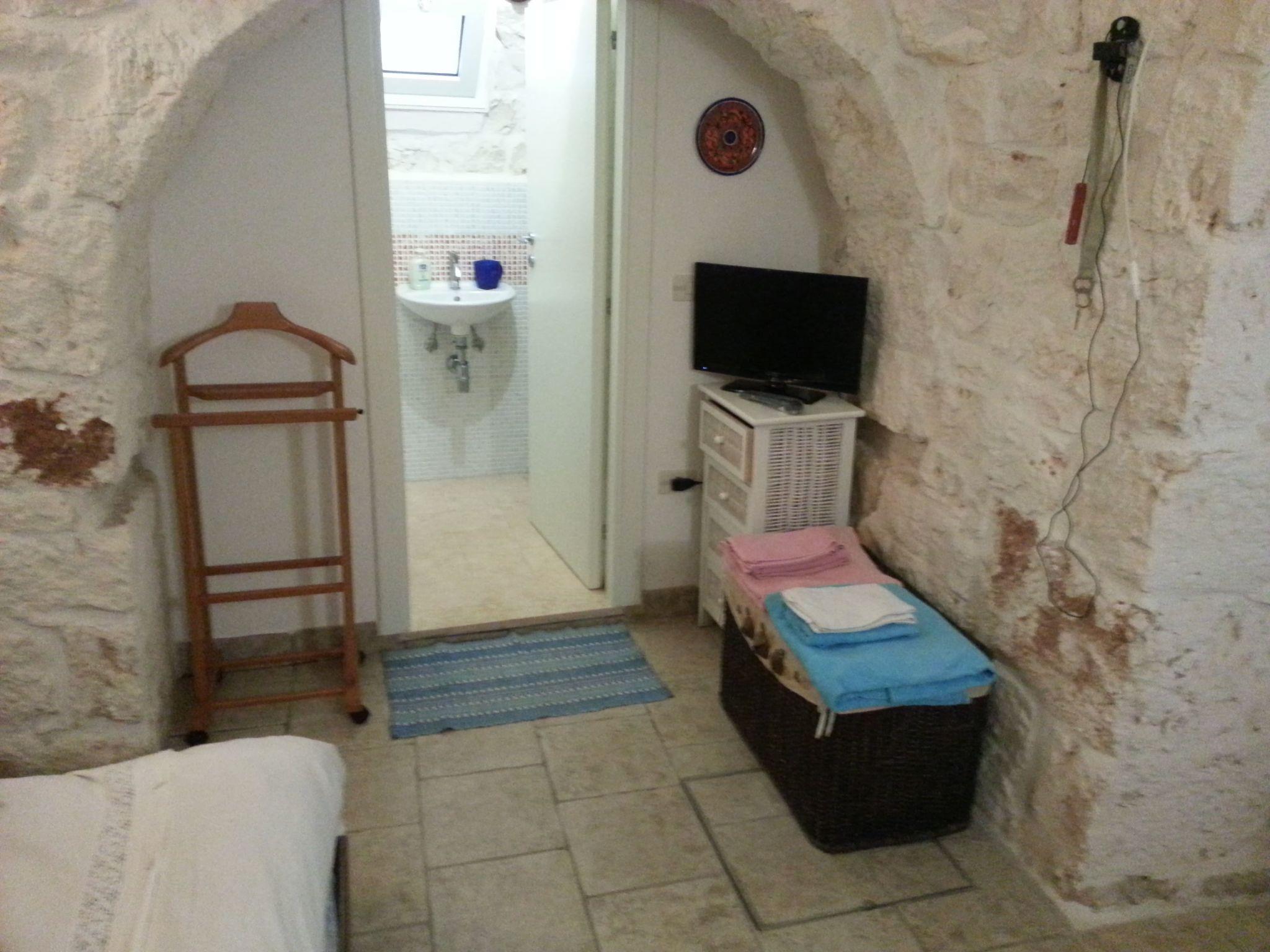 This trullo has recently been renovated and is therefore ideal for a couple's holiday. Given its rather small size, it is designed for a couple and is very romantic. The interior stone walls and ceilings create a very cosy and comfortable atmosphere and keep the ideal temperature inside even during the hottest hours of the Italian summer, without the need for air conditioning. The entrance leads directly into the trullo's living room, which is equipped with a table and chairs, a small sideboard, a wardrobe and a television with digital terrestrial television. The niche with the bed is on the left, while access to the bathroom is on the right. The bathroom is very special, equipped with all modern conveniences and with exposed stone walls. It is equipped with a shower and bidet. The trullo cannot be heated. There is no internet connection. A cot can be added on request.