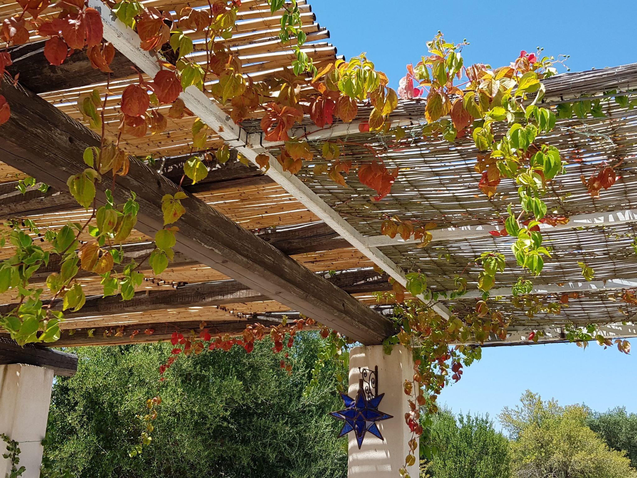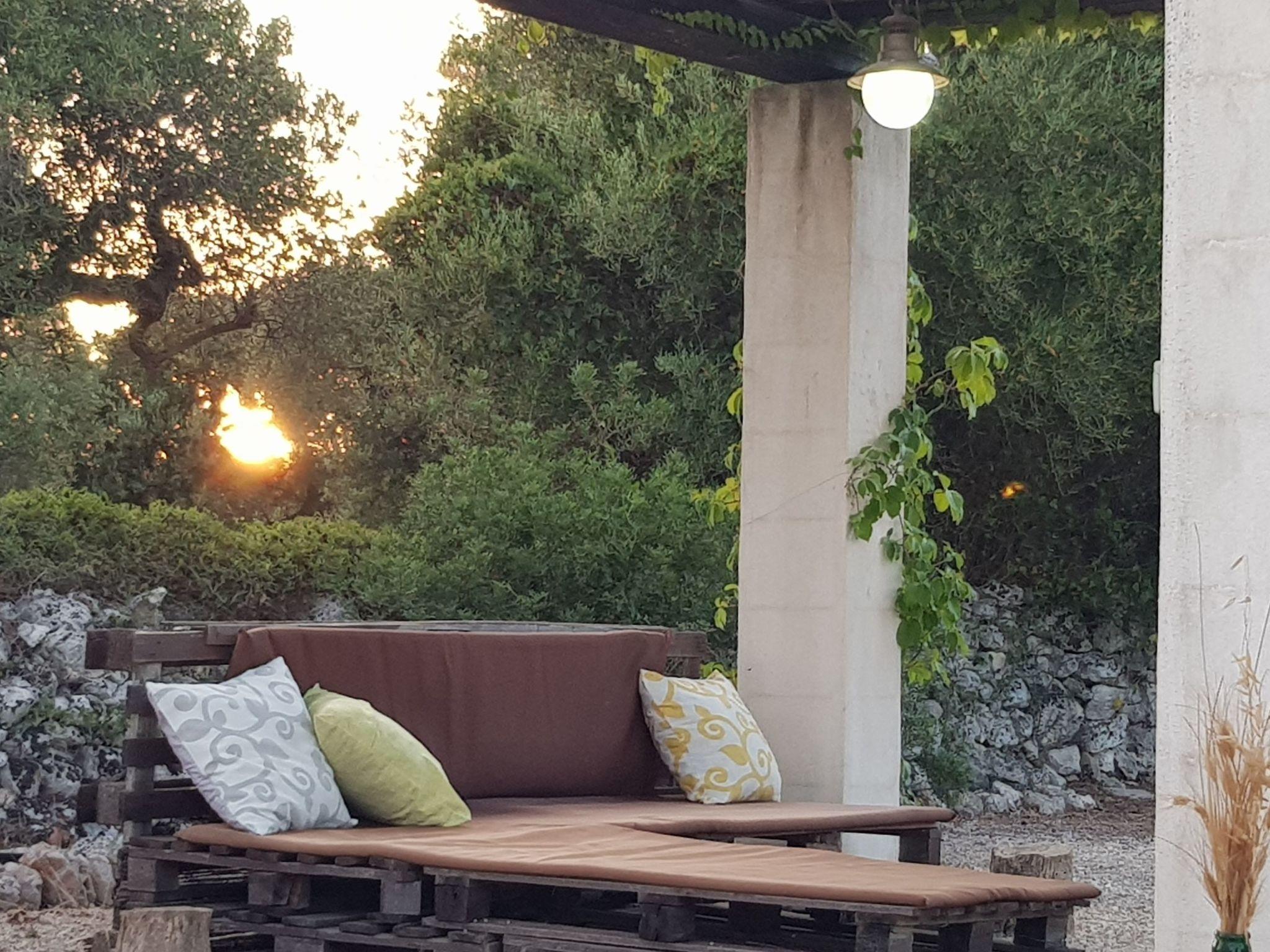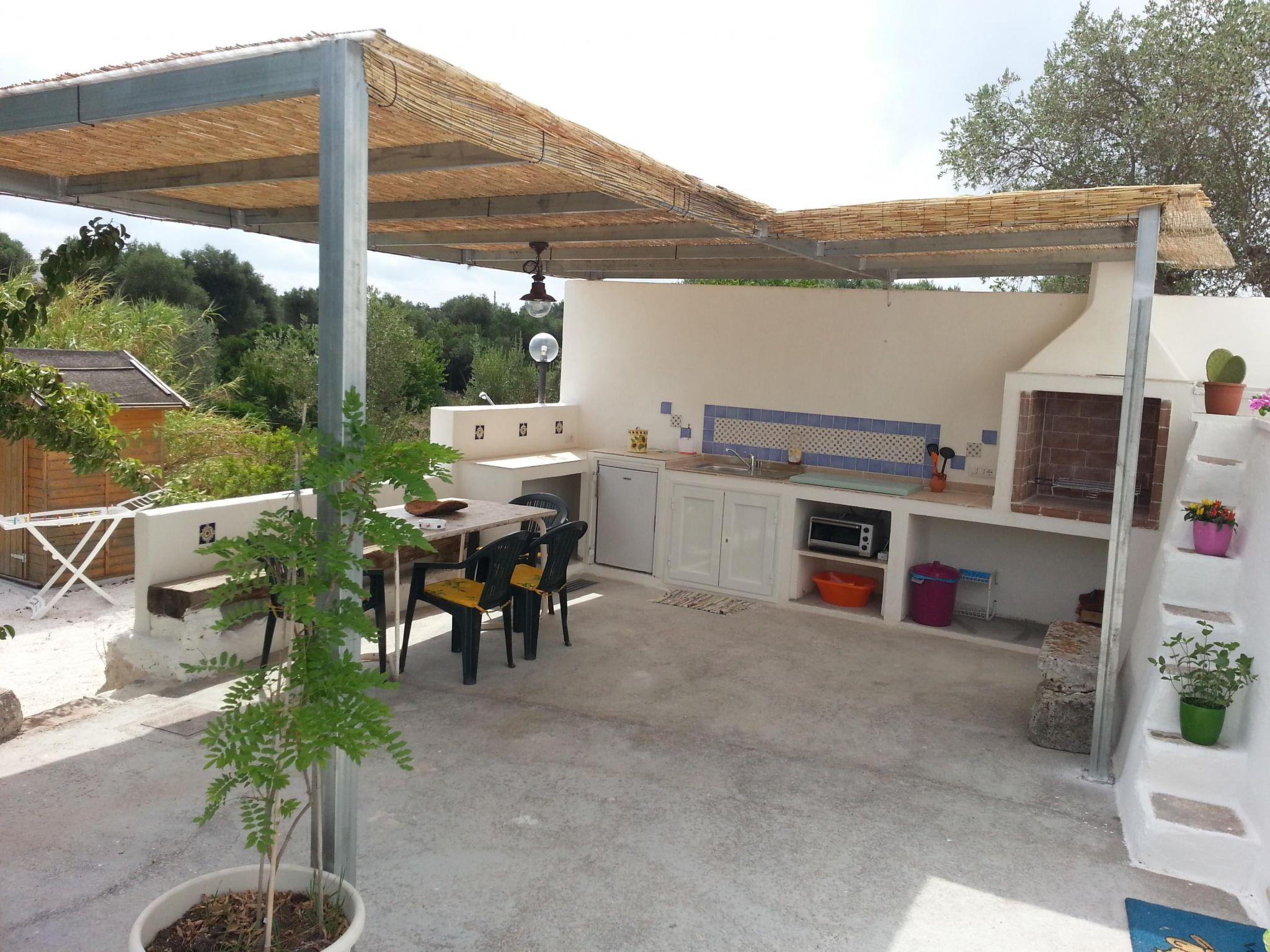 The fully equipped outdoor kitchen is located on the veranda in front of the trullo. It has a fridge with freezer, mini oven and induction hob. A brick barbecue and a dining table with bench and chairs complete the veranda. Under the veranda is a wonderful sun terrace with sun loungers and an outdoor shower. The trullo is surrounded by a 5600 square metre private property with all kinds of Mediterranean trees: walnuts, pears, cherries, prickly pears, figs, almonds, medlars, goldenrod, palms and majestic olive trees.
