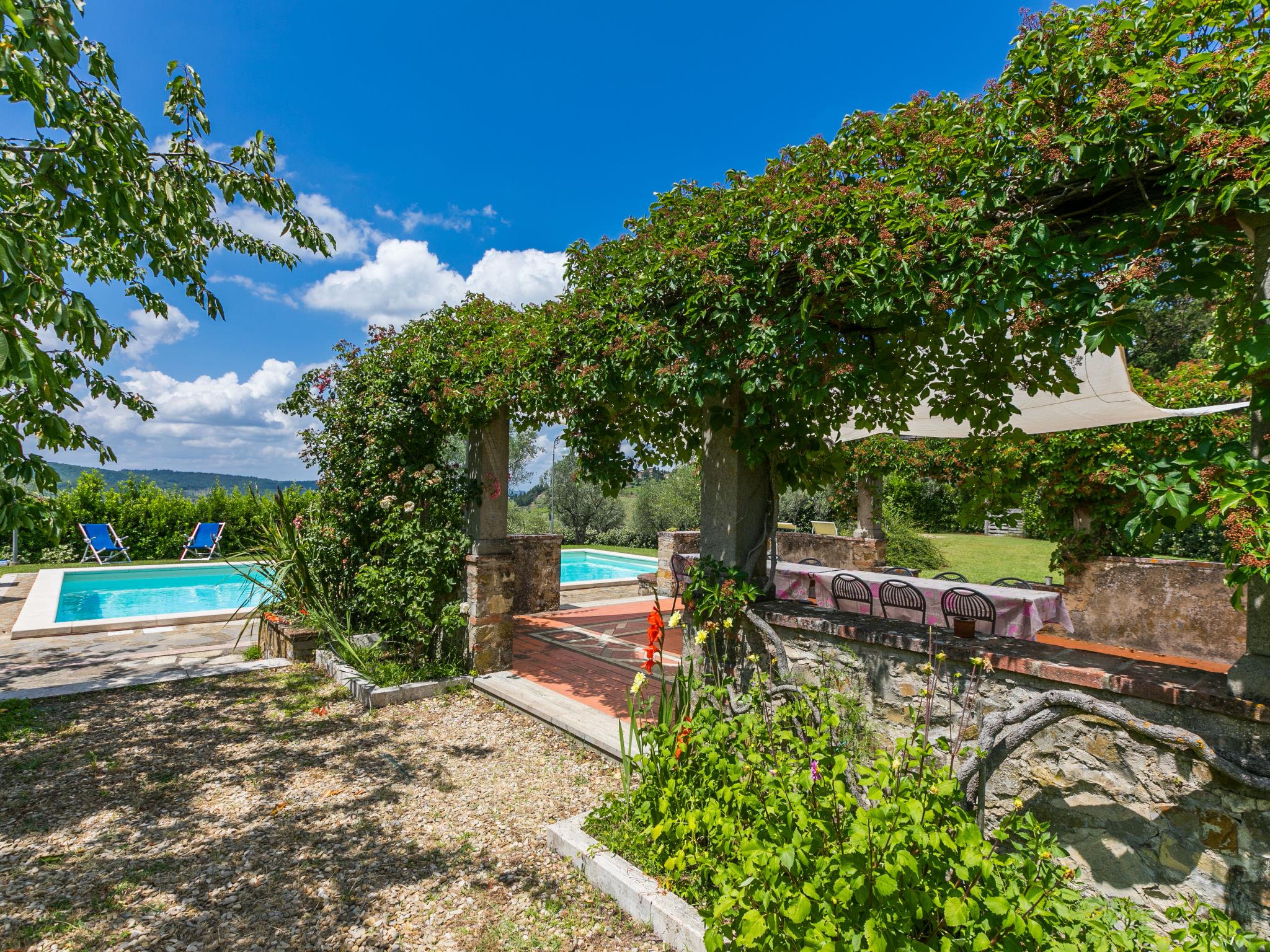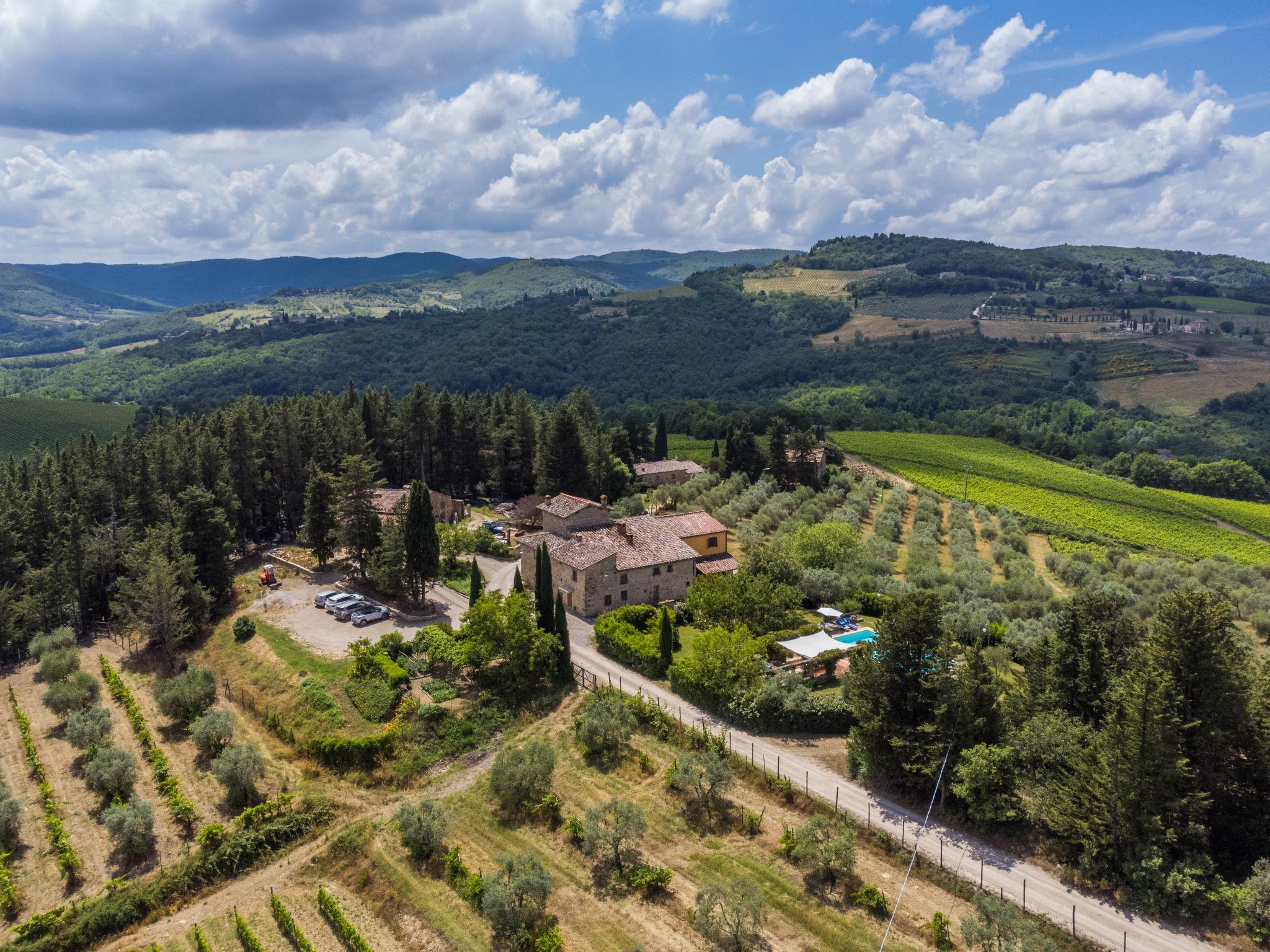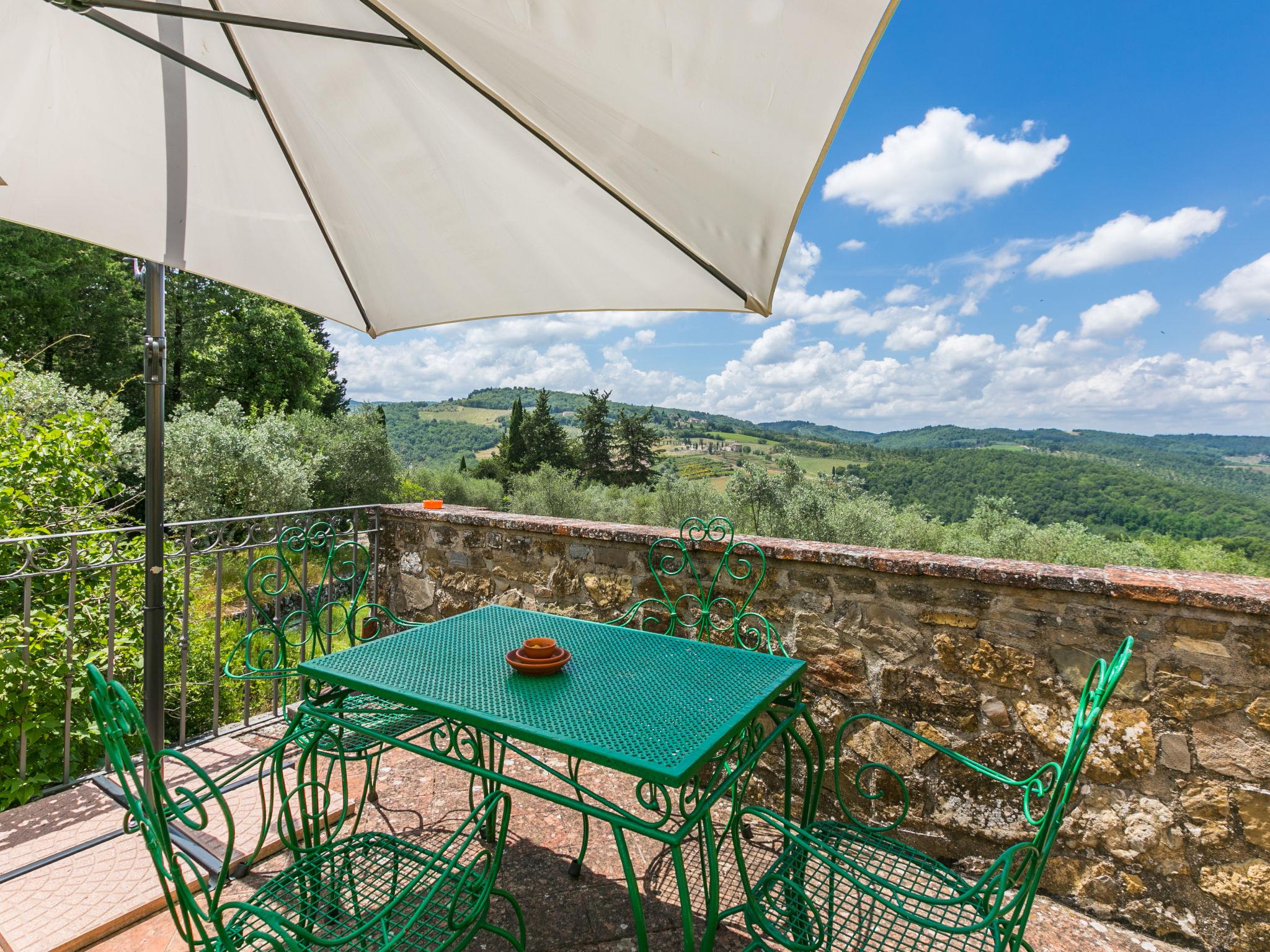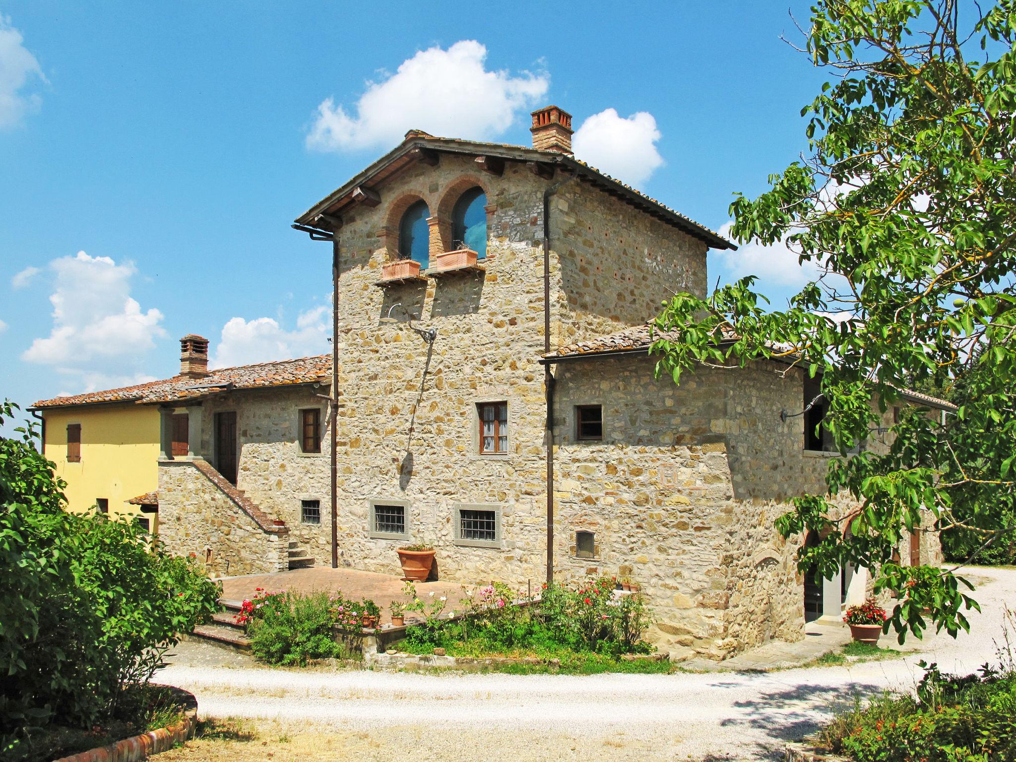 Cosy on a vinyard "Reggine", from the 18th century, renovated, surrounded by meadows and fields. 3 km from the centre of Panzano, 10 km from the centre of Greve in Chianti, 40 km from the centre of Firenze, in a secluded, elevated position, in the countryside. For shared use: property with lawn, orchard, swimming pool (12 x 6 m, seasonal availability: 01.May. - 15.Oct.). Outdoor shower, pergola, terrace, garden furniture, barbecue, pool maintenance by the owner/gardener. Motor access (2.4 km via unmade road). Parking on the premises. Shop 3 km, grocery 3 km, supermarket 10 km, restaurant 3 km, bakery 3 km, bus stop 3 km, indoor swimming pool 21 km. Golf course (18 hole) 25 km. Nearby attractions: Radda in Chianti 15 km, Siena 40 km, San Gimignano 40 km. Please note: car recommended. Baby equipment (included). Groups of teenagers on request only. Local sale of farm products. Owner uses some rooms in the house. All houses/apartments are individually designed/furnished.