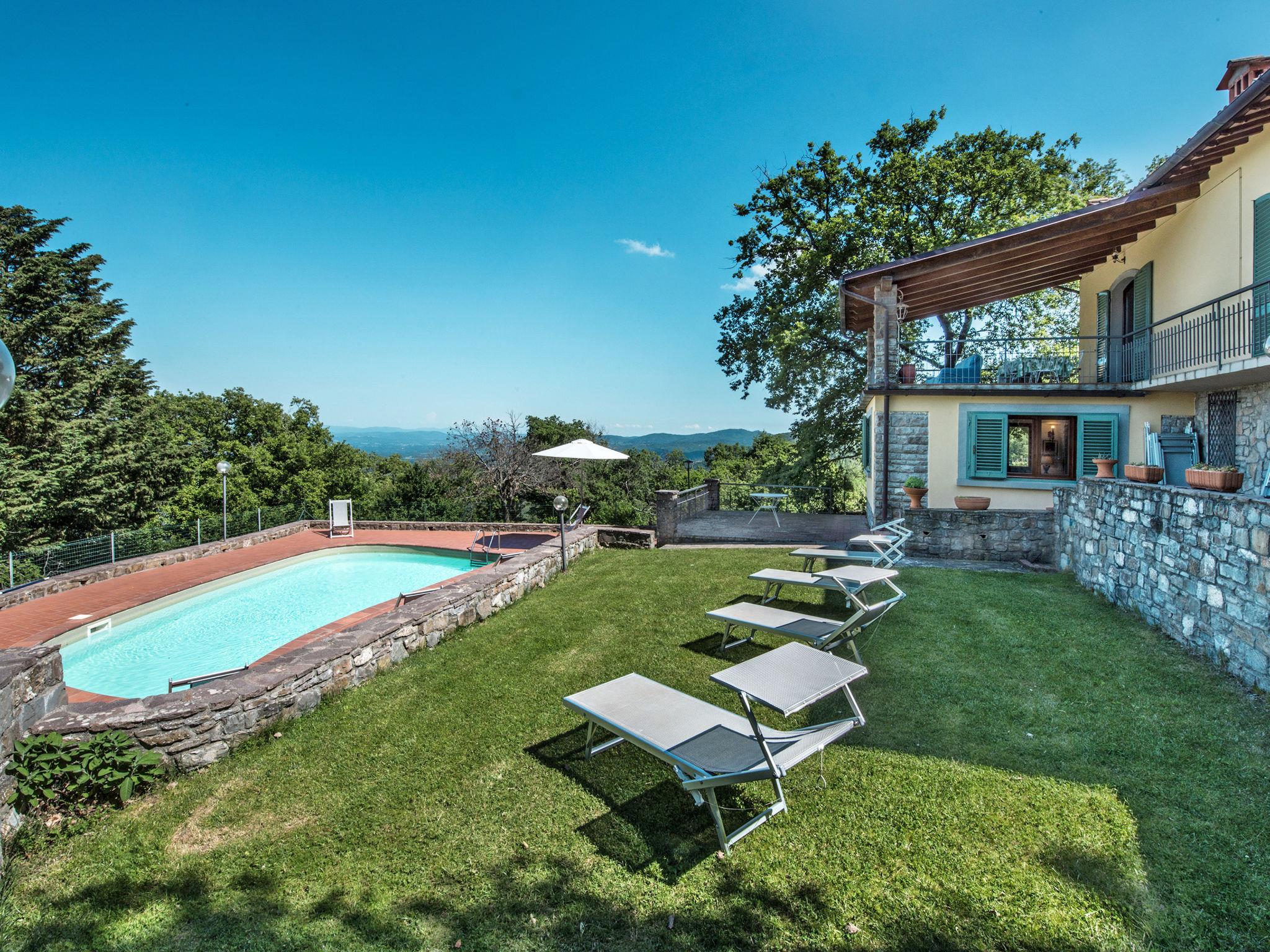 Cosy, rustic house "Caiano", 750 m a.s.l., surrounded by trees, fields and vineyards. 8 km from the centre of Radda in Chianti, 7 km from the centre of Cavriglia, outside the resort, 38 km from the centre of Siena, on top of a hill, in the countryside. Private: terraced garden, 1'000 m2 (fenced) with wildlife garden and trees, natural garden, meadow, swimming pool (10 x 5 m, seasonal availability: 01.May. - 30.Sep.). Unconventional pool shape. Outdoor shower, terrace. In the house: WiFi. Parking (for 3 cars) on the premises. Shop 4 km, supermarket 8 km, railway station "San Giovanni Valdarno" 12 km. Please note: car recommended.