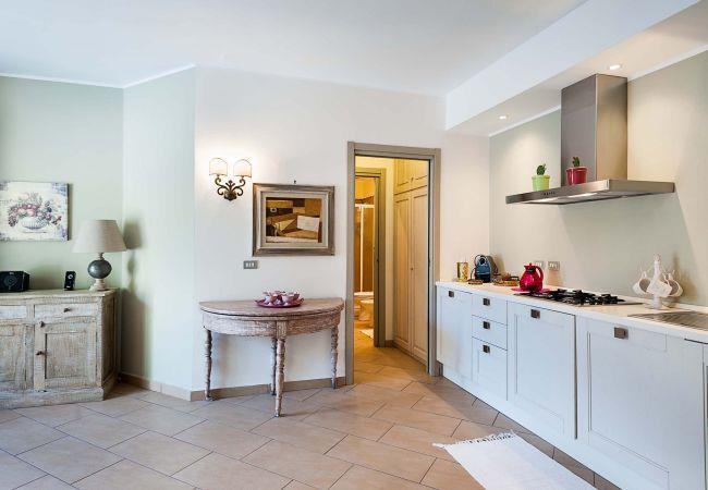 G.F.: living room/kitchen, 1 double bedroom with en-suite shower, 1 twin bedroom with en-suite shower, terrace, garden, swimming pool, solarium.