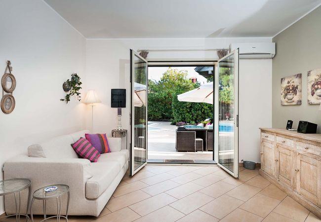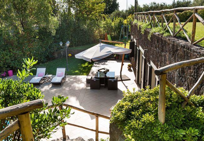 Montefiore is a comfortable house with swimming pool located in Ragalna, a characteristic village on the slopes of Mount Etna, Europe's highest and most active volcano, recently added to UNESCO's World Heritage list. The property is surrounded by black lava rock walls that create a nice contrast with the green lawned garden and with the modern look of the interior. The house is all on one level and includes a living room/kitchen and two bedrooms with en-suite shower. Furnished with taste and functionality, the house has all mod cons, such as air conditioning, internet Wi-Fi, IPod dock station, washing machine and dishwasher. The pool can be heated on request. Set in a quiet but not isolated position, Montefiore is the ideal property for those seeking a relaxing holiday, but is also a good starting point for exploring the surrounding area. From the house can be easily reached the other villages and natural beauties of the Etna Park and the most popular towns on the Ionian coast, such as Taormina, Catania and Syracuse.
