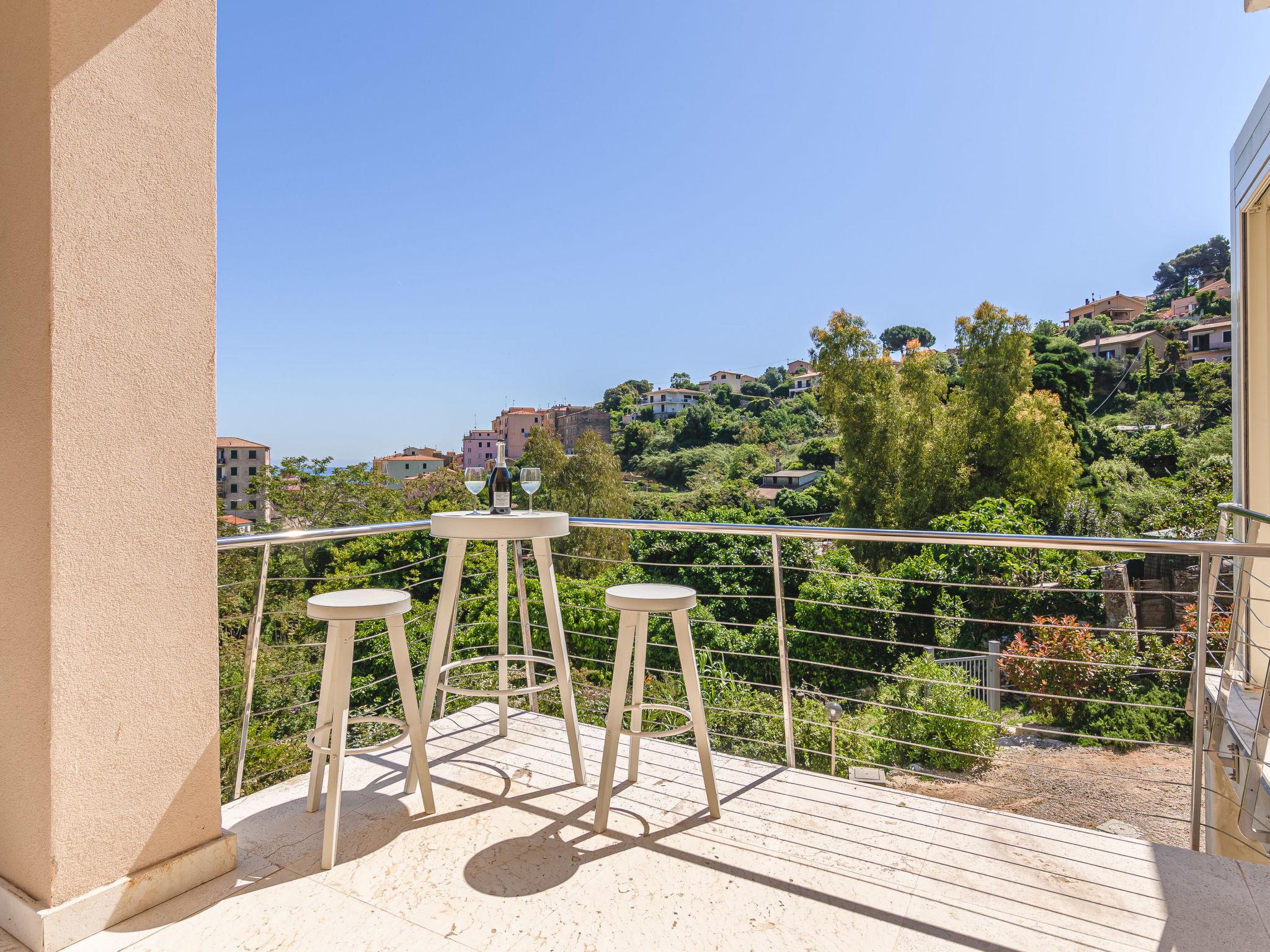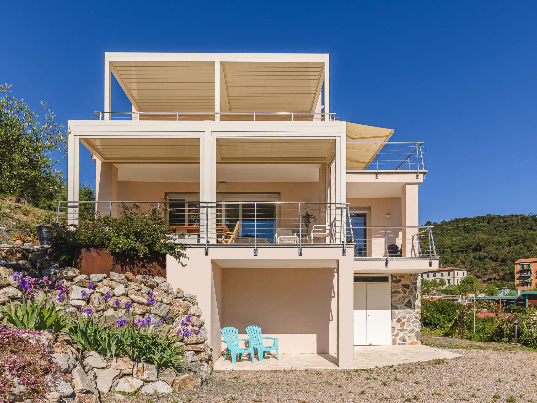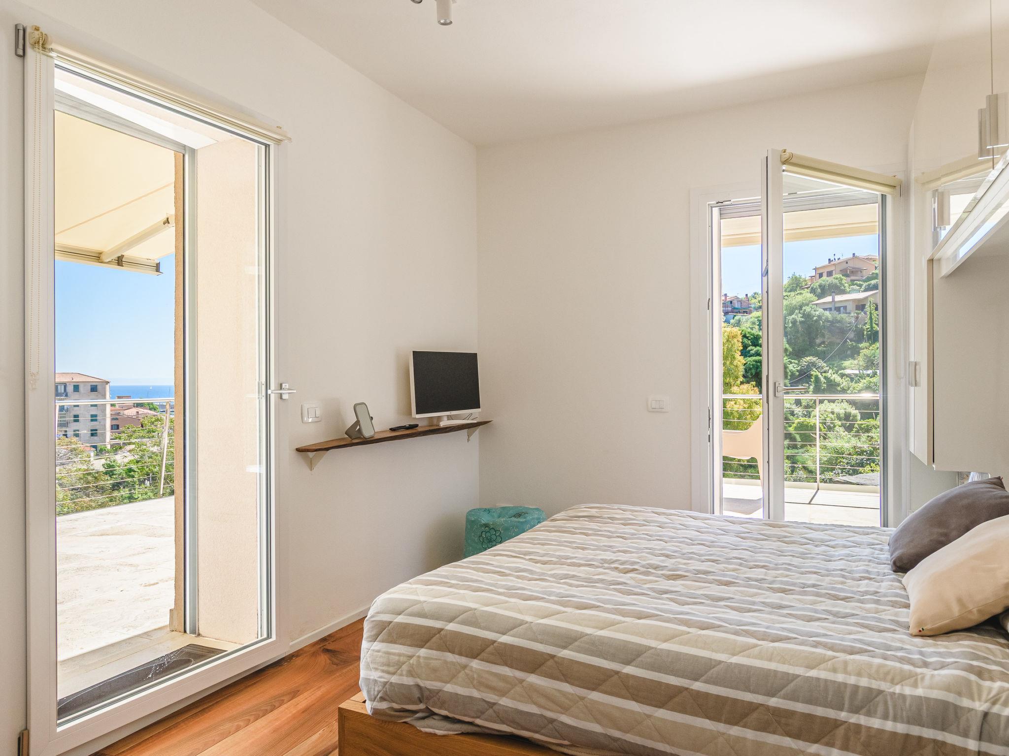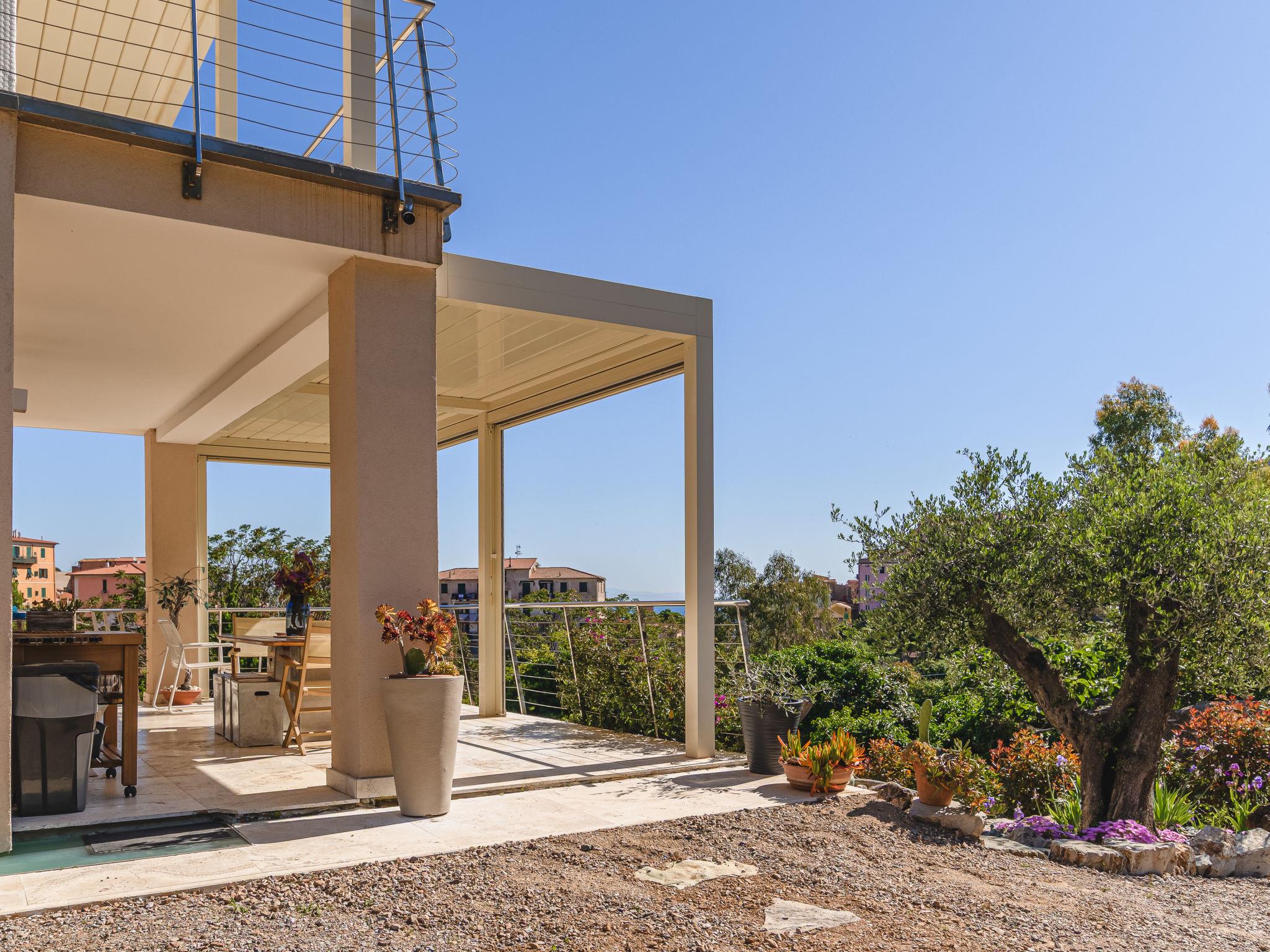 4-room villa 110 m2 on 2 levels. Bright, modern and tasteful furnishings: open living/dining room with sliding door, panoramic window with dining table and TV. Exit to the terrace. 1 room with 1 double bed (160 cm). Exit to the terrace. Open kitchen (oven, dishwasher, 4 induction hot plates, kettle, microwave, freezer, electric coffee machine, cooking island). Exit to the terrace. Shower/bidet/WC. Upper floor: 2 rooms, each room with 1 double bed (160 cm). Exit to the terrace. Shower/bidet/WC. Air-conditioning, forced-air heating. Large terrace partly roofed, large terrace, patio. Terrace furniture, barbecue, deck chairs. Very beautiful view of the sea and the town. Facilities: washing machine, hair dryer. Internet (WiFi, free). Parking. E-charging station. Please note: non-smokers only. Private entrance, smoke alarm, fire extinguisher. Centralized air conditioning. Bioclimatic pergolas that provide shade from the summer heat. IT049021C24KYKM8AD