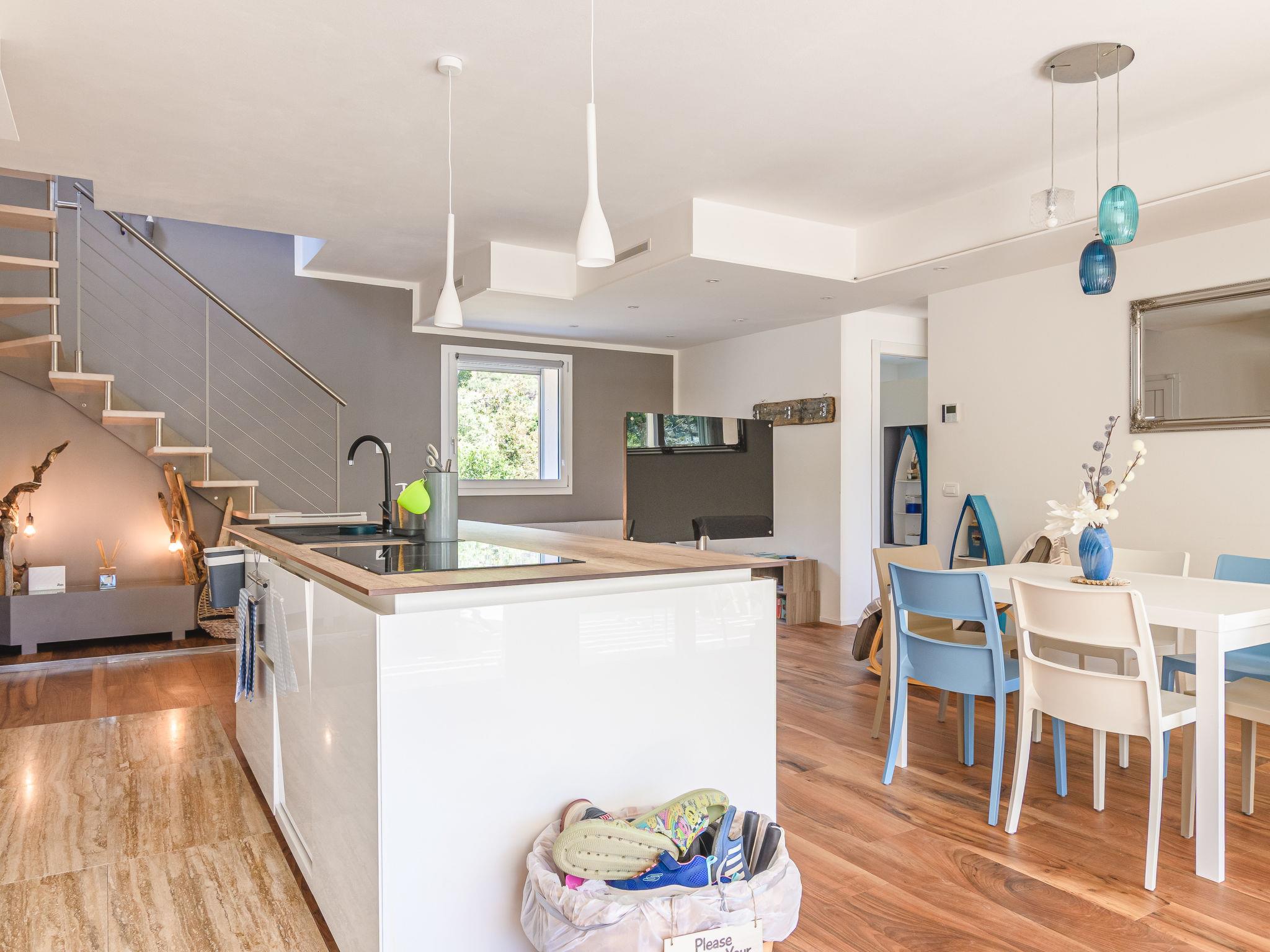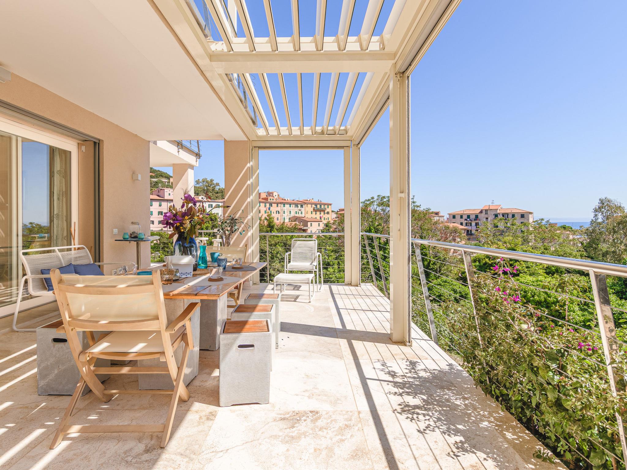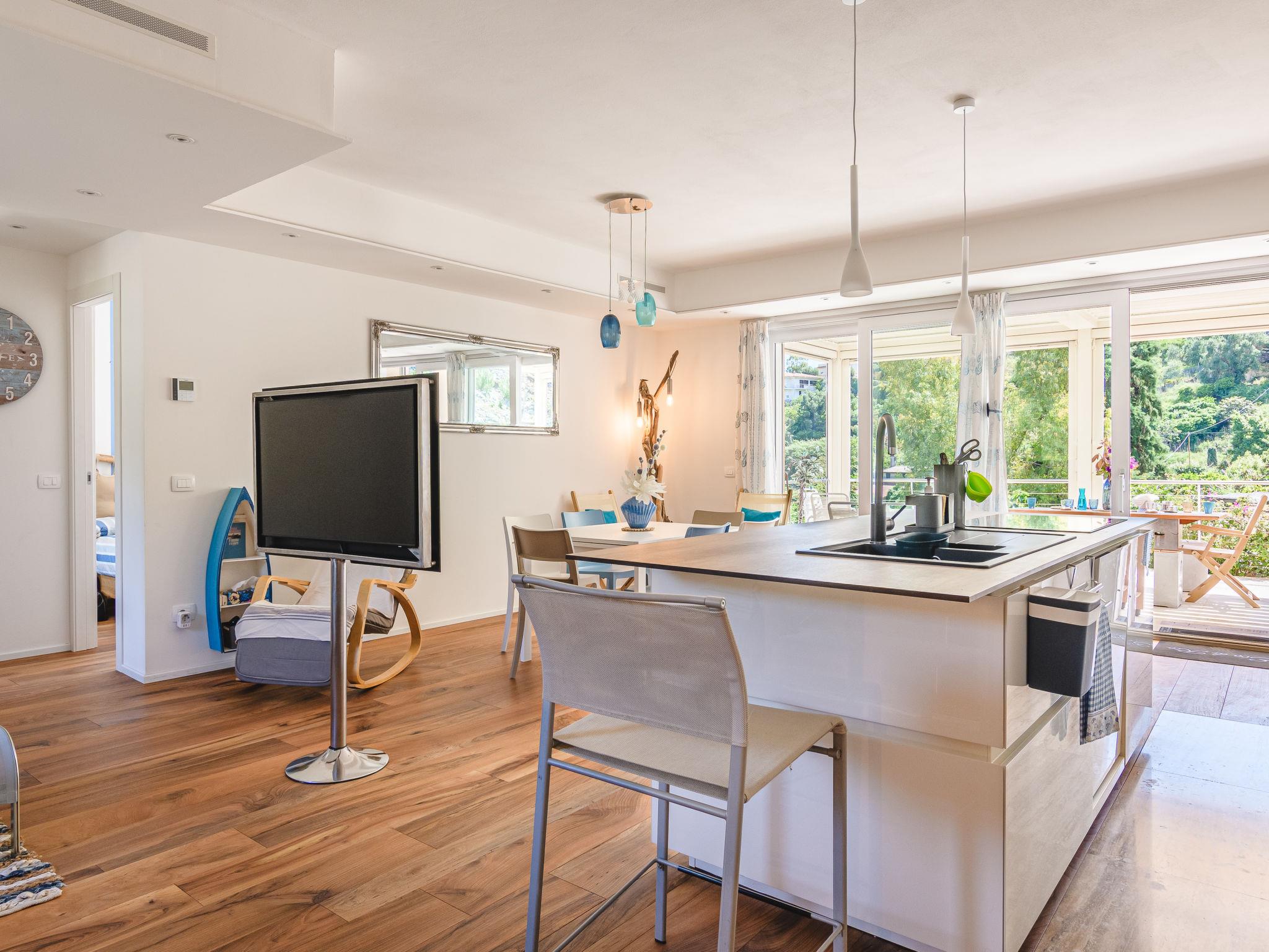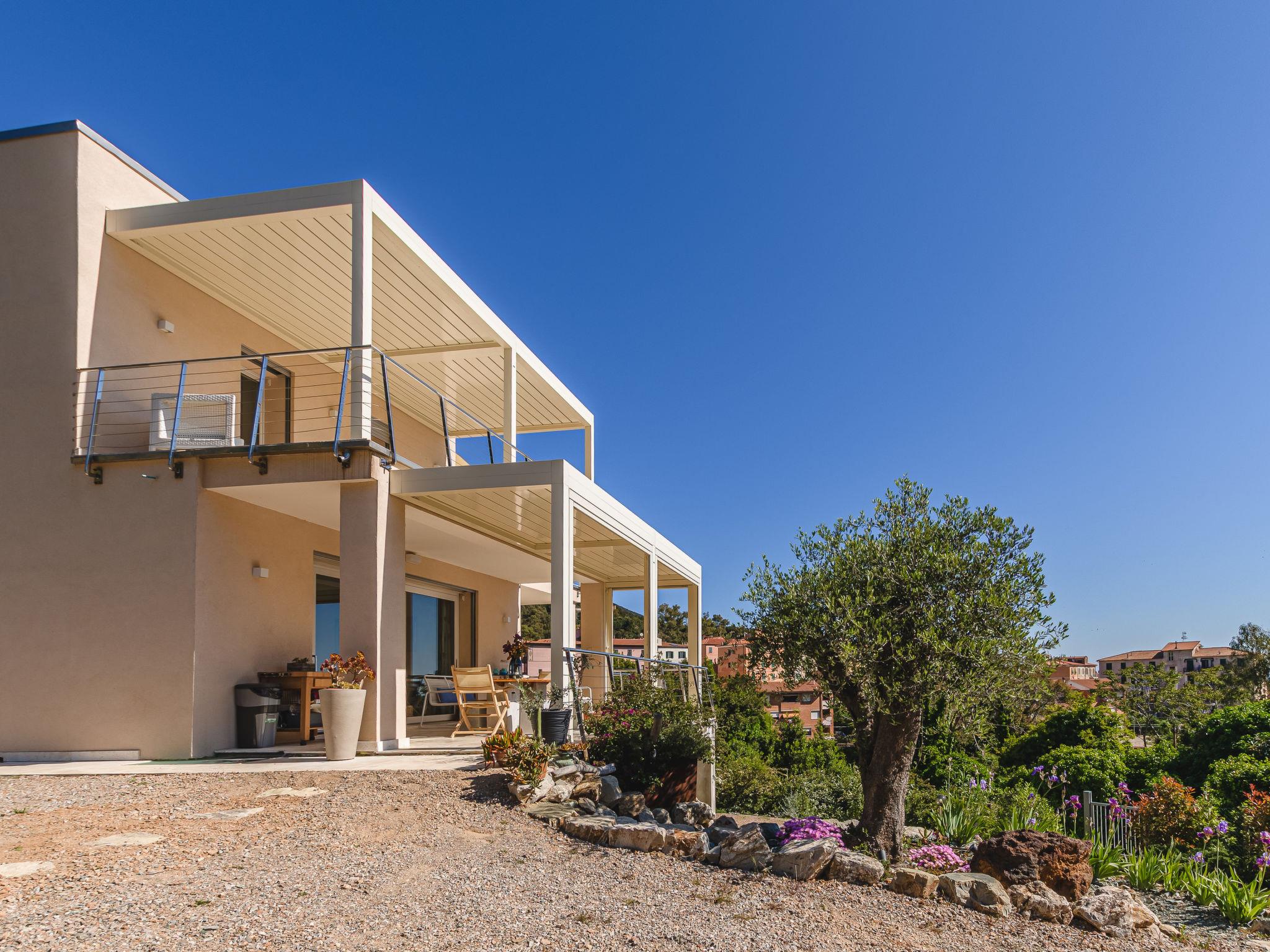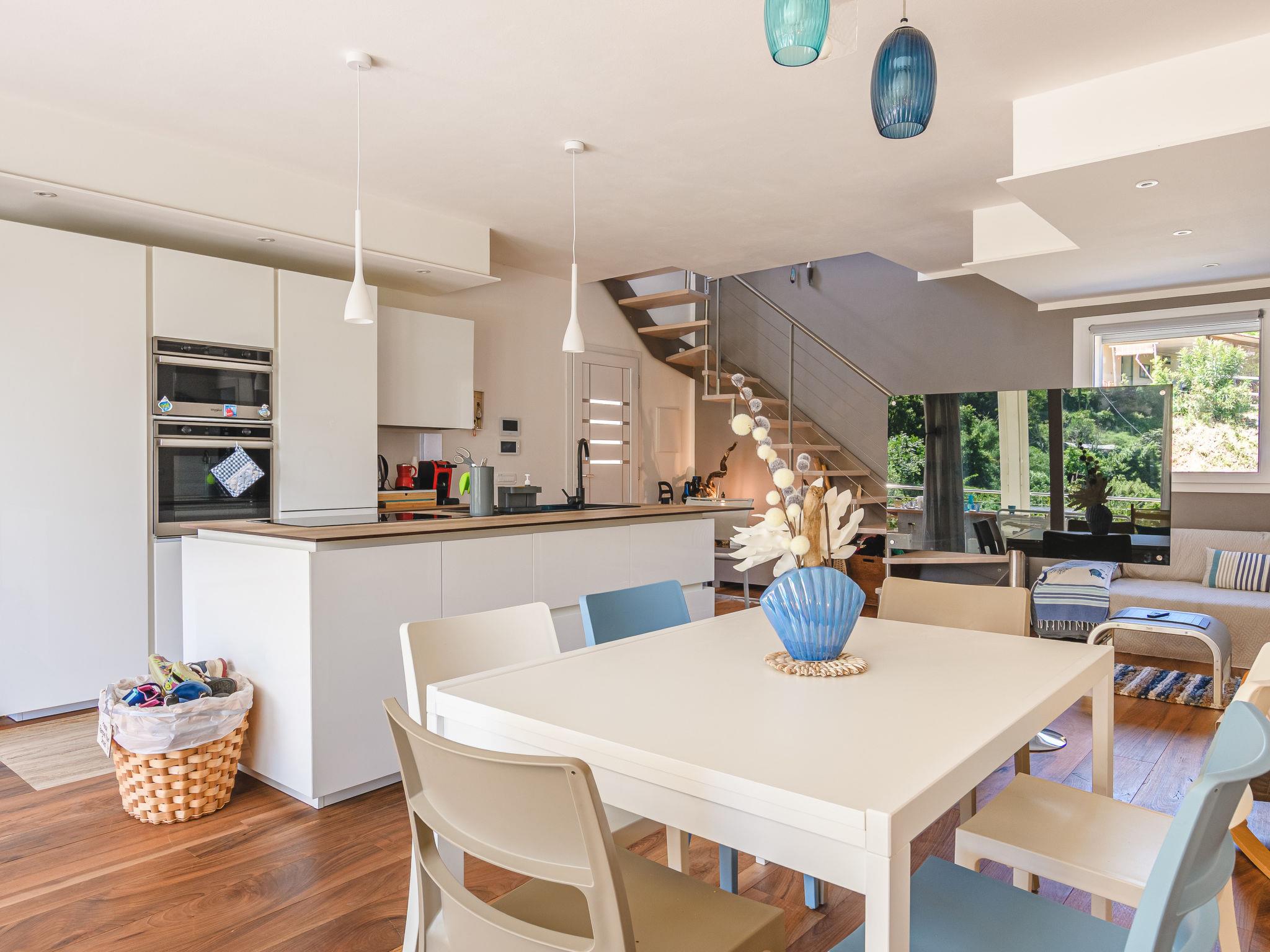 4-room villa 110 m2 on 2 levels. Bright, modern and tasteful furnishings: open living/dining room with sliding door, panoramic window with dining table and TV. Exit to the terrace. 1 room with 1 double bed (160 cm). Exit to the terrace. Open kitchen (oven, dishwasher, 4 induction hot plates, kettle, microwave, freezer, electric coffee machine, cooking island). Exit to the terrace. Shower/bidet/WC. Upper floor: 2 rooms, each room with 1 double bed (160 cm). Exit to the terrace. Shower/bidet/WC. Air-conditioning, forced-air heating. Large terrace partly roofed, large terrace, patio. Terrace furniture, barbecue, deck chairs. Very beautiful view of the sea and the town. Facilities: washing machine, hair dryer. Internet (WiFi, free). Parking. E-charging station. Please note: non-smokers only. Private entrance, smoke alarm, fire extinguisher. Centralized air conditioning. Bioclimatic pergolas that provide shade from the summer heat. IT049021C24KYKM8AD