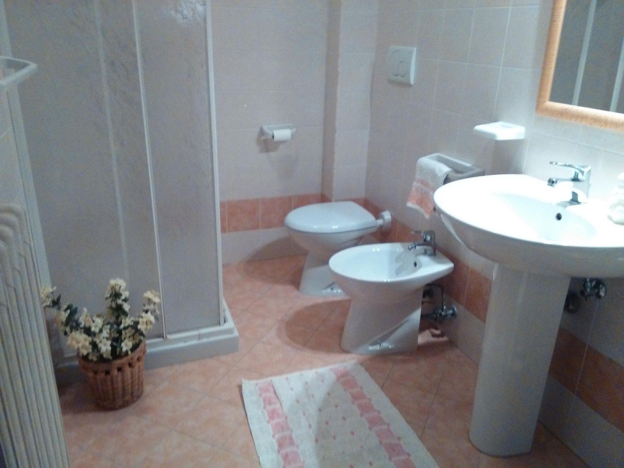 The approx. 75 m² flat is located on the ground floor. It consists of two rooms: one with two single beds and one with three beds (size of single beds: 80x190 cm). On request, the beds can be joined to form double beds. The kitchen-living room is equipped with a large dining table, a sofa bed for two persons (160x190 cm), a gas cooker, an oven and a refrigerator with freezer. The large bathroom has a shower and bidet and a hairdryer. The flat is equipped with heating.1 to 25 persons can be accommodated in 3 interconnected flats or completely separate and independent.Every morning croissants, homemade cakes, fresh fruit, etc. await you at breakfast. You can also ask for meals based on Abruzzo specialities to be delivered to your flat.
