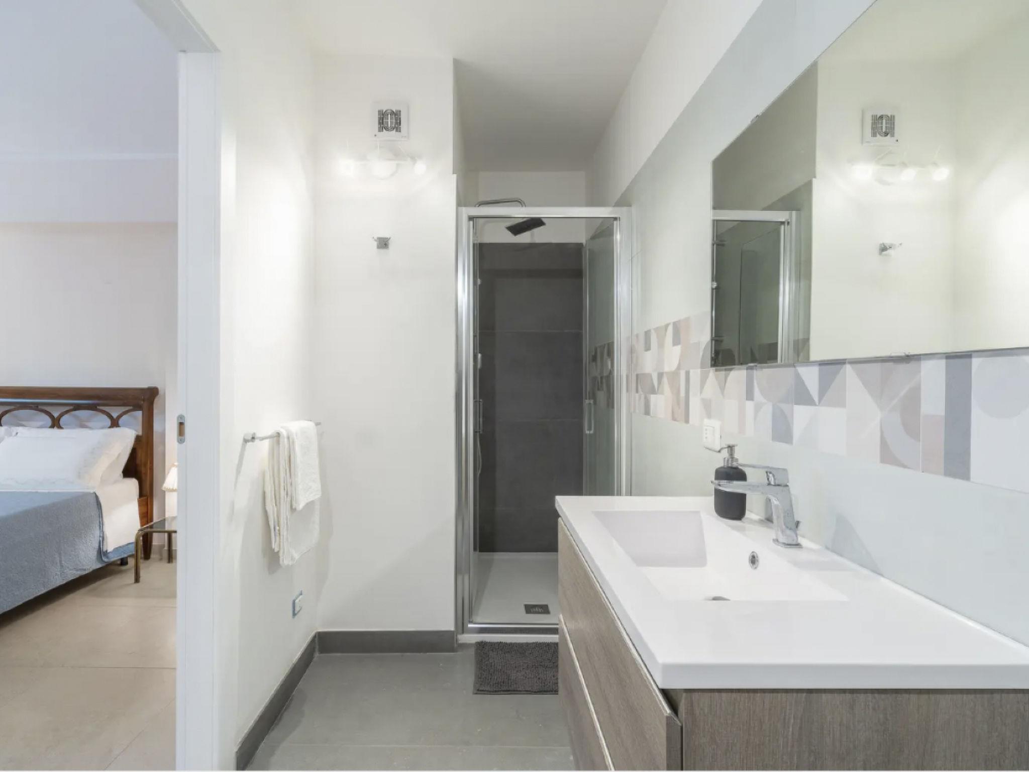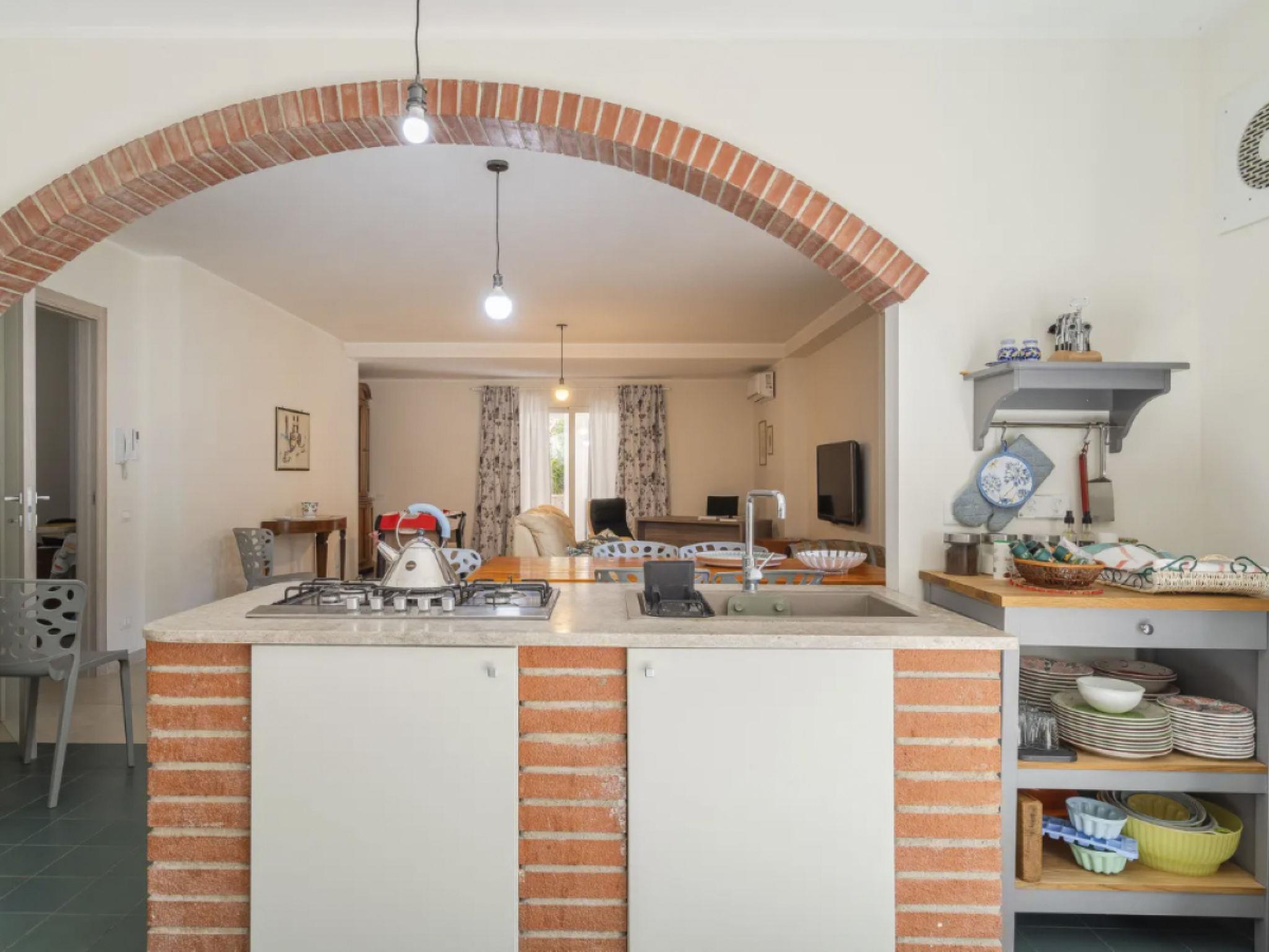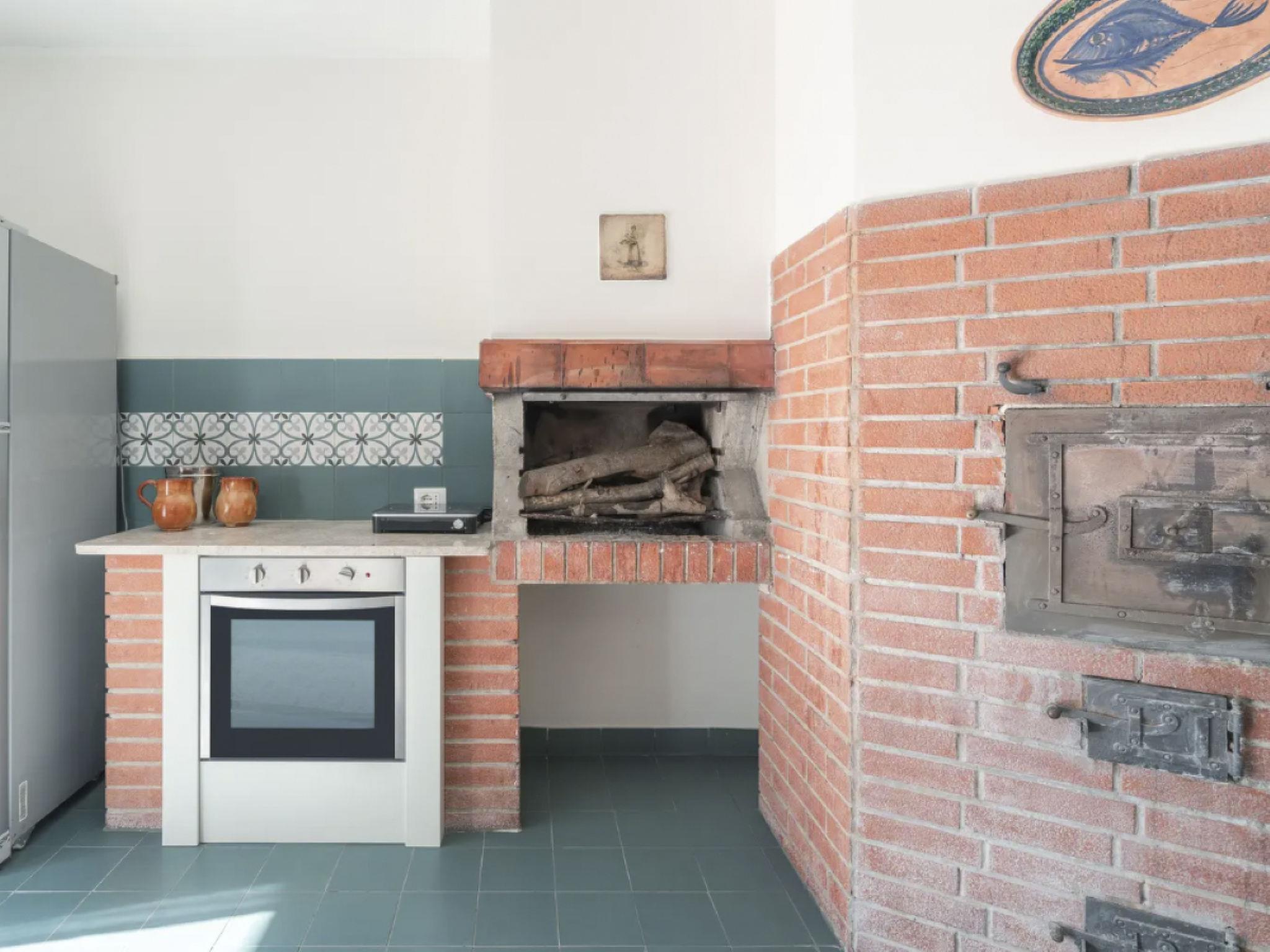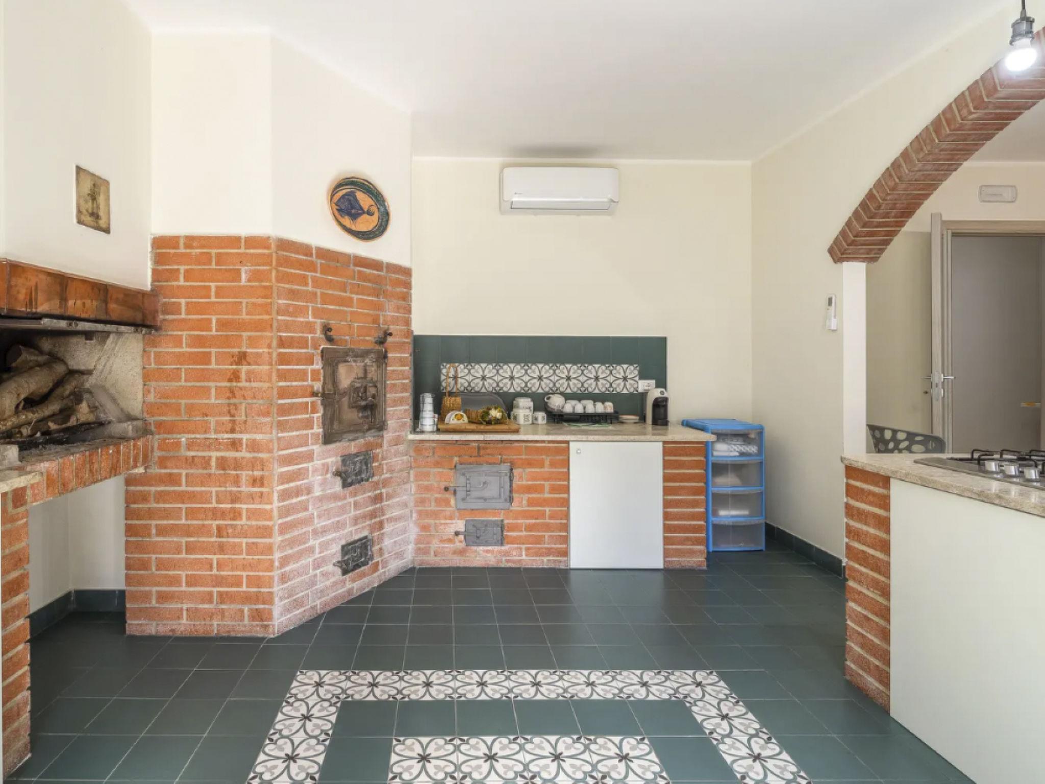 The flat in the villa consists of three bedrooms of which: a double bedroom with en-suite bathroom, a double bedroom and a bedroom with single or double beds, with the possibility of adding camping cots as required, a shared bathroom, a large living room with a two-seater sofa bed, a kitchen with wood-burning oven, electric oven, indoor barbecue, gas hob, induction hob, fridge, freezer, and all the crockery needed.