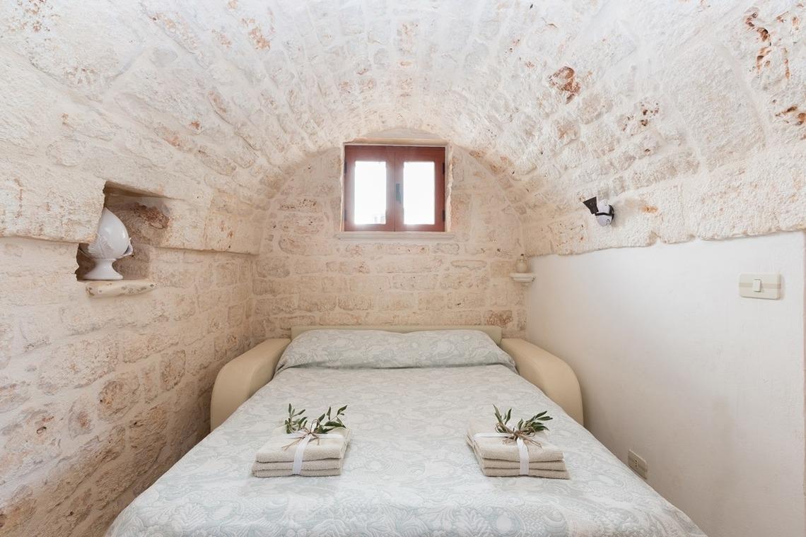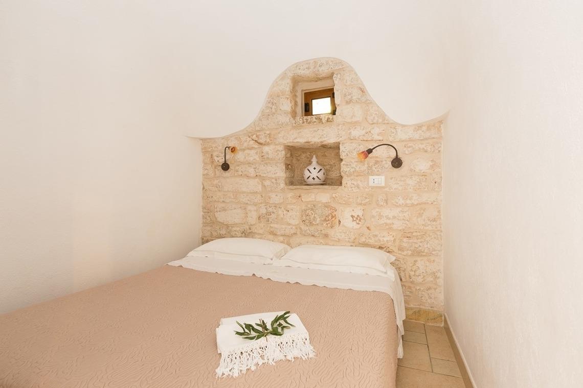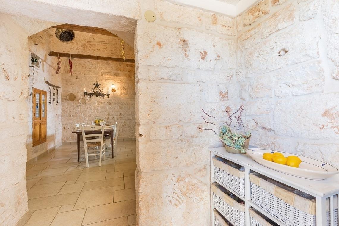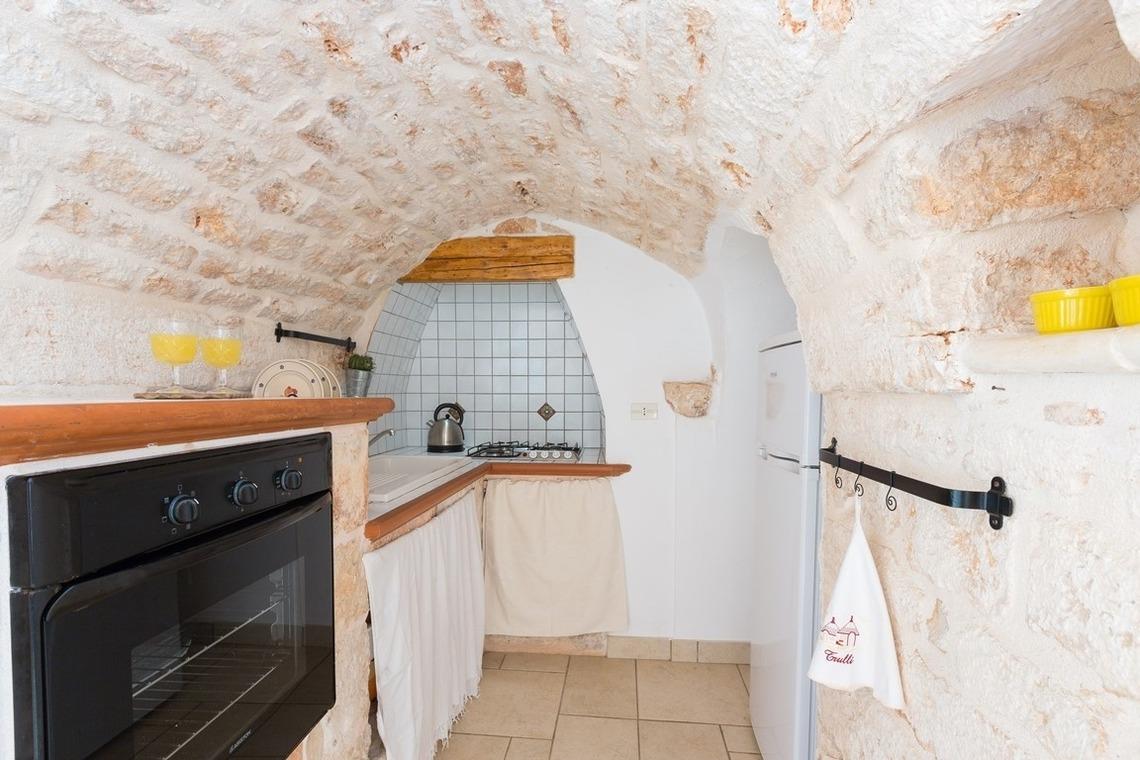 Der Trullo besteht aus einem Esszimmer, einer Küchenzeile mit Herd und Ofen, einem Badezimmer mit Dusche und einem Schlafzimmer mit drei Steinnischen, in denen sich Schlafgelegenheiten befinden, von denen eine ein Doppelbett und zwei Einzelbetten sind.