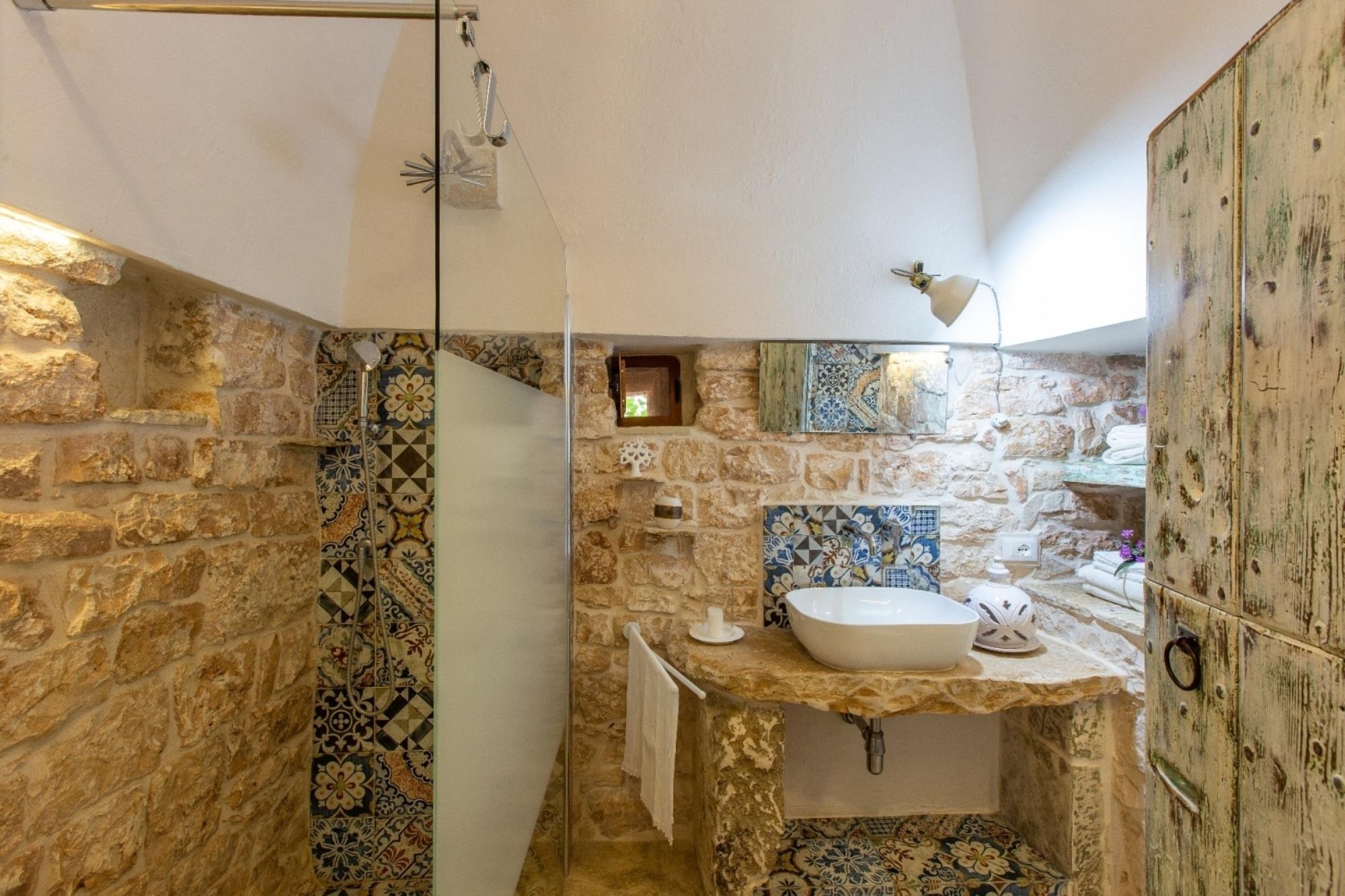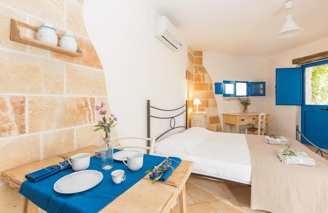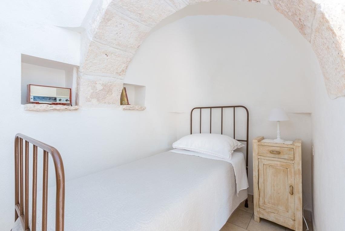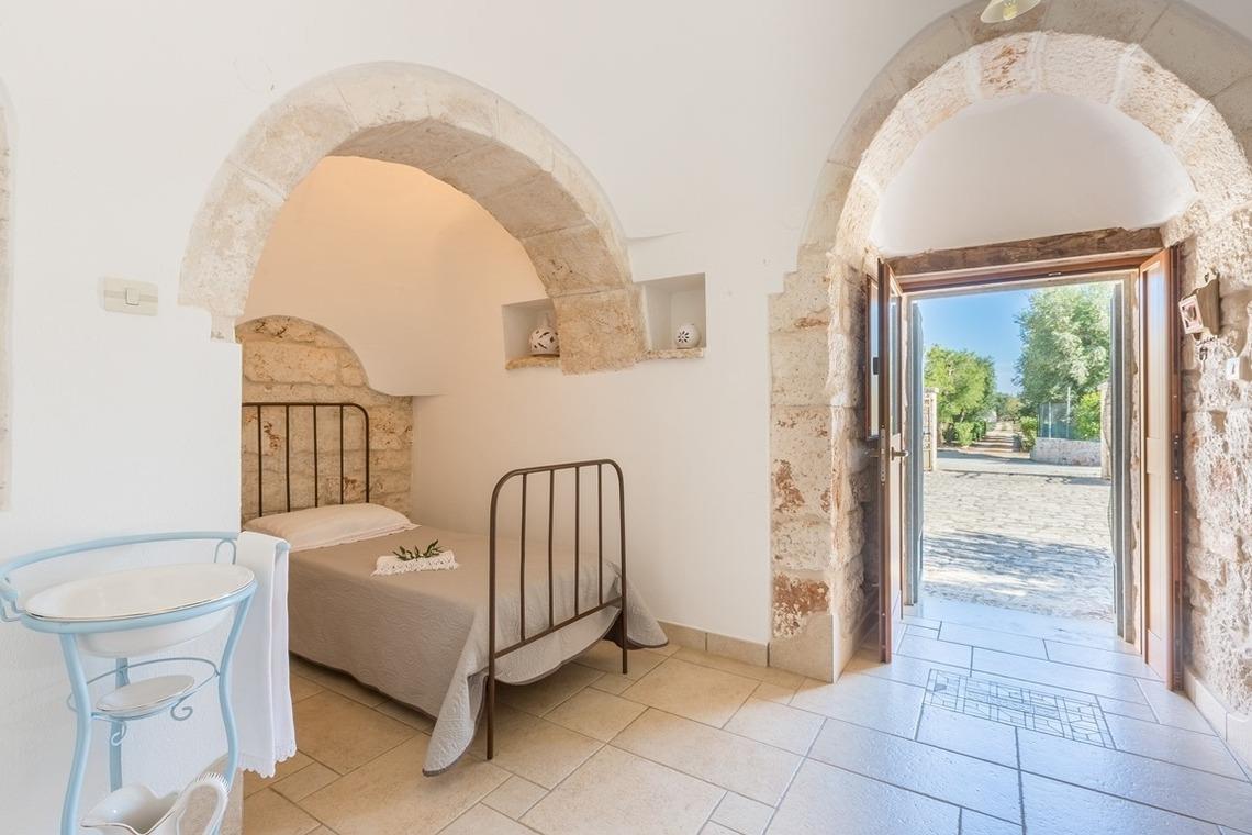 Der Trullo besteht aus einem Esszimmer, einer Küchenzeile mit Herd und Ofen, einem Badezimmer mit Dusche und einem Schlafzimmer mit drei Steinnischen, in denen sich Schlafgelegenheiten befinden, von denen eine ein Doppelbett und zwei Einzelbetten sind.