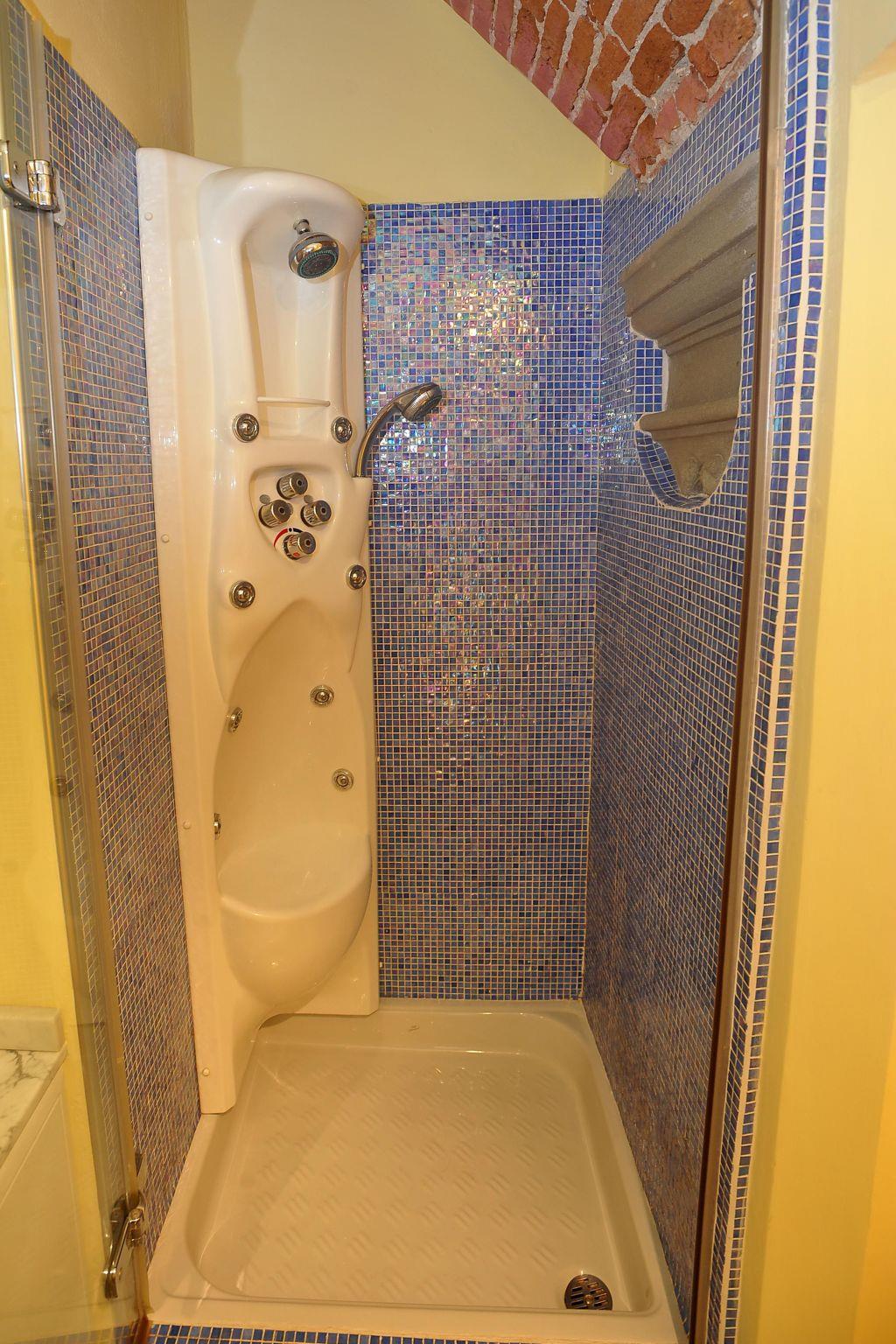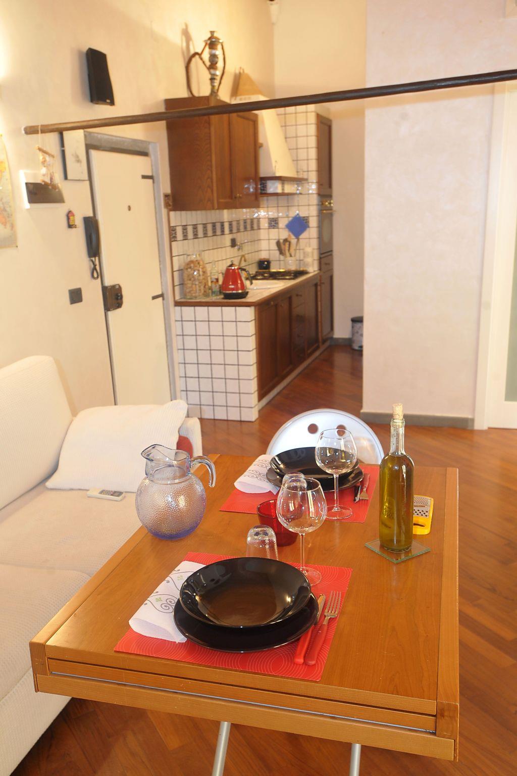 APARTMENT INTERIORS The living room has a beautiful vaulted ceiling with exposed bricks, stone capitals and baseboards. There is a very good heating/conditioning system which is also quiet; split air conditioner is placed in the living room.The master bedroom is furnished with an ample wardrobe and a shoe rack. The living room is fully furnished with a comfortable armchair, a sofa bed, hi-fi system, arcade game console with over 100 games and a caffe table which can be turned into a fully functioning dinner table, able can accommodate up to 8 people. The kitchen area includes an oven, dishwasher, fridge and all the kitchenware needed to cook any kind of meal. The access to the bathroom is through a pleasurable and traditional small stone room, fitted with a hydro-massage jets shower.