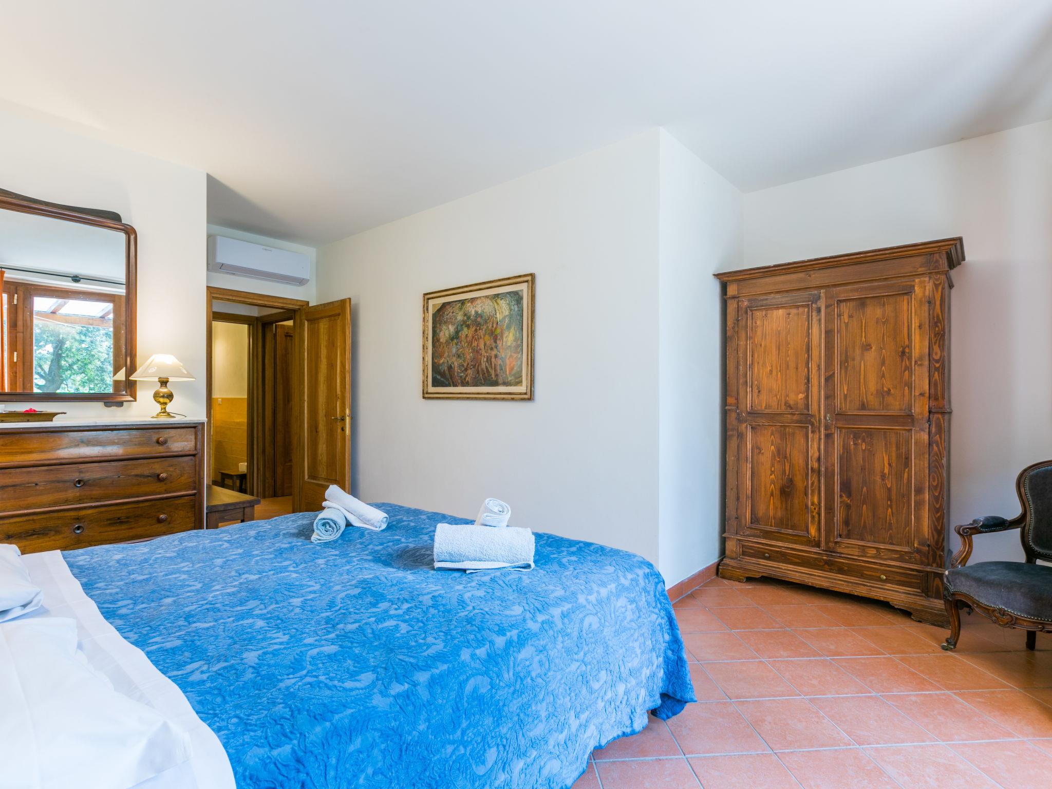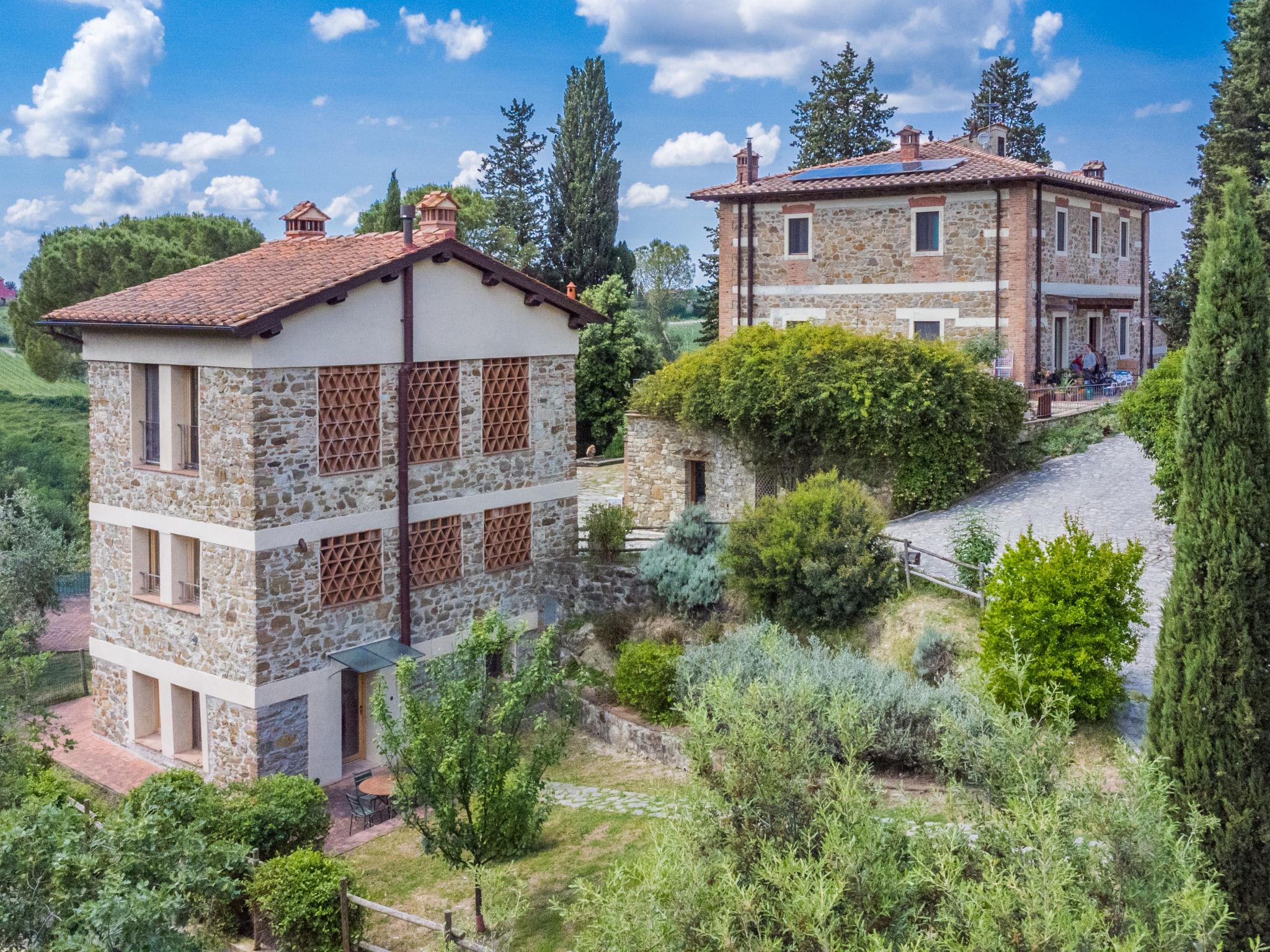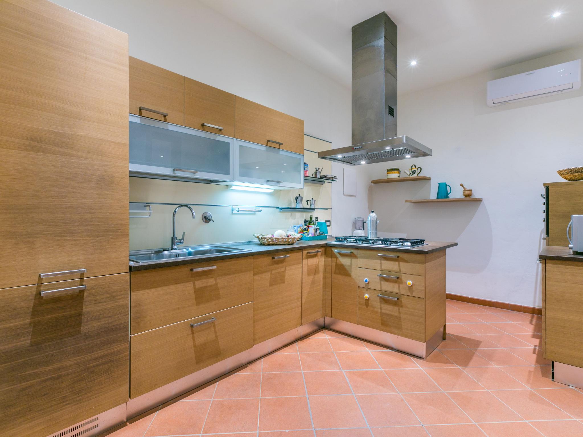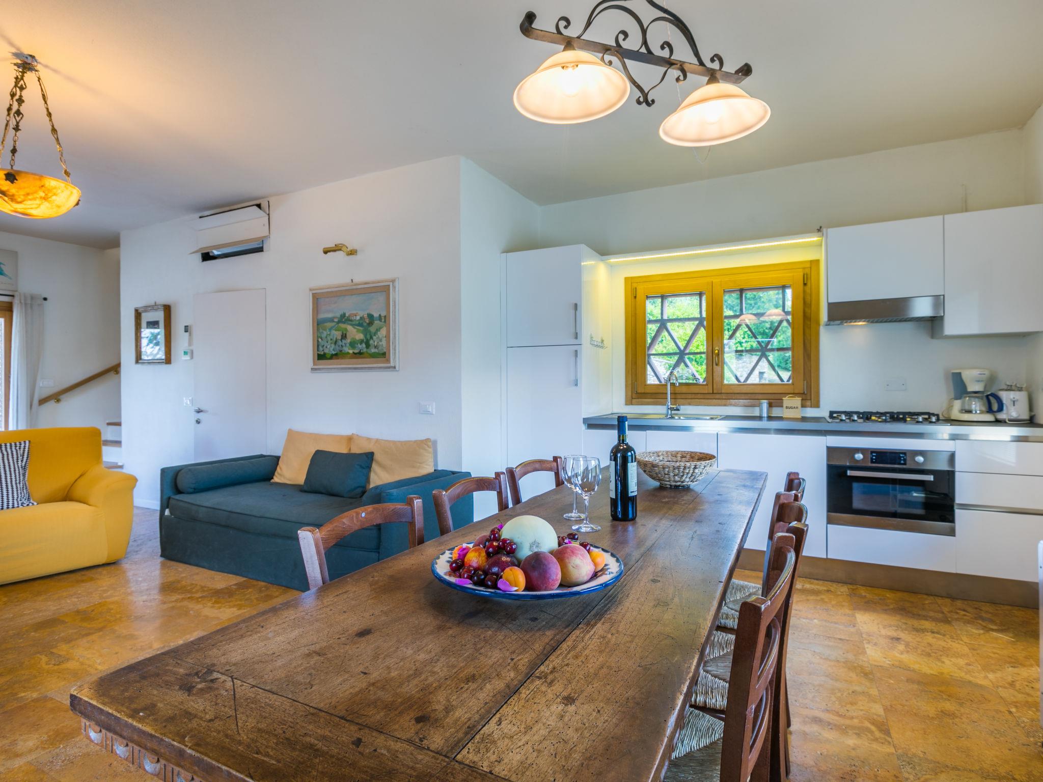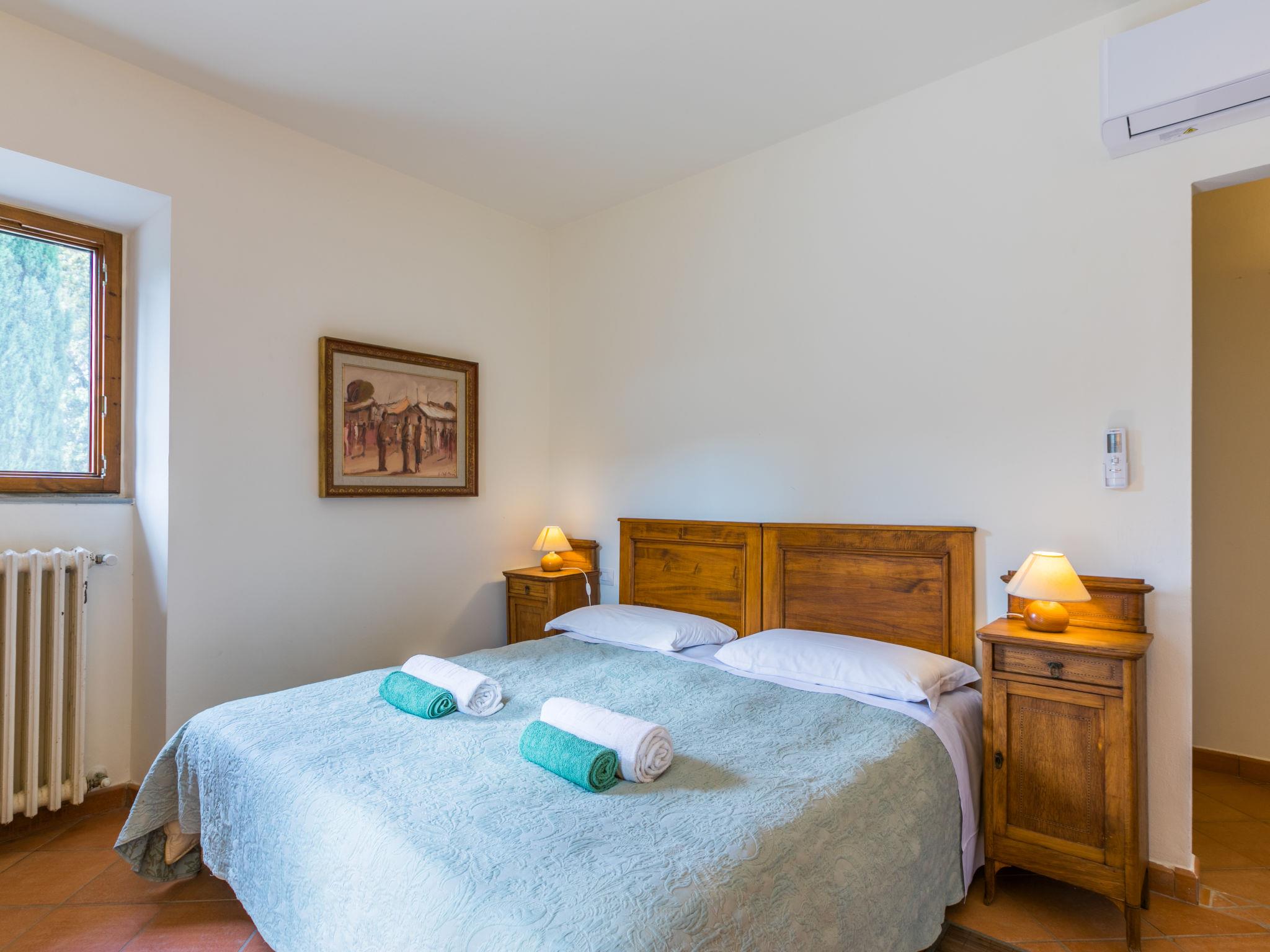 "Policleto", 9-room house 270 m2 on 3 levels. Spacious, partly renovated in 2023, comfortable and cosy furnishings: living/dining room with dining table, satellite TV, wood-burning stove and air conditioning. 2 double bedrooms, each room with shower/bidet/WC and air conditioning. Exit to the garden. 1 double bedroom with shower/bidet/WC and air conditioning. Kitchen (oven, dishwasher, 5 gas rings, toaster, kettle, microwave, freezer, electric coffee machine) with air conditioning. On the lower ground floor: (exterior staircase) living/dining room with kitchen corner. Exit to the garden. 1 double bedroom. Shower/bidet/WC. Upper floor: living/dining room with open-hearth fireplace, satellite TV and air conditioning. Open kitchen (oven, dishwasher, 4 gas rings, toaster). Shower/bidet/WC. 2nd upper floor: 2 double bedrooms, each room with air conditioning. Bath/shower/bidet/WC. Electric heating (extra), air-conditioning. Parquet floors, natural stone floors. Large garden 100 m2. Terrace furniture, barbecue, box-room. Beautiful panoramic view of the countryside. Facilities: washing machine, children's high chair, baby cot for up to 2 year olds. Internet (WiFi, free). Parking at the house. Please note: one double bedroom is outside the apartment. Non-smoking house. Smoke alarm, fire extinguisher. No internal connecting door between the separated properties. IT048001B5KNPC4G7Y