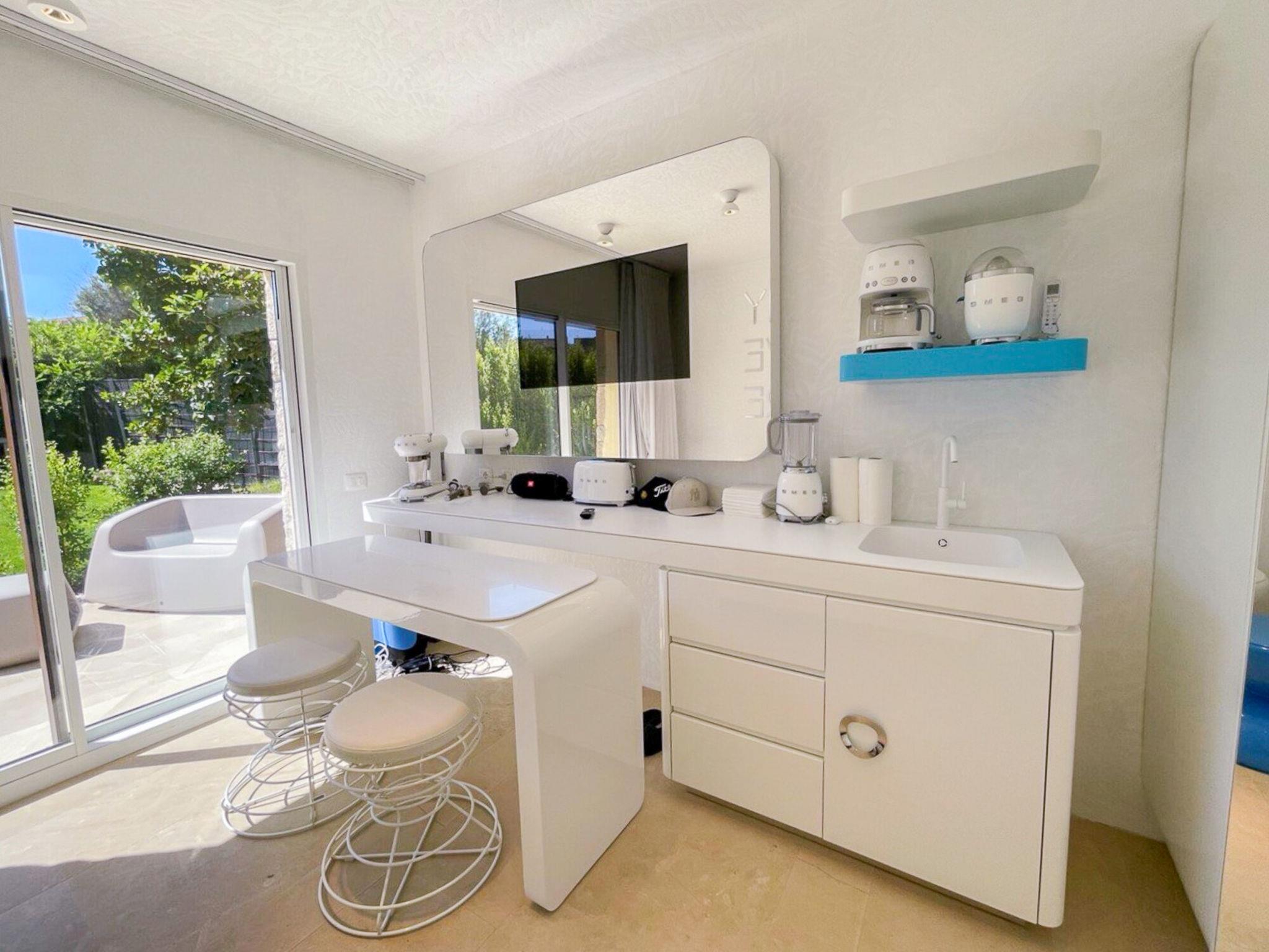 "House Boat Small", 1-room terraced house 20 m2. Bright, very modern and stylish furnishings: living/sleeping room with 1 double sofabed, dining table and satellite TV. Exit to the terrace. Kitchenette (3 hot plates, dishwasher, kettle, freezer, electric coffee machine, combination microwave). Shower/WC. Electric heating, air-conditioning. Small terrace, small garden. Terrace furniture. Facilities: washing machine, dryer. Parking (1 car). Please note: non-smokers only. IT090092C2000T2020