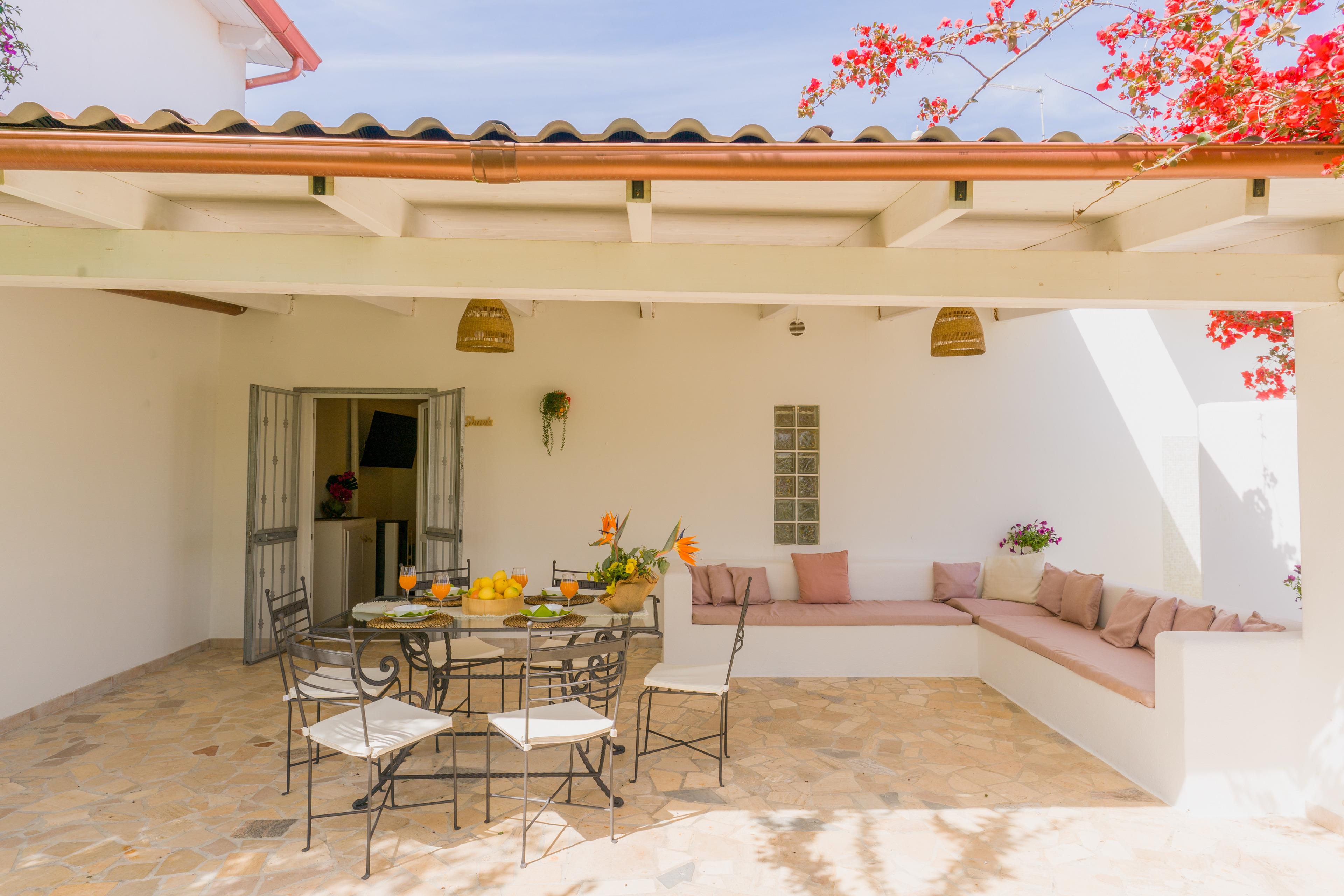 Im Freien haben Sie eigene Räume, einen Esstisch, Wohnzimmer, Grill und Dusche nach dem Strand;