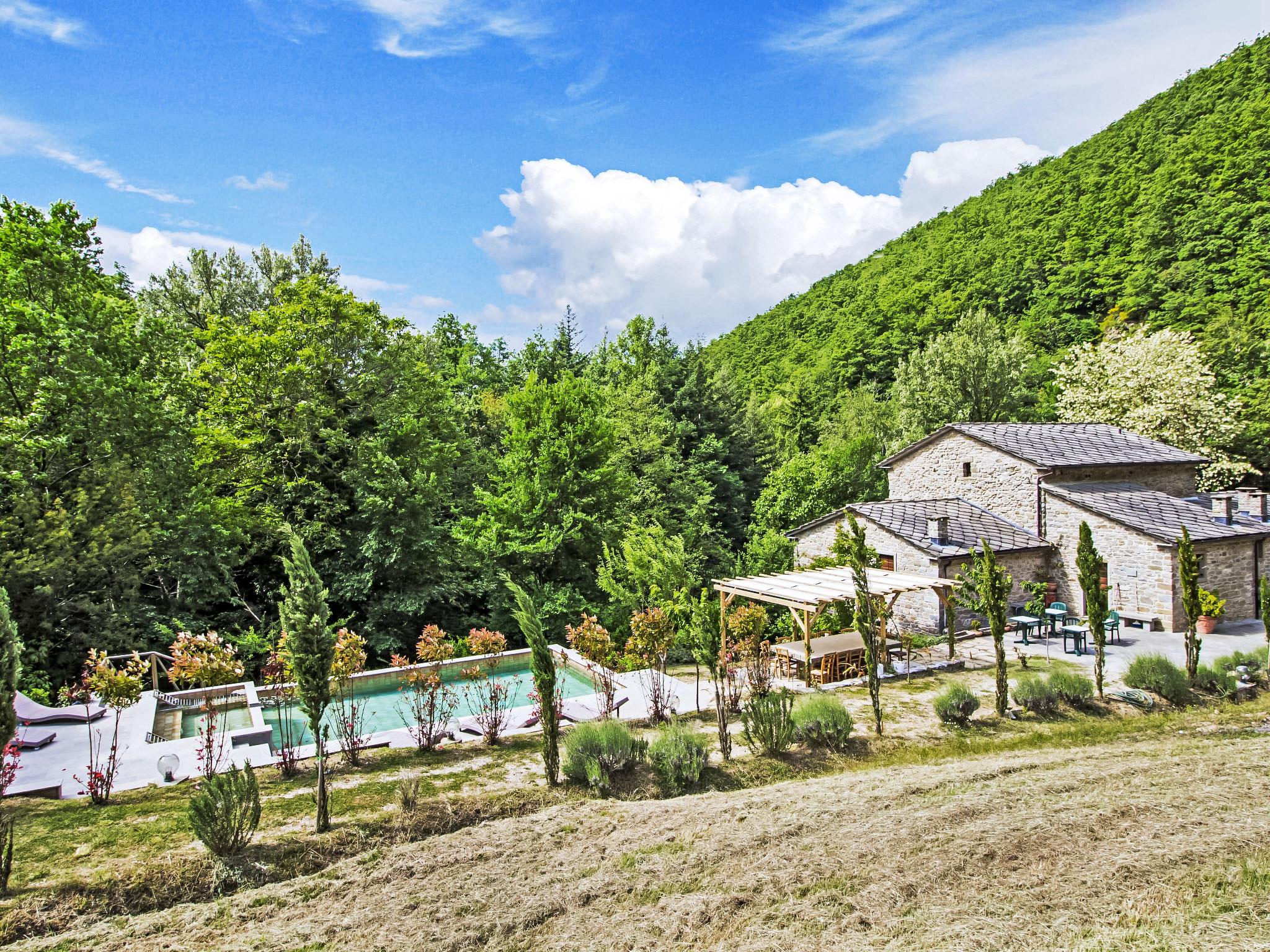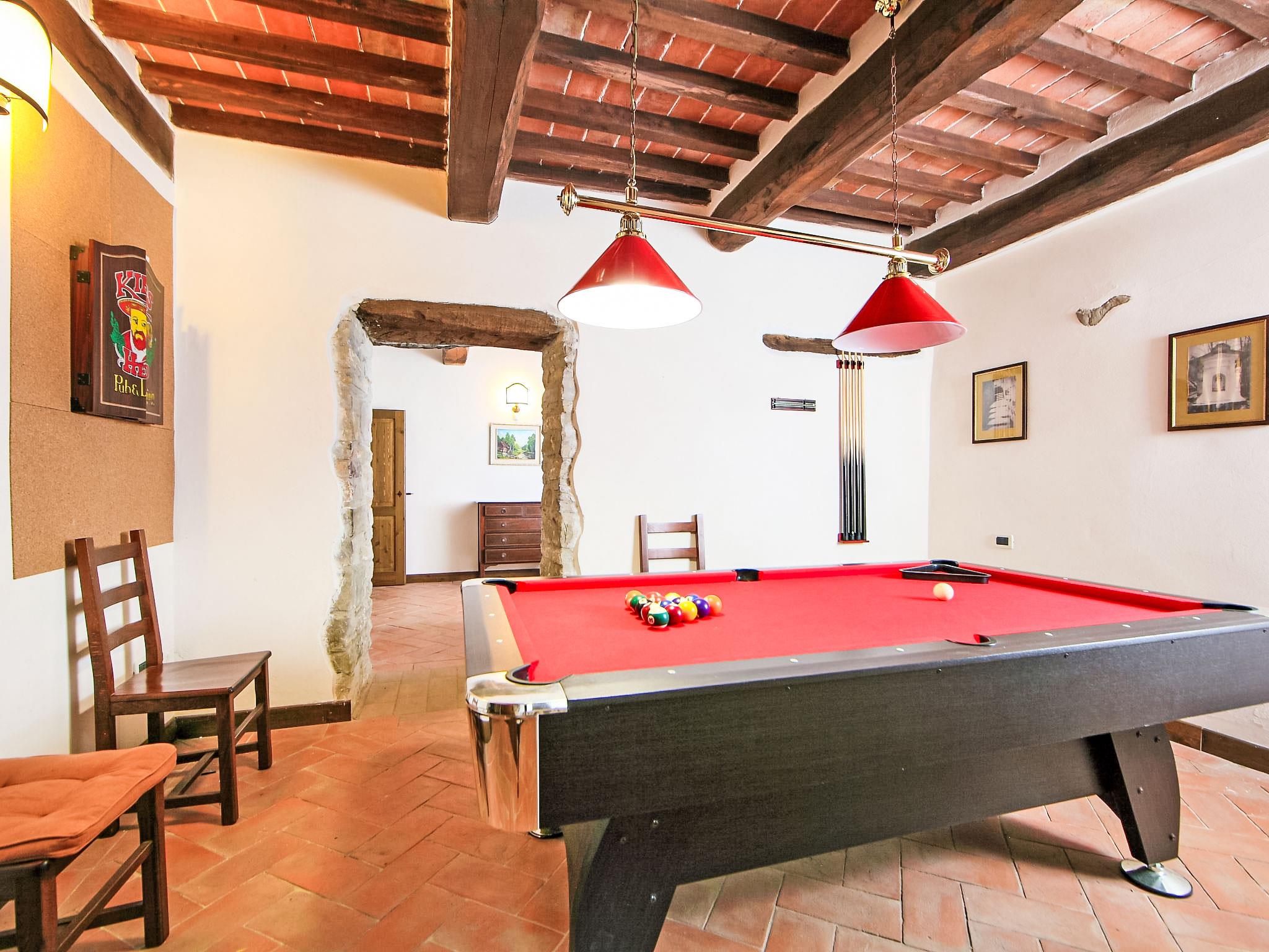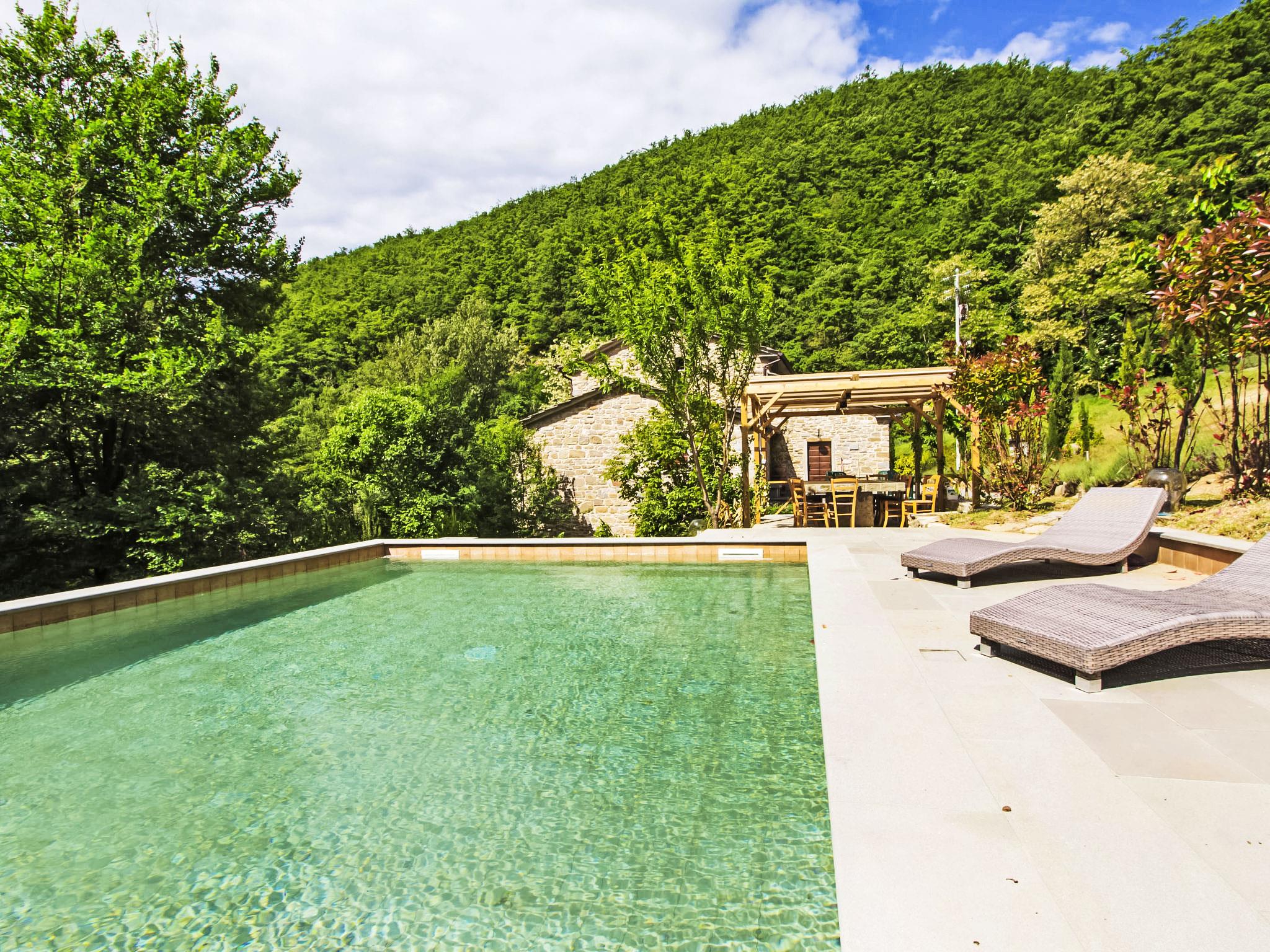 Country house "La Valchiera", renovated, surrounded by trees. 5 km from the centre of Sansepolcro, in a quiet, sunny, elevated position, 10 m from the river. Private: property 20 ha, terraced garden, natural pond, swimming pool (10 x 5 m, depth 100 - 130 cm, seasonal availability: 13.May. - 06.Oct.). Hot tub, patio, garden furniture, barbecue, pool maintenance by the owner/gardener. In the house: internet access, infrared sauna, relaxation room, spa area, washing machine, tumble dryer. Cook on request. Parking on the premises. Grocery 4 km, supermarket 4 km, restaurant 2 km, bar 2 km, bus stop 50 m. Riding stable 2 km. Nearby attractions: Anghiari 15 km, Arezzo 40 km.
