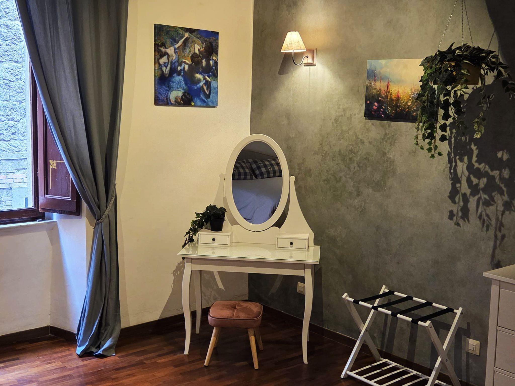 The San Pellegrino district, one of Italy's best-preserved boroughs, is just a stone's throw away, while the Palazzo dei Papi and Piazza del Plebiscito are a short distance away. Free or paid parking is right next door, and transport is convenient: the Piazza Verdi bus stop (5-minute walk) connects the entire city, and the Viterbo Porta Romana station (15-minute walk) offers trains to Rome in just over an hour."
