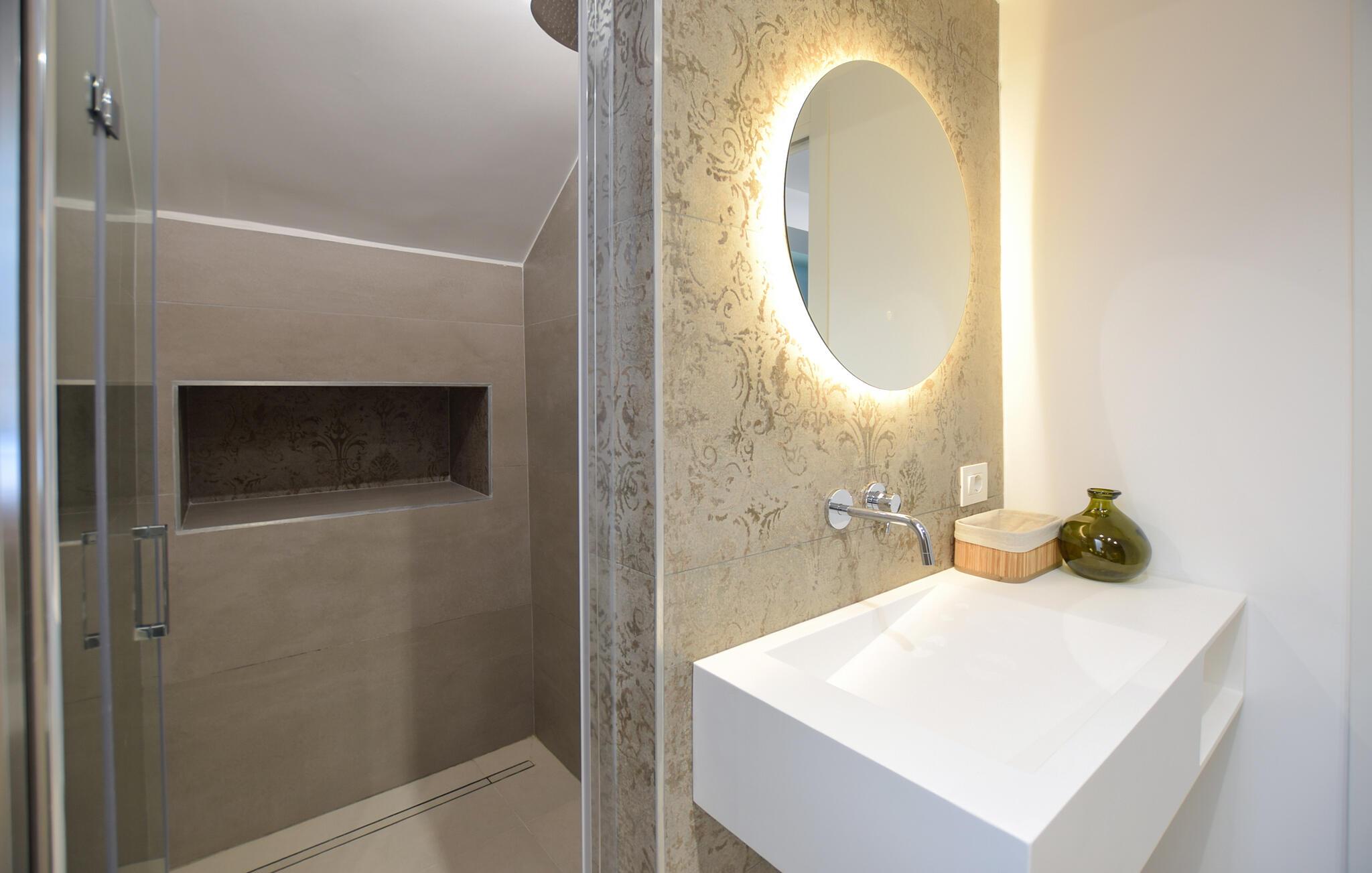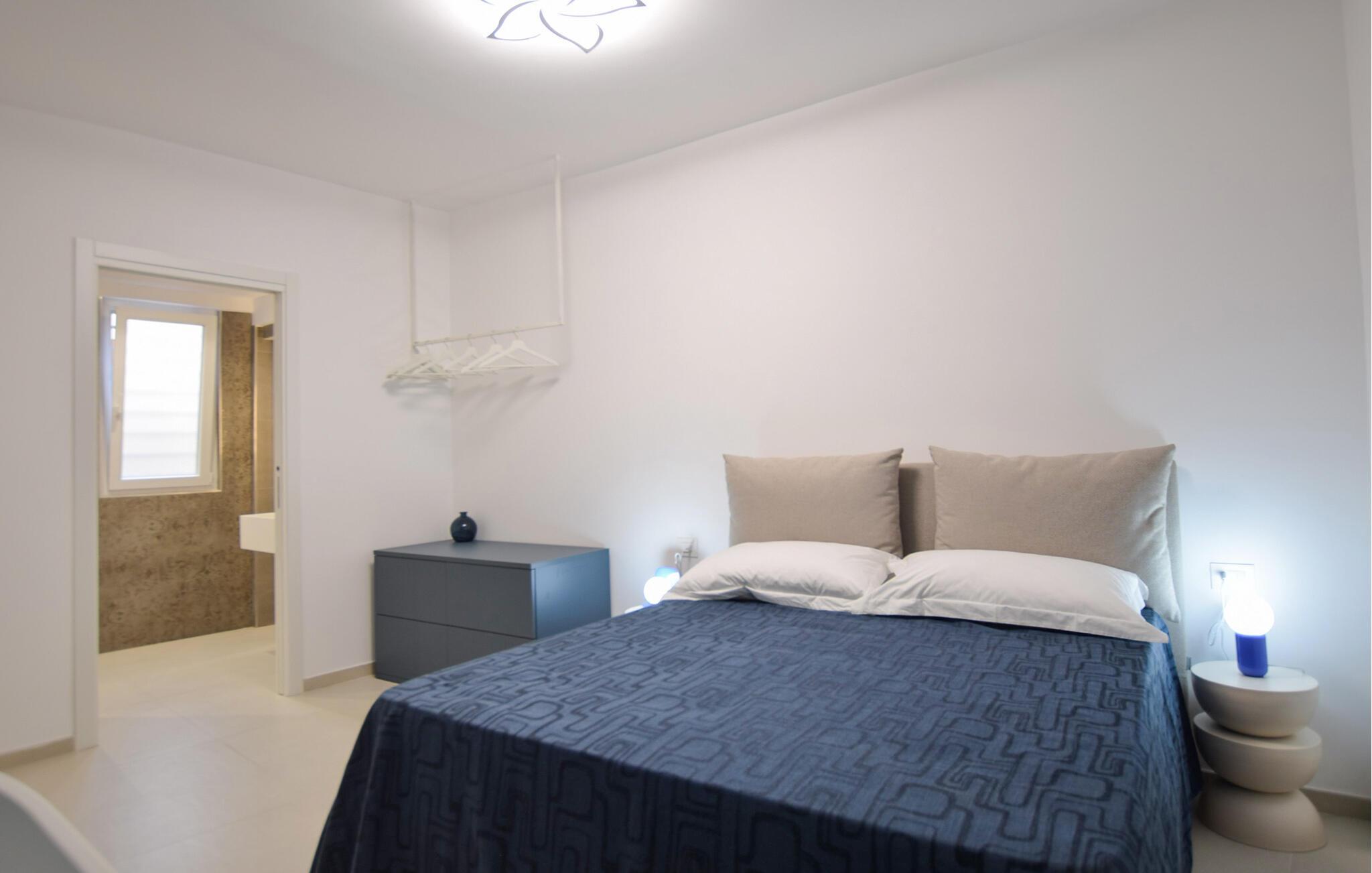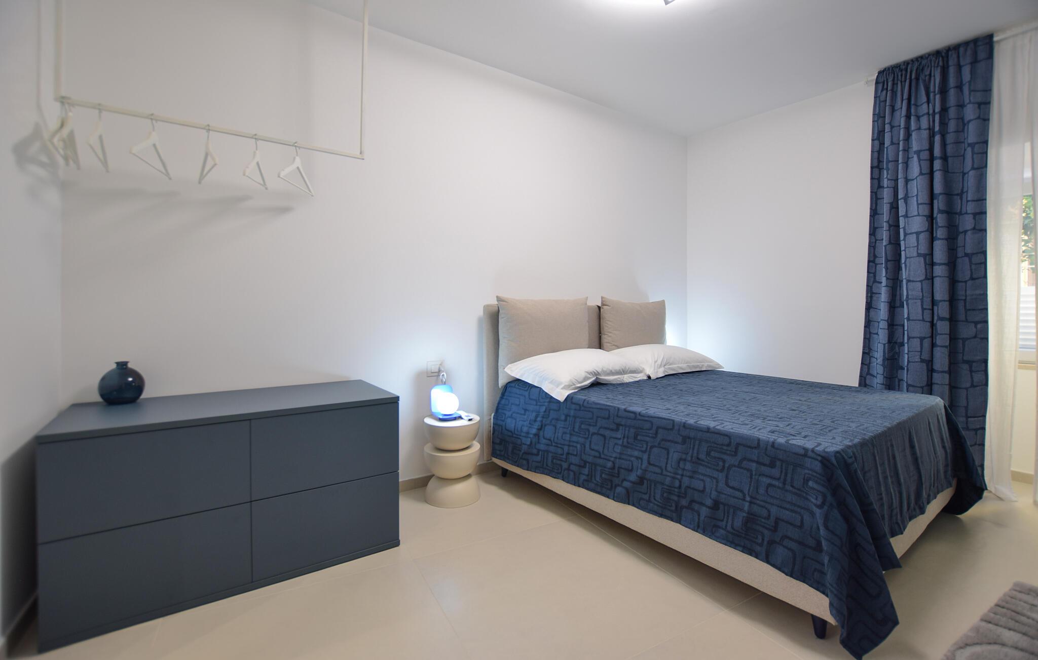 Tilbring ferien i denne stilfulle ferieleiligheten som kombinerer moderne design og middelhavssjarm. I oppholdsrommet føler du umiddelbart det harmoniske samspillet mellom enkelhet og eleganse. Slapp av i de komfortable lenestolene eller nyt måltidene sammen ved det runde spisebordet. De duse fargene, materialene av høy kvalitet og de stilfulle detaljene skaper en rolig og behagelig atmosfære. Tilbered små retter i den moderne kjøkkenkroken med glatte overflater og minimalistisk utstyr, og nyt bekvemmeligheten av et gjennomtenkt romkonsept. Badstuen er det perfekte stedet å slappe av om kvelden etter en lang dag med spennende utflukter.