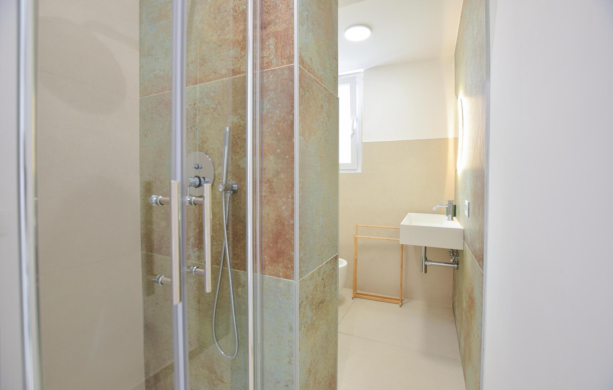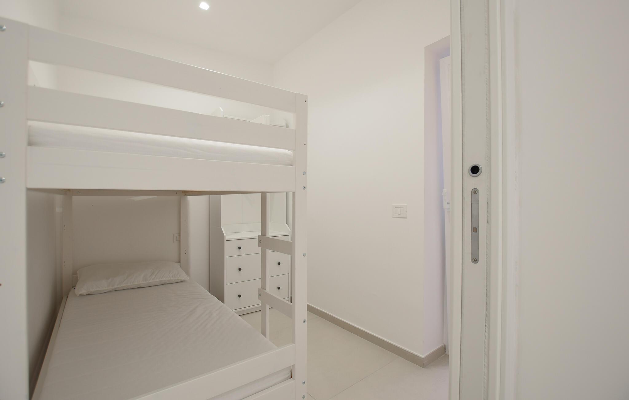 Tilbring ferien i denne stilfulle ferieleiligheten som kombinerer moderne design og middelhavssjarm. I oppholdsrommet føler du umiddelbart det harmoniske samspillet mellom enkelhet og eleganse. Slapp av i de komfortable lenestolene eller nyt måltidene sammen ved det runde spisebordet. De myke fargetonene, materialene av høy kvalitet og de stilfulle detaljene skaper en rolig og behagelig atmosfære. Tilbered små retter i den moderne kjøkkenkroken med glatte overflater og minimalistisk utstyr, og nyt bekvemmeligheten av et gjennomtenkt romkonsept.