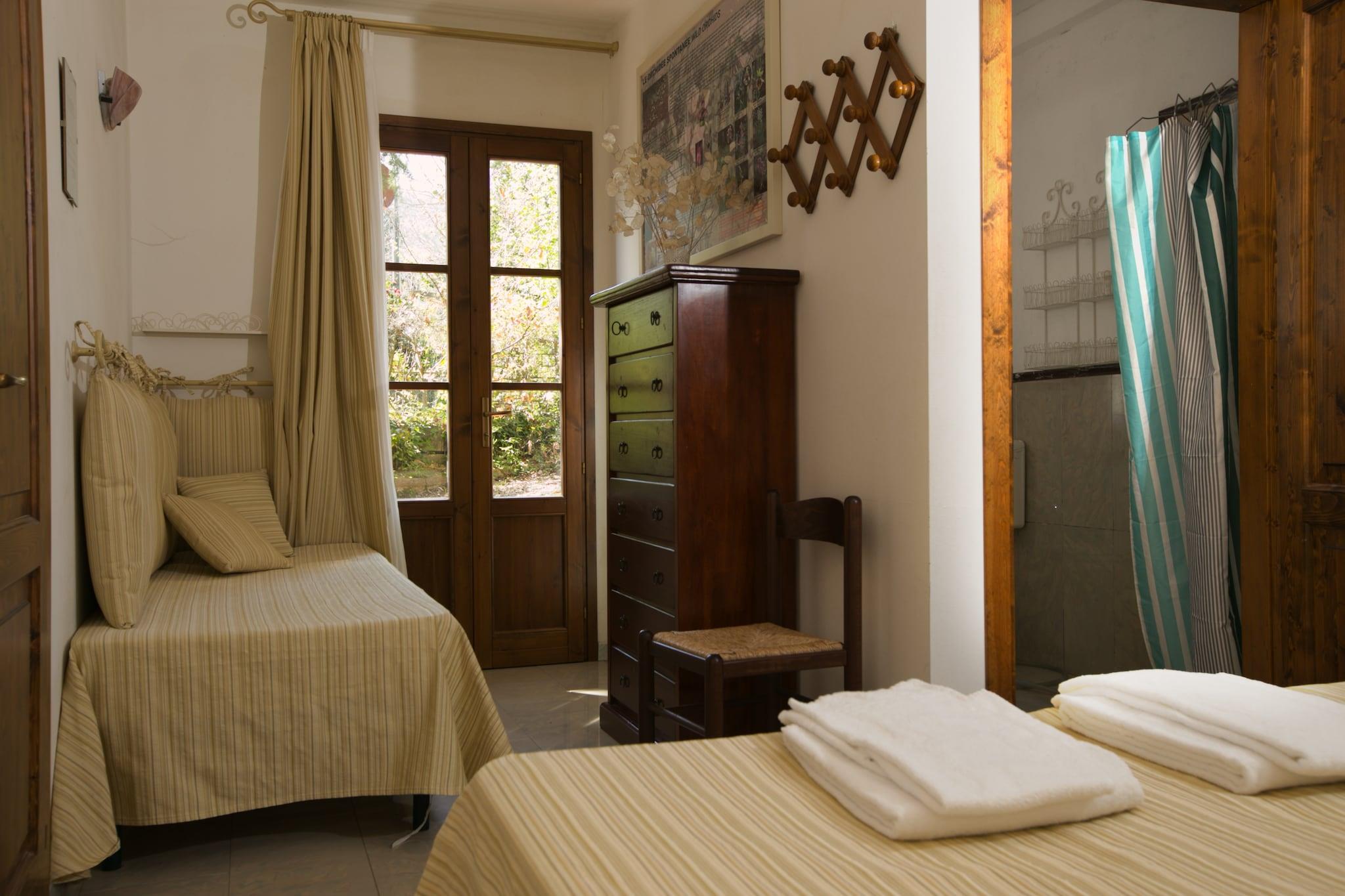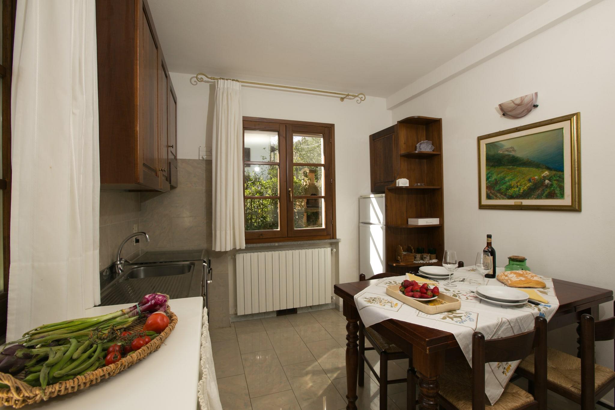 Denne store leiligheten med felles svømmebasseng ligger i en villa fra sekstitallet i et kupert område nær Sassetta, i 500 meters høyde. I villaen er det enda en leilighet. Denne sjarmerende leiligheten har blitt komfortabelt innredet og er utstyrt med alle fasiliteter. I det velutstyrte kjøkkenet kan du selvfølgelig tilberede et deilig toskansk måltid under oppholdet. Peisen gir behagelig varme på kjøligere dager. Om sommeren kan du nyte solen ute eller, i skyggen av kastanjetrærne i hagen, med en god bok. Det er også hyggelig å slappe av ved svømmebassenget, som du deler med de andre gjestene. Du finner butikker og en restaurant i Sassetta, 1 kilometer unna. For en dag med sol, hav og strand, ta turen til Marina Castagneto Carducci, som ligger 12 kilometer unna. Det er også en unik botanisk hage her, som tilhører eieren. Denne hagen er kun åpen for gjester, og den er absolutt verdt et besøk. Kulturelskere kan finne det de leter etter i de vakre byene Pisa, Lucca, Piombino, Livorno og Grosseto. -- Oppvarming valgfritt og betales på stedet til lokal takst. -- Gjester bes følge lokale regler angående avfall. Ved overtredelse kan en bot bli belastet av eieren. --