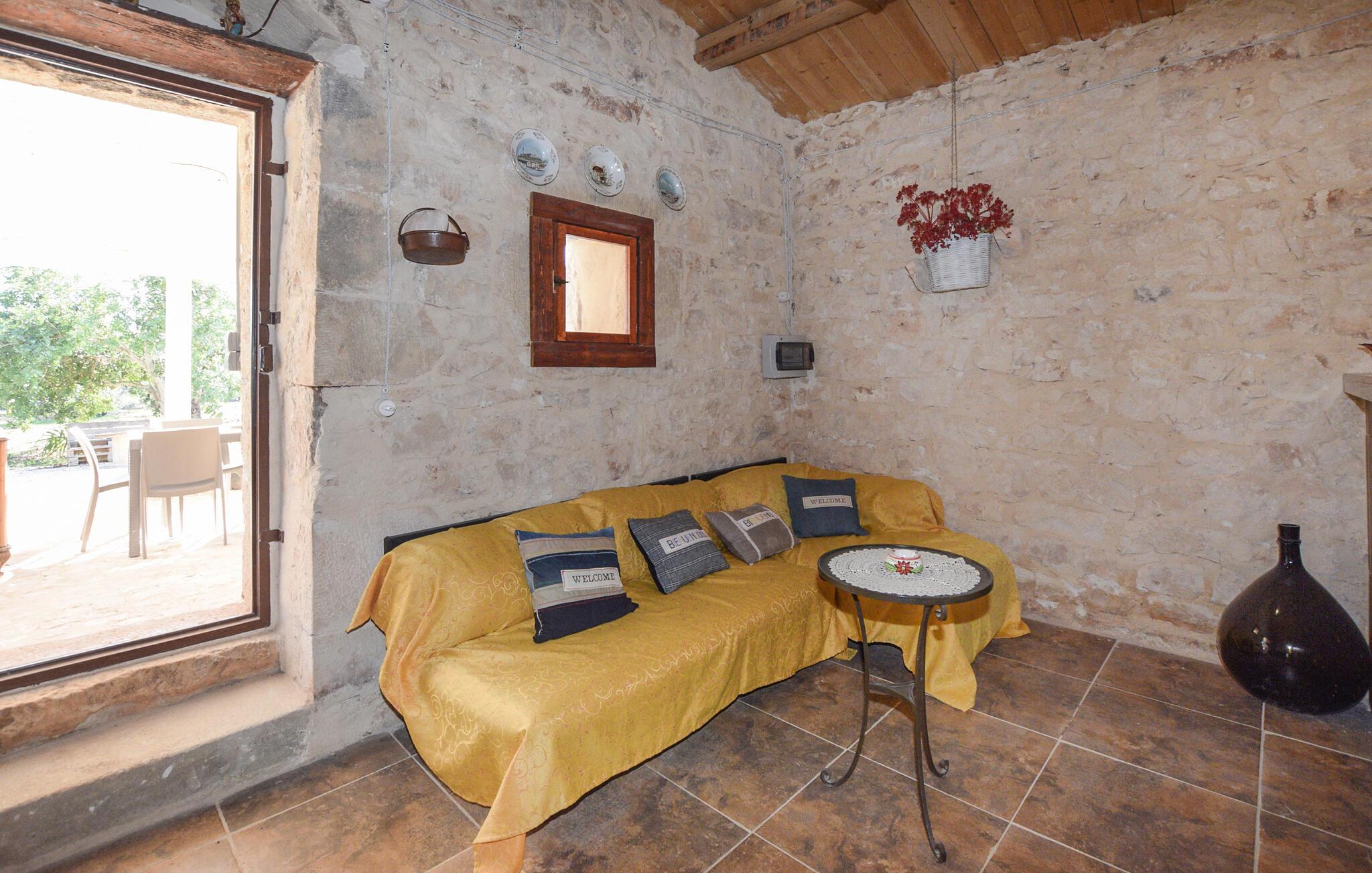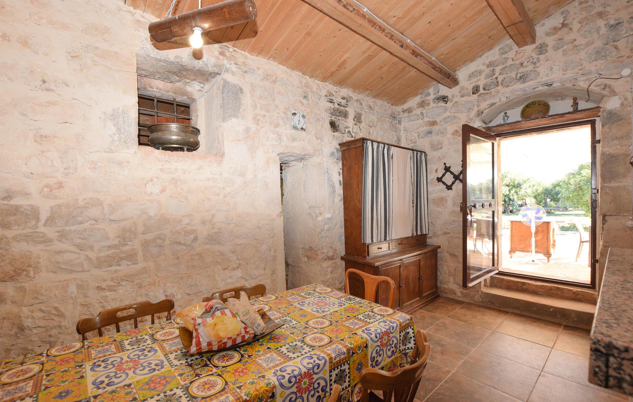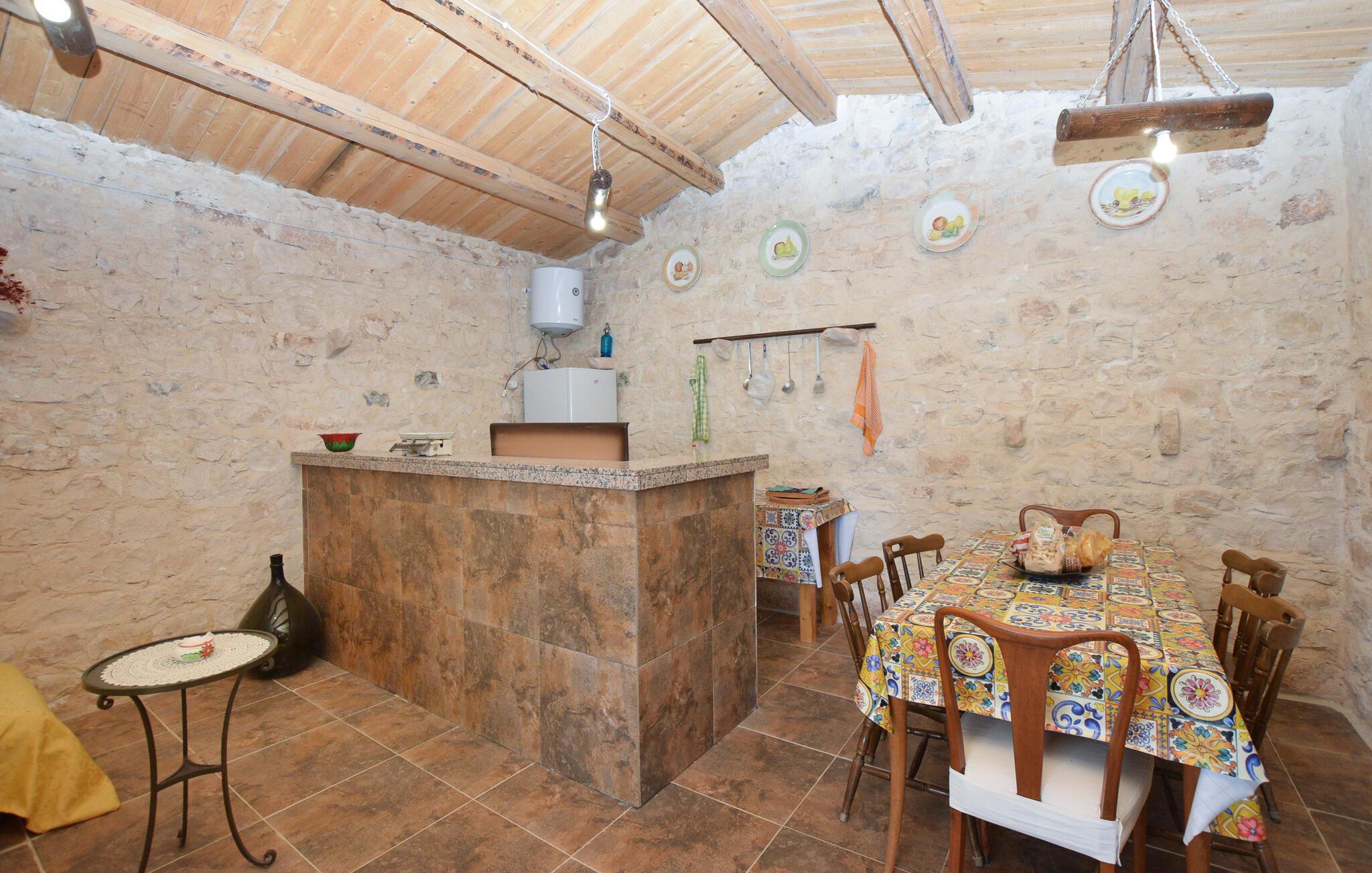 Dette koselige feriehuset ønsker deg velkommen med en harmonisk atmosfære av natursteinvegger og pene tretak. Et fullt utstyrt, rustikt kjøkken og en stilfull spiseplass med fargerike aksenter inviterer til hyggelige måltider. Sett deg godt til rette i den koselige sittegruppen og slapp av - det perfekte stedet for å nyte husets ro.
