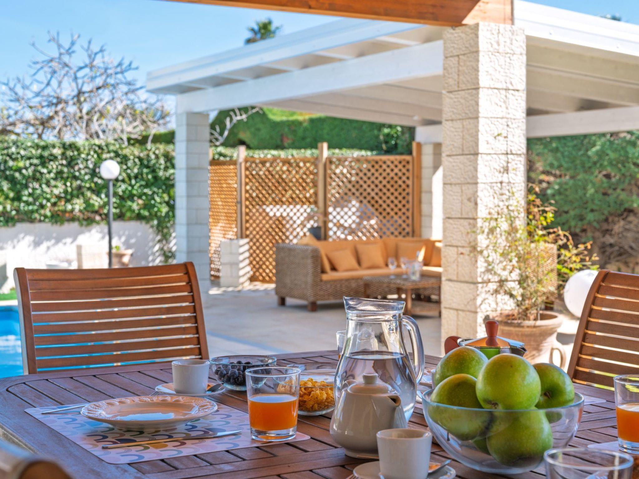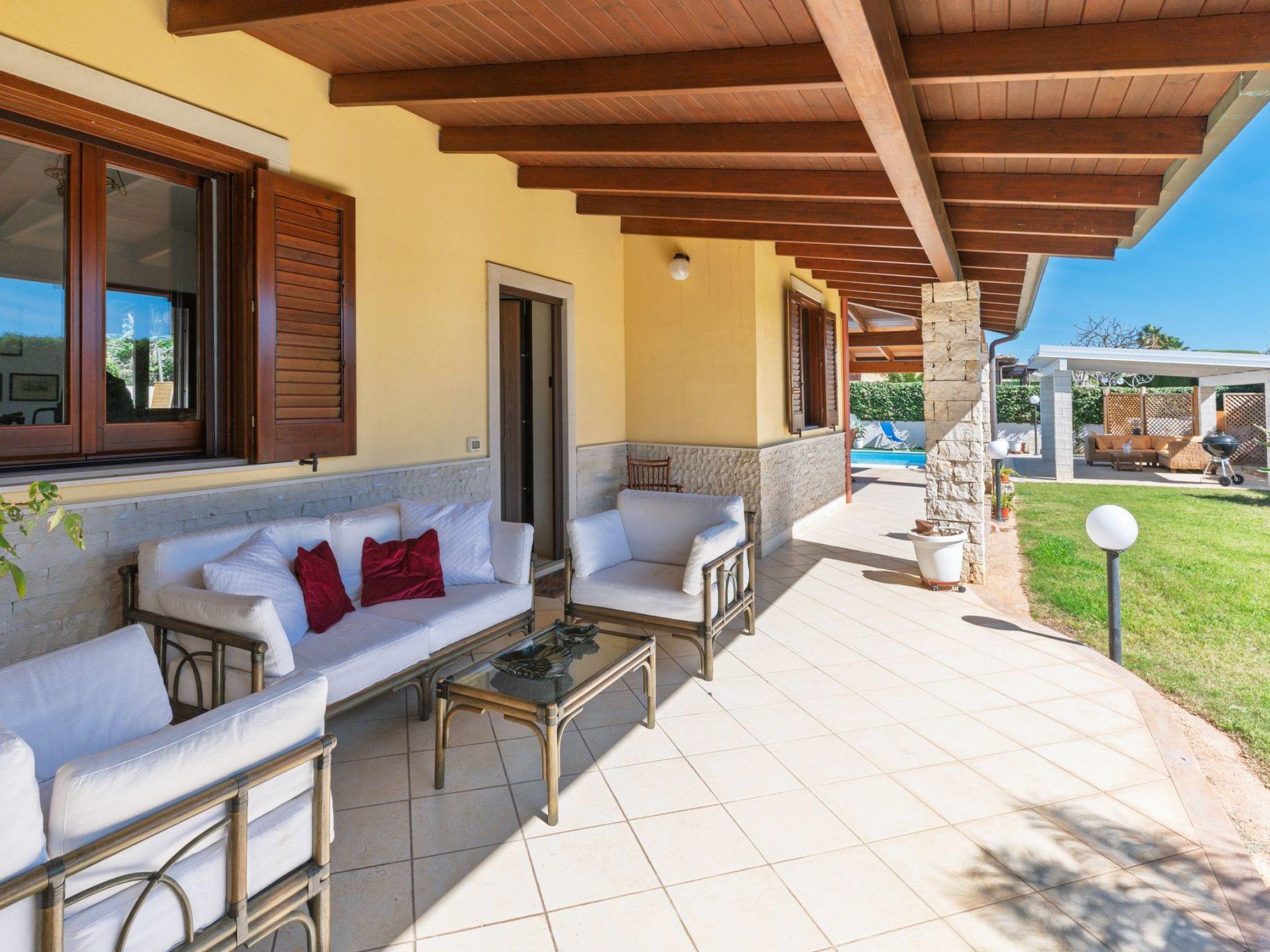 The villa enjoys numerous outdoor spaces where you can relax: a large terrace surrounds the entire house and is furnished with outdoor lounges and a dining table, a gazebo by the pool with a sofa and armchairs, and a relaxation corner in the shade of a charming century-old olive tree.