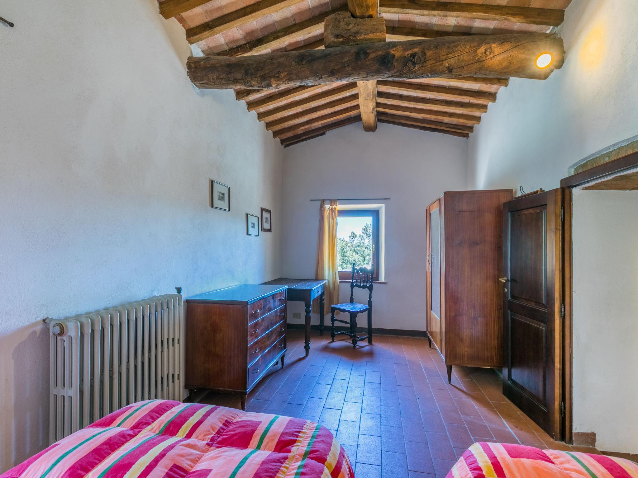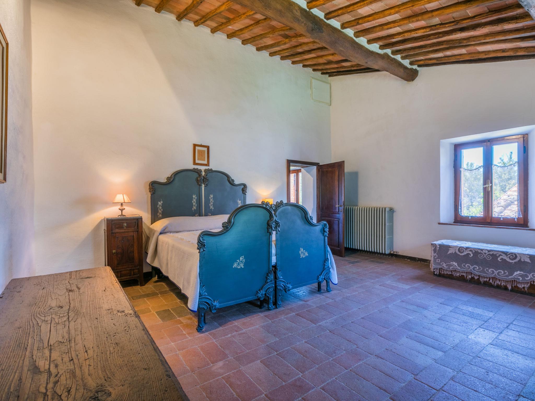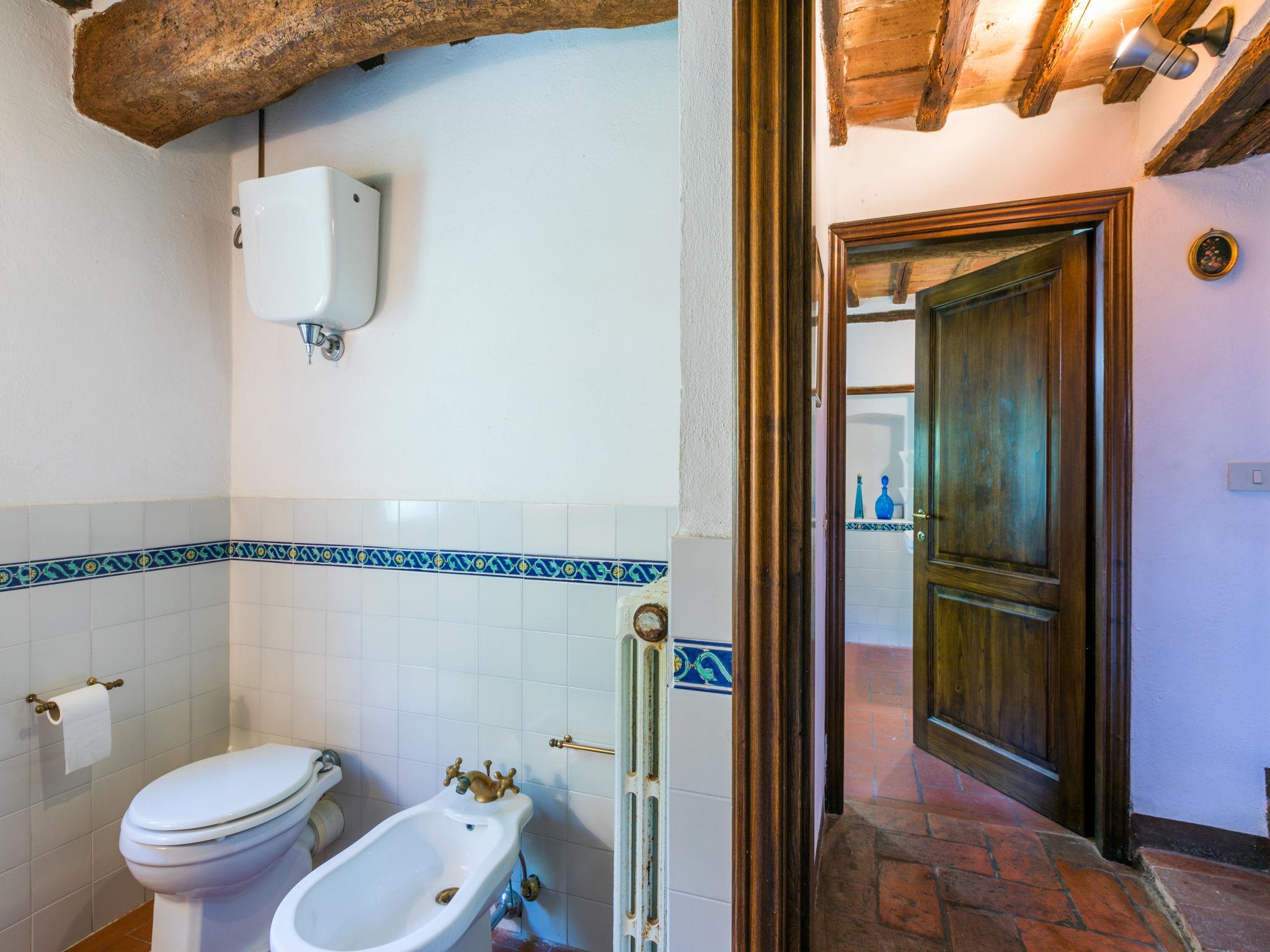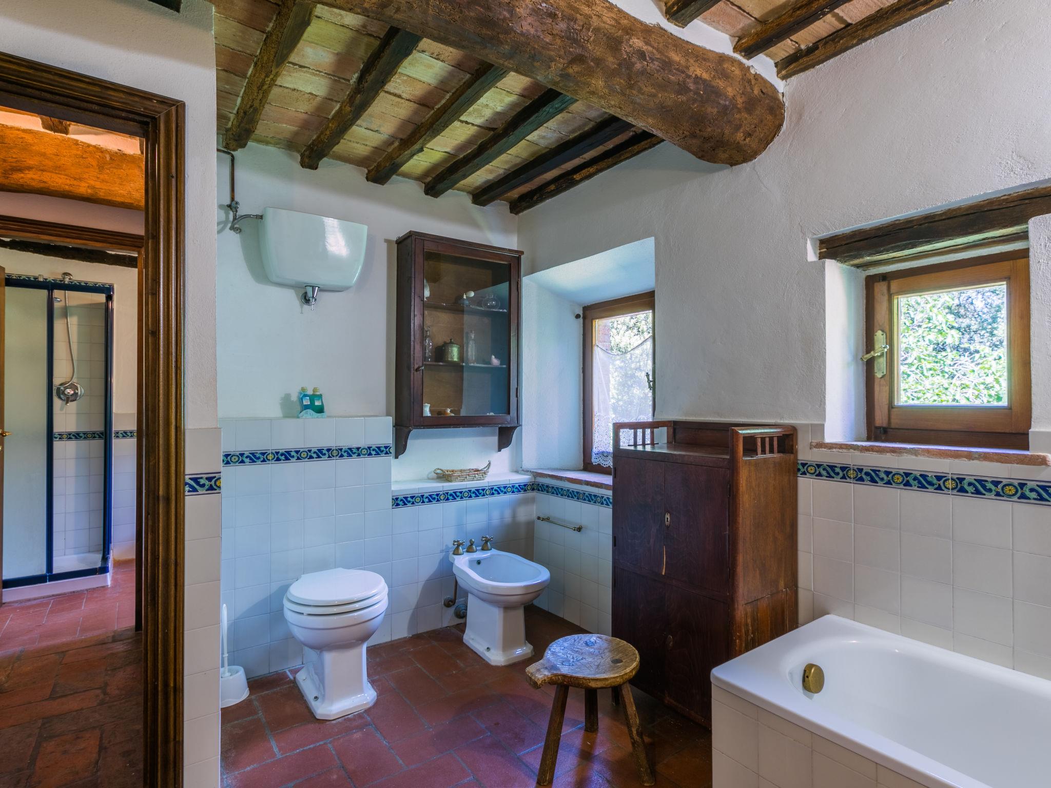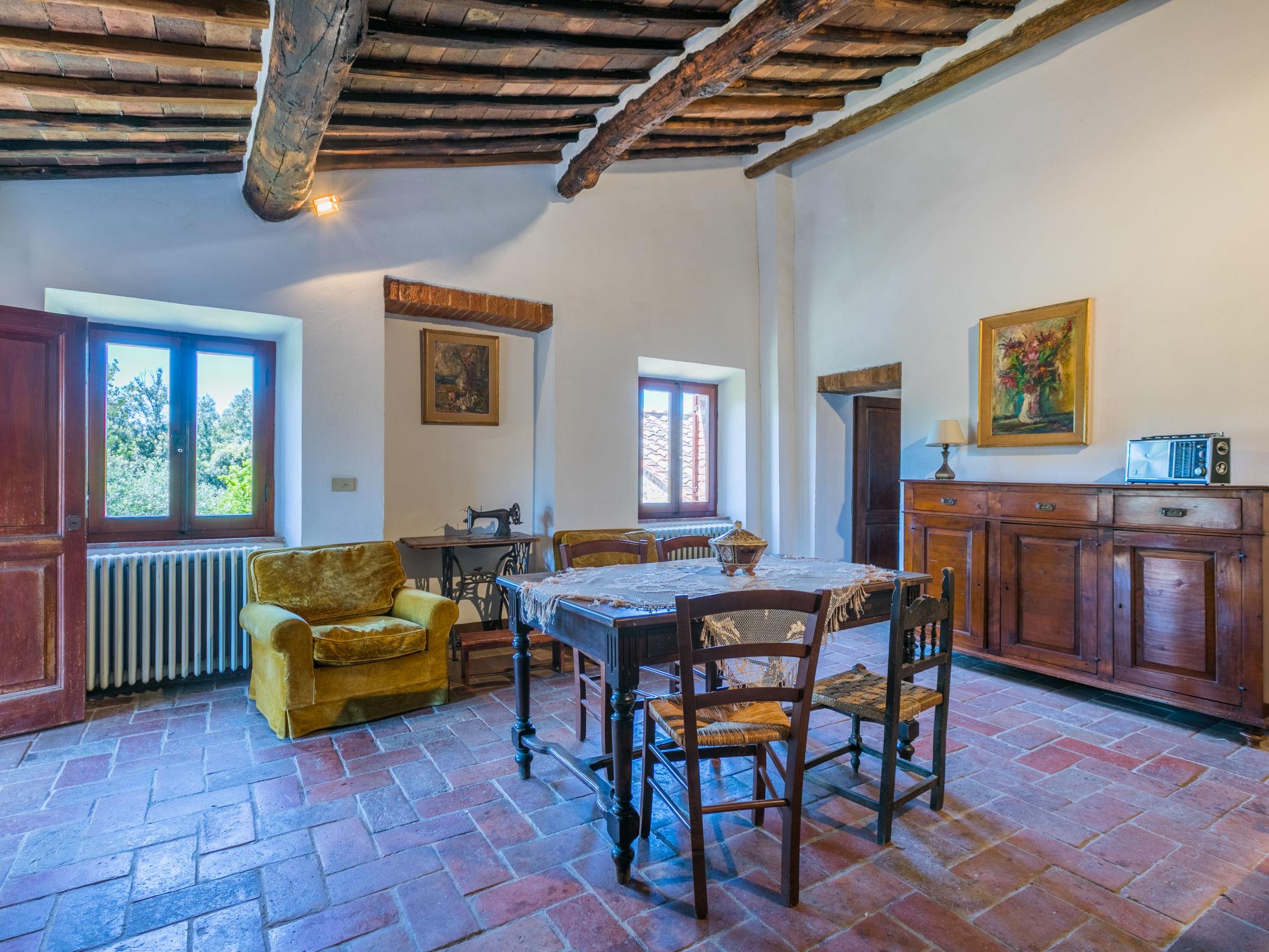 "Casino di Lecceto", 6-room house 250 m2 on 3 levels. Spacious, rustic and antique furnishings: large living/dining room with open-hearth fireplace, dining table and TV. Exit to the garden, to the terrace. Large kitchen (oven, dishwasher, 4 gas rings, toaster, kettle, freezer, electric coffee machine) with dining table. Exit to the loggia. Shower/bidet/WC. Upper floor: living/dining room with open-hearth fireplace and dining table. Exit to the loggia. 1 room with 2 beds. 2 double bedrooms. Bath/bidet/WC, shower/bidet/WC. 2nd upper floor: 1 room with 2 beds. Gas heating (extra). Natural stone floors. Small terrace roofed, patio. Terrace furniture, barbecue, deck chairs, covered balcony, box-room. Facilities: washing machine, children's high chair, baby cot for up to 2 year olds, hair dryer. Internet (WiFi, free). Parking at the house. Please note: non-smokers only. The pool mentioned in the description is for private use. IT052032C2CUAQHV2V