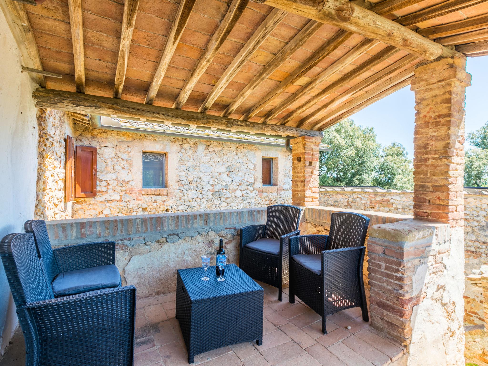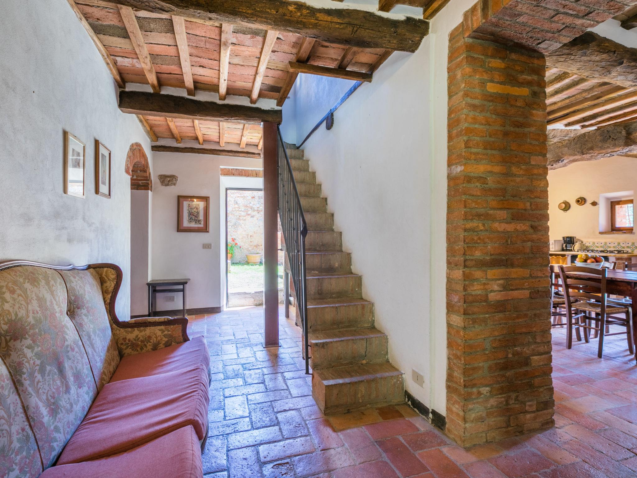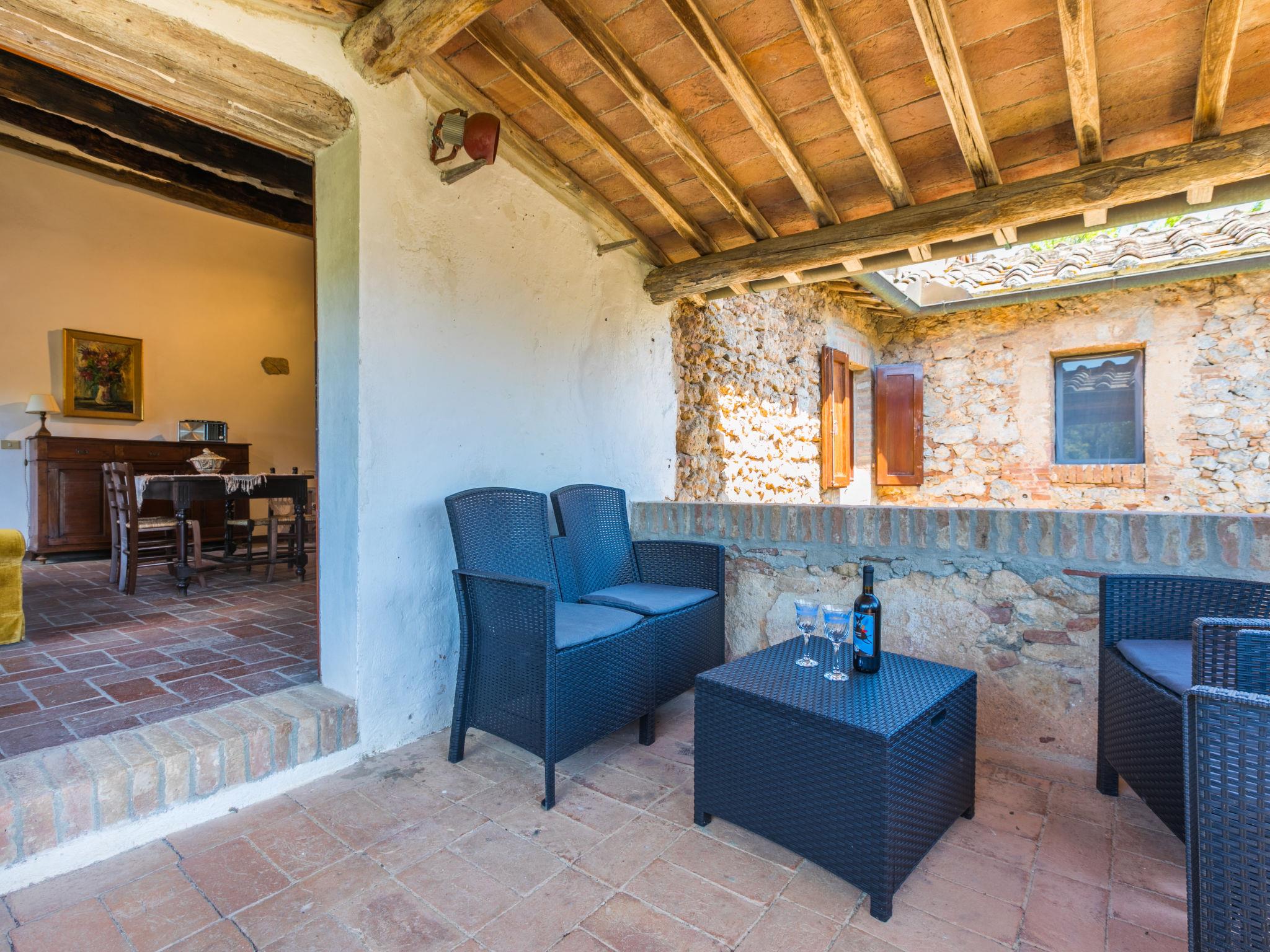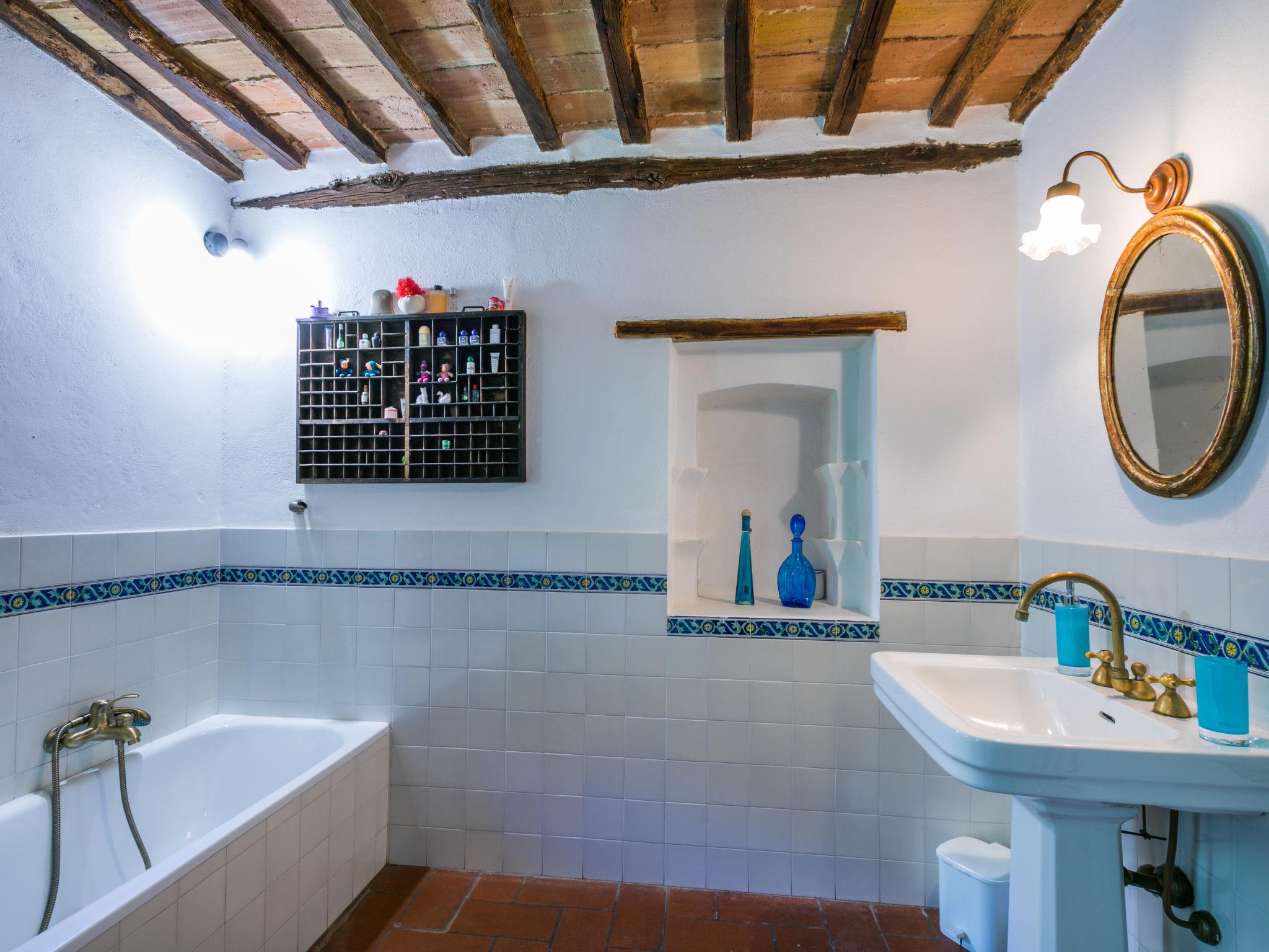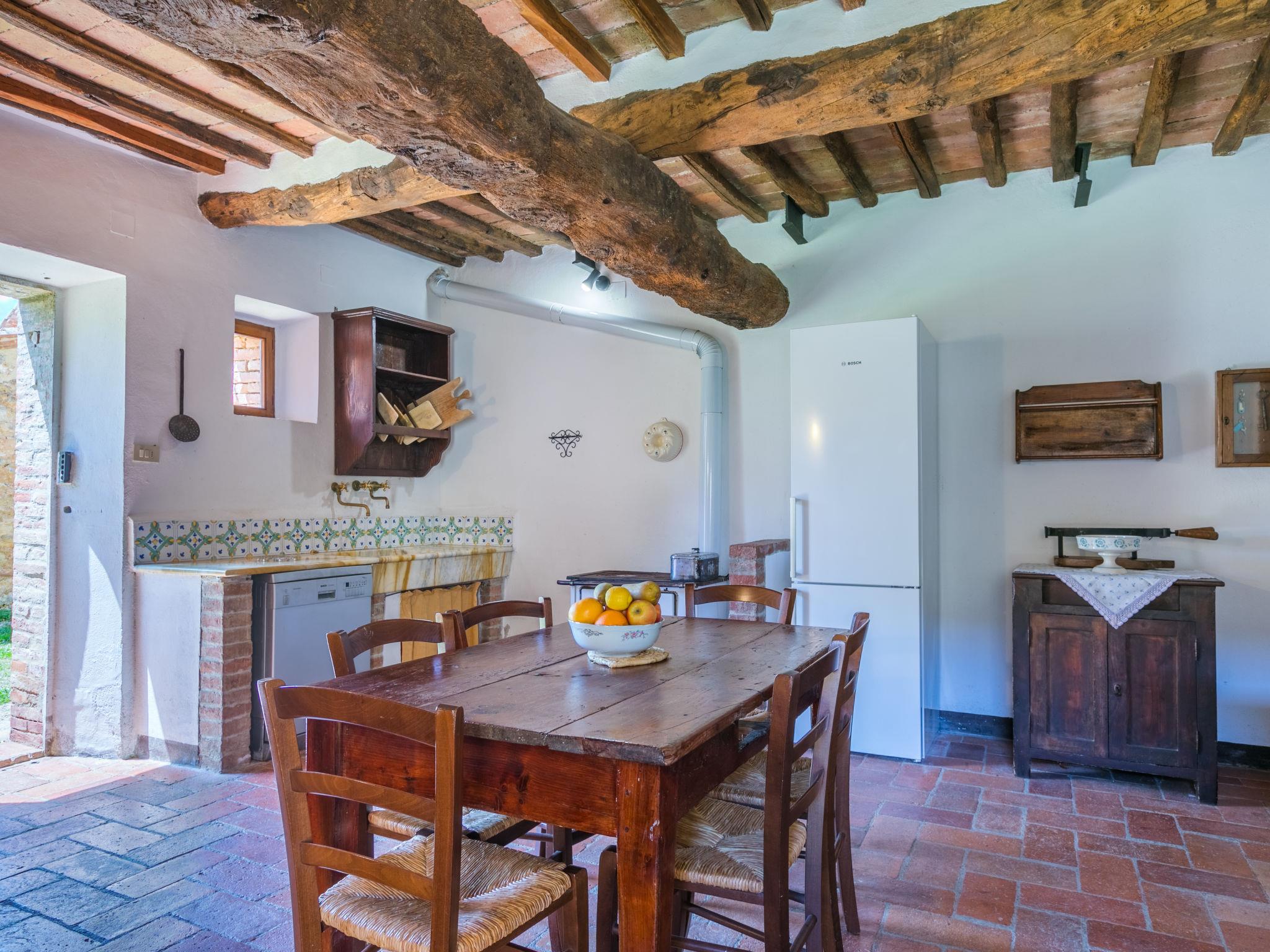 "Casino di Lecceto", 6-room house 250 m2 on 3 levels. Spacious, rustic and antique furnishings: large living/dining room with open-hearth fireplace, dining table and TV. Exit to the garden, to the terrace. Large kitchen (oven, dishwasher, 4 gas rings, toaster, kettle, freezer, electric coffee machine) with dining table. Exit to the loggia. Shower/bidet/WC. Upper floor: living/dining room with open-hearth fireplace and dining table. Exit to the loggia. 1 room with 2 beds. 2 double bedrooms. Bath/bidet/WC, shower/bidet/WC. 2nd upper floor: 1 room with 2 beds. Gas heating (extra). Natural stone floors. Small terrace roofed, patio. Terrace furniture, barbecue, deck chairs, covered balcony, box-room. Facilities: washing machine, children's high chair, baby cot for up to 2 year olds, hair dryer. Internet (WiFi, free). Parking at the house. Please note: non-smokers only. The pool mentioned in the description is for private use. IT052032C2CUAQHV2V