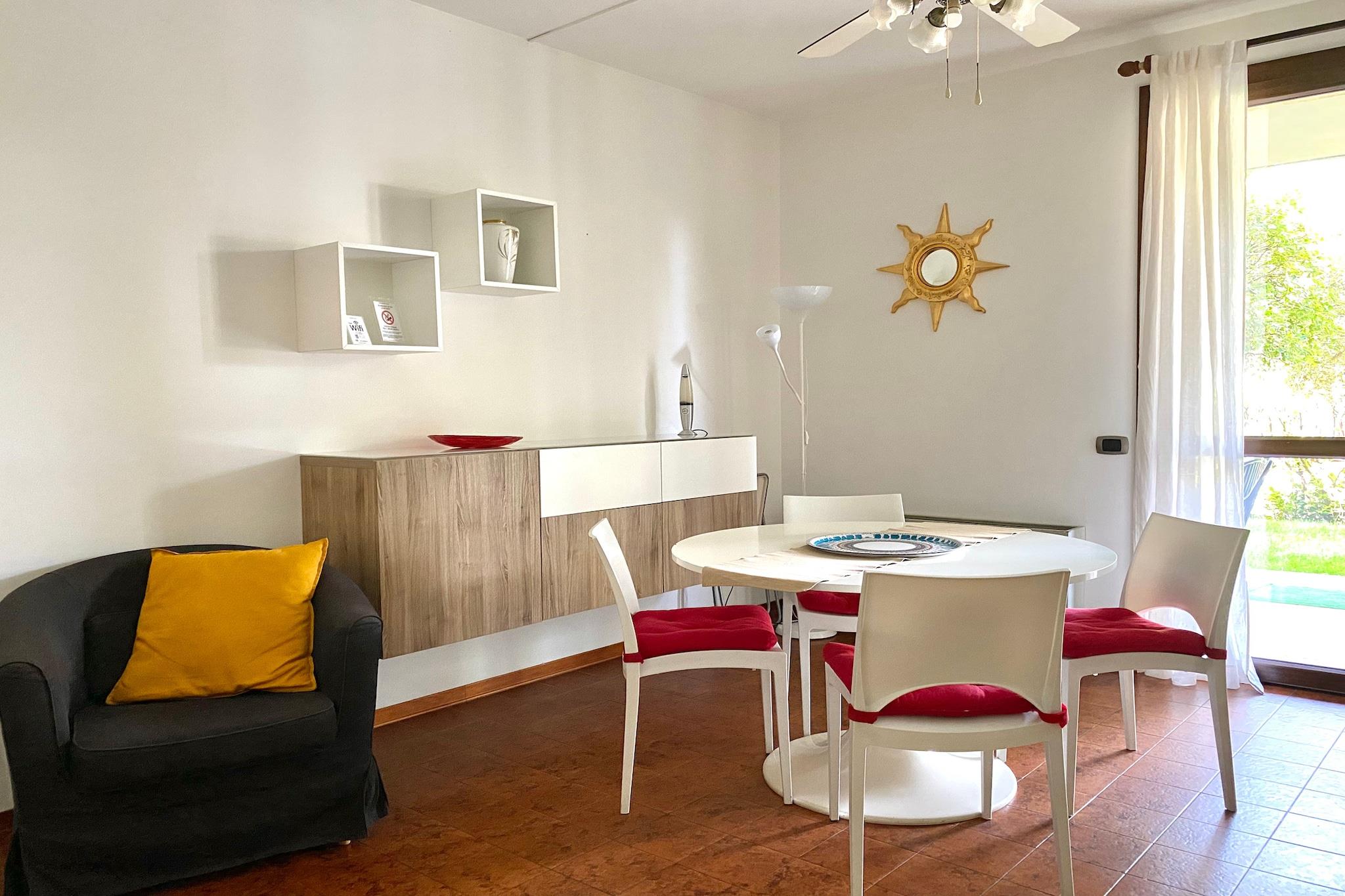 Nyt en avslappet og kjæledyrvennlig ferie i denne sjarmerende leiligheten i første etasje i Sirmione, kun 100 meter fra Gardasjøen. Perfekt for familier eller par, hjemmet har plass til 4 gjester og tilbyr WiFi, en koselig stue med dobbel sovesofa og satellitt-TV, et fullt utstyrt kjøkken med oppvaskmaskin og kaffemaskin, og to soverom, ett med dobbeltseng og det andre med køyeseng. Start morgenen med kaffe på den private terrassen eller slapp av i hagen som er møblert med uteservering. Boligen har også bad med dusj og bidet, klimaanlegg, oppvarming, vaskemaskin og garasjeparkering med sykkelbod. Ligger kun 3 km fra Sirmiones historiske sentrum og en kort kjøretur fra Jamaica Beach, Gardaland og Verona, er det en perfekt base for avslapning ved innsjøen og morsomme dagsturer.