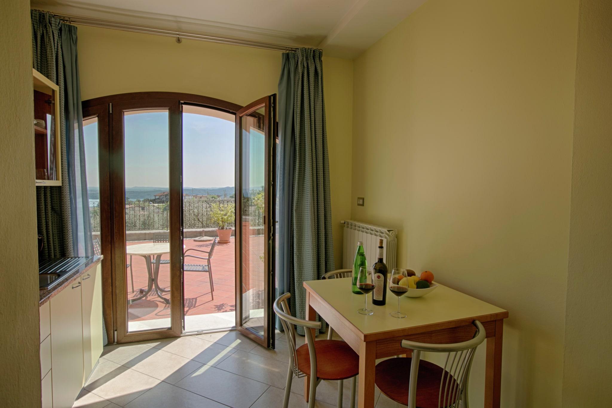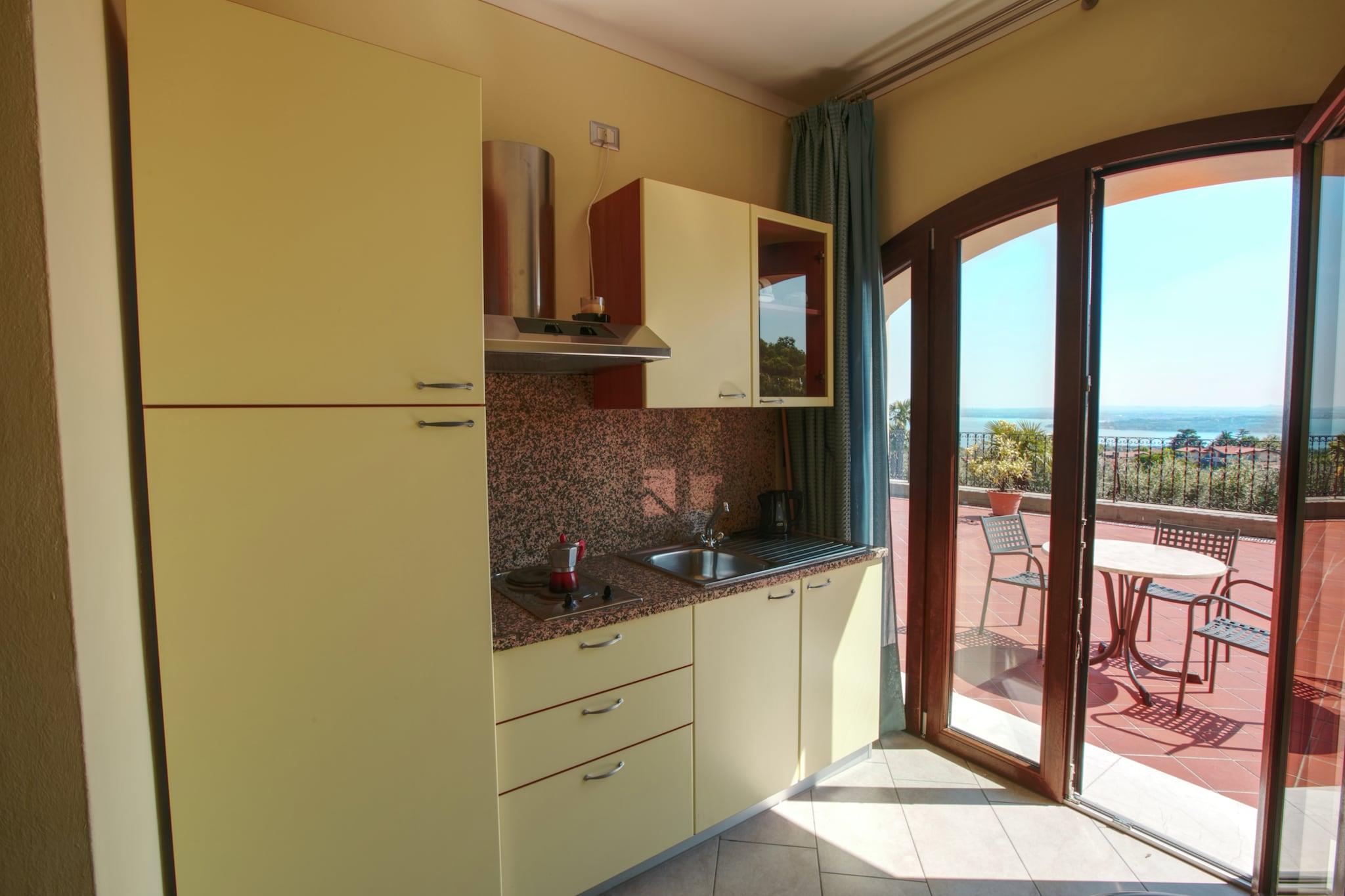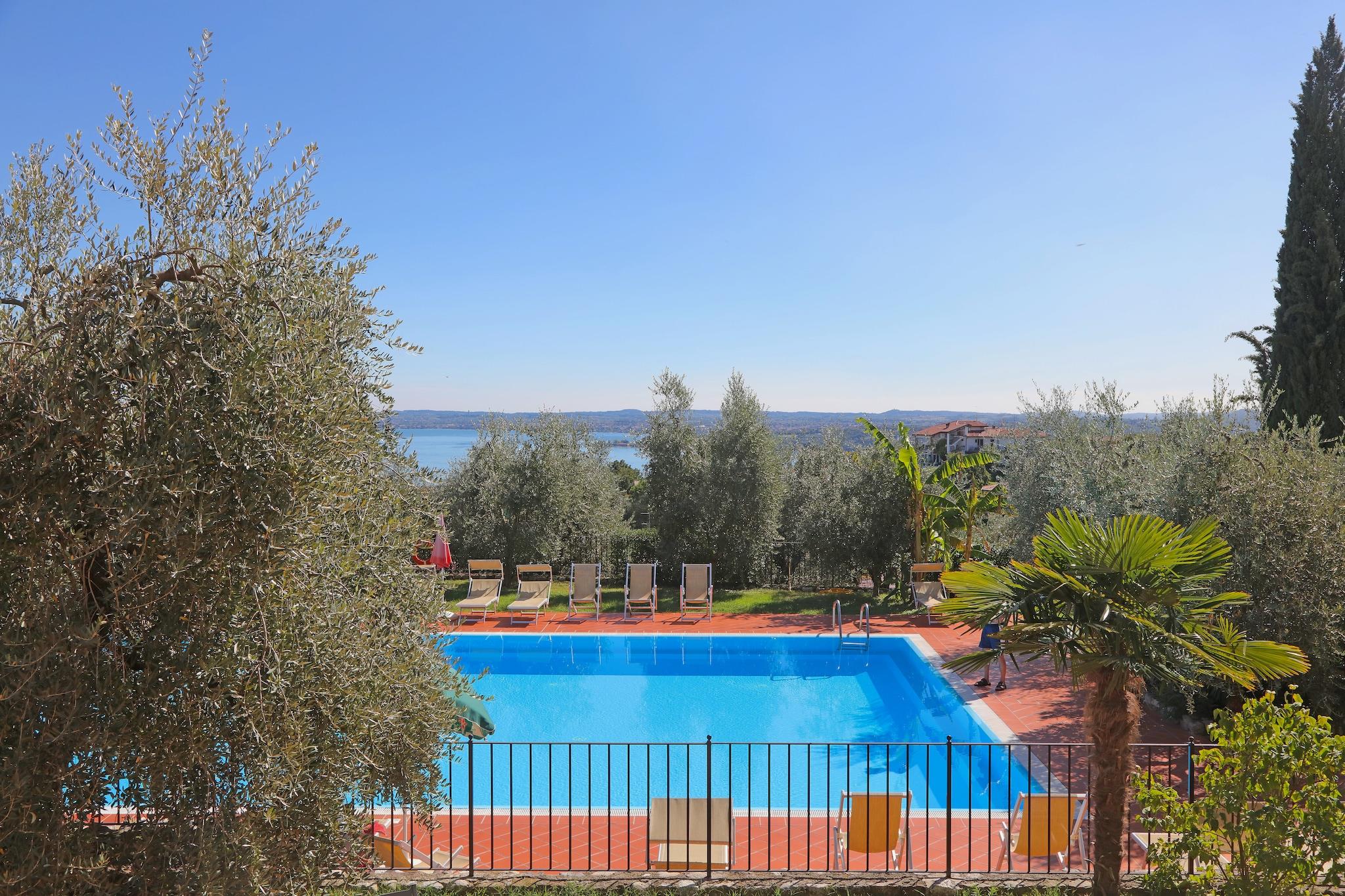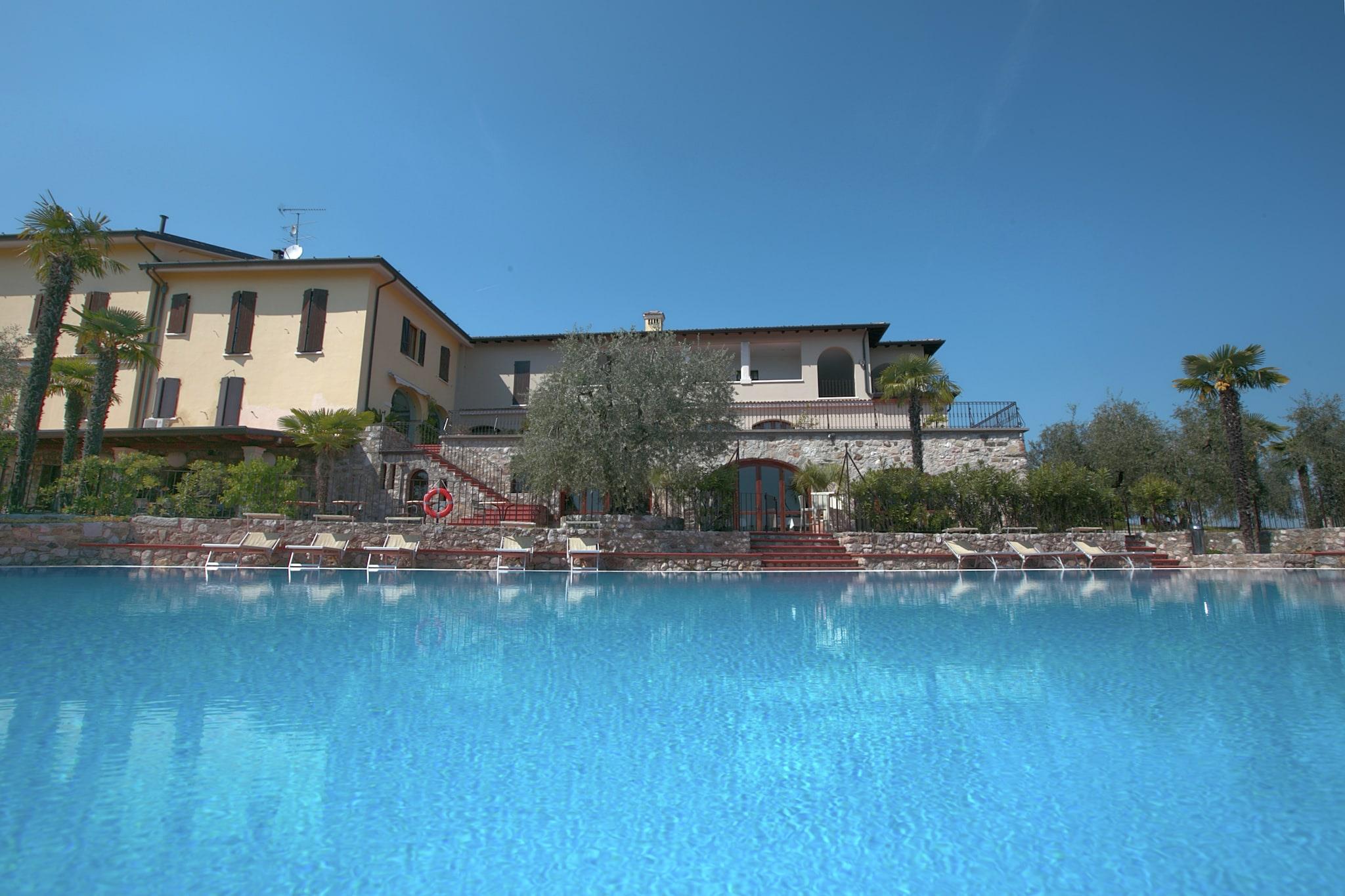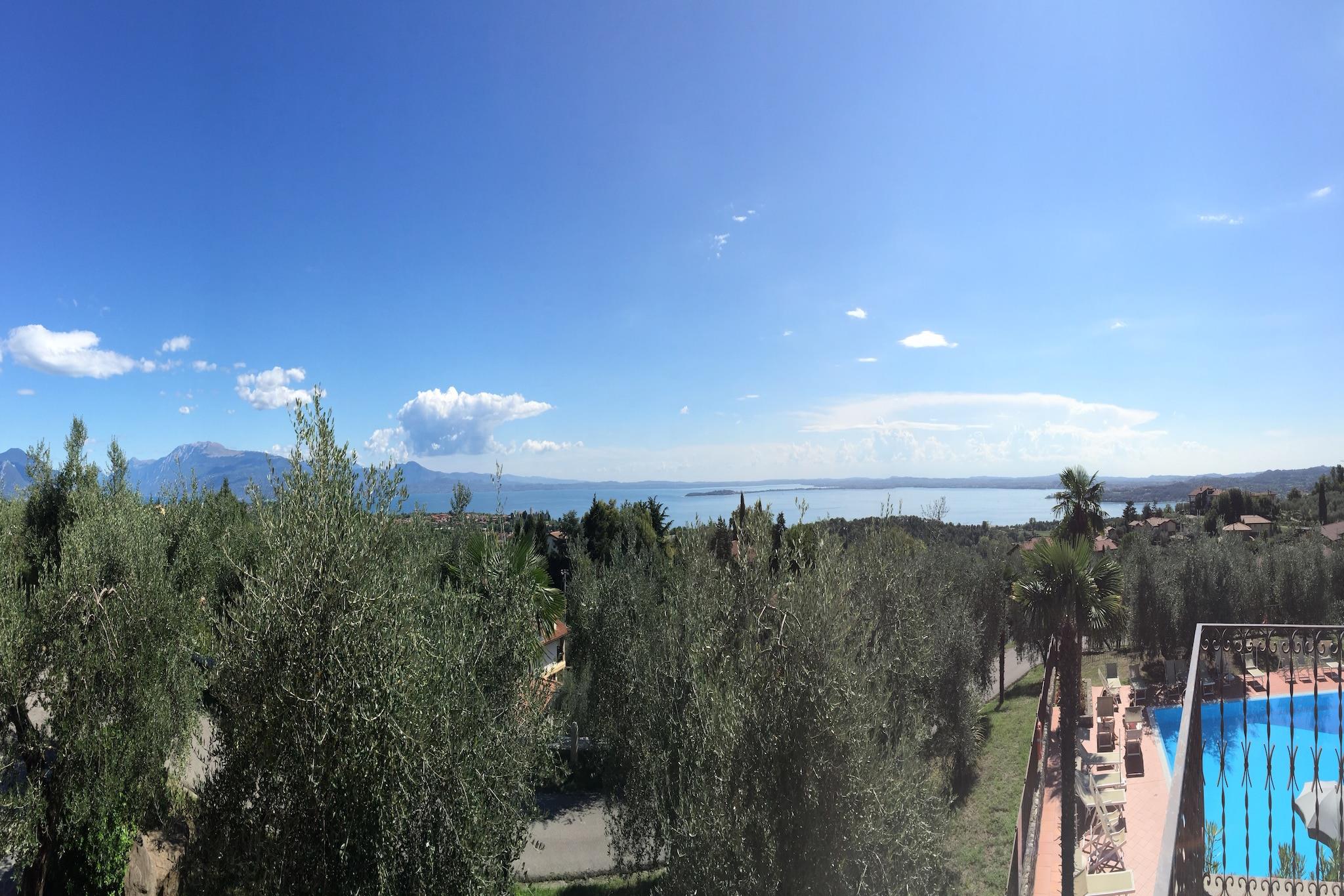 På toppen av en ås er det et vakkert hjem med 20 enkle, men likevel pent møblerte leiligheter og med en vakker panoramautsikt over den vakre Gardasjøen og det omkringliggende landskapet. Det ligger bare 10 km fra motorveien Milano-Venezia og 3 km fra innsjøen. Det er en strategisk posisjon for utflukter til Verona, Mantua, byene rundt Gardasjøen, fornøyelsesparker som Gardaland og de botaniske hagene og parkene. Nedenfor er det restauranter og butikker, og det finnes mange sportsalternativer, inkludert ridning, golf (2 km), tennis, turgåing, terrengsykling og all vannsport. Det er en restaurant som serverer lokale spesialiteter og fisk fra Gardasjøen ved boligen, en olivenlund, en hage og et felles svømmebasseng. Eieren organiserer turer i familiens oljeproduksjon og gratis smaksprøver av ekstra jomfruolje DOP, vin, grappa og typiske produkter. Huset kan romme opptil to voksne og ett barn under 12 år.