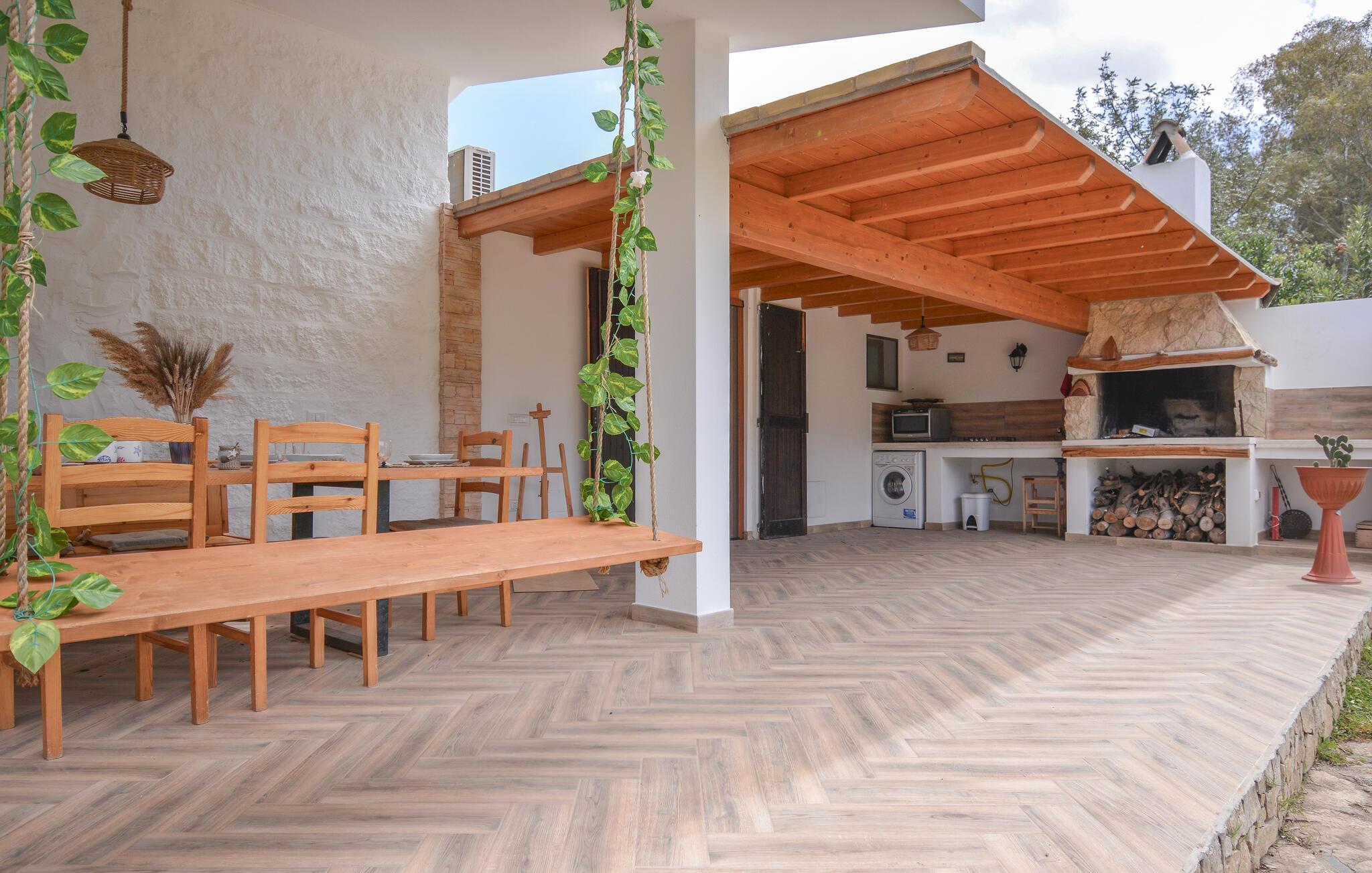På terrassen venter en huske som vil glede både store og små. Den overbygde terrassen har også et sommerkjøkken med grill, ideelt for hyggelige kvelder utendørs.