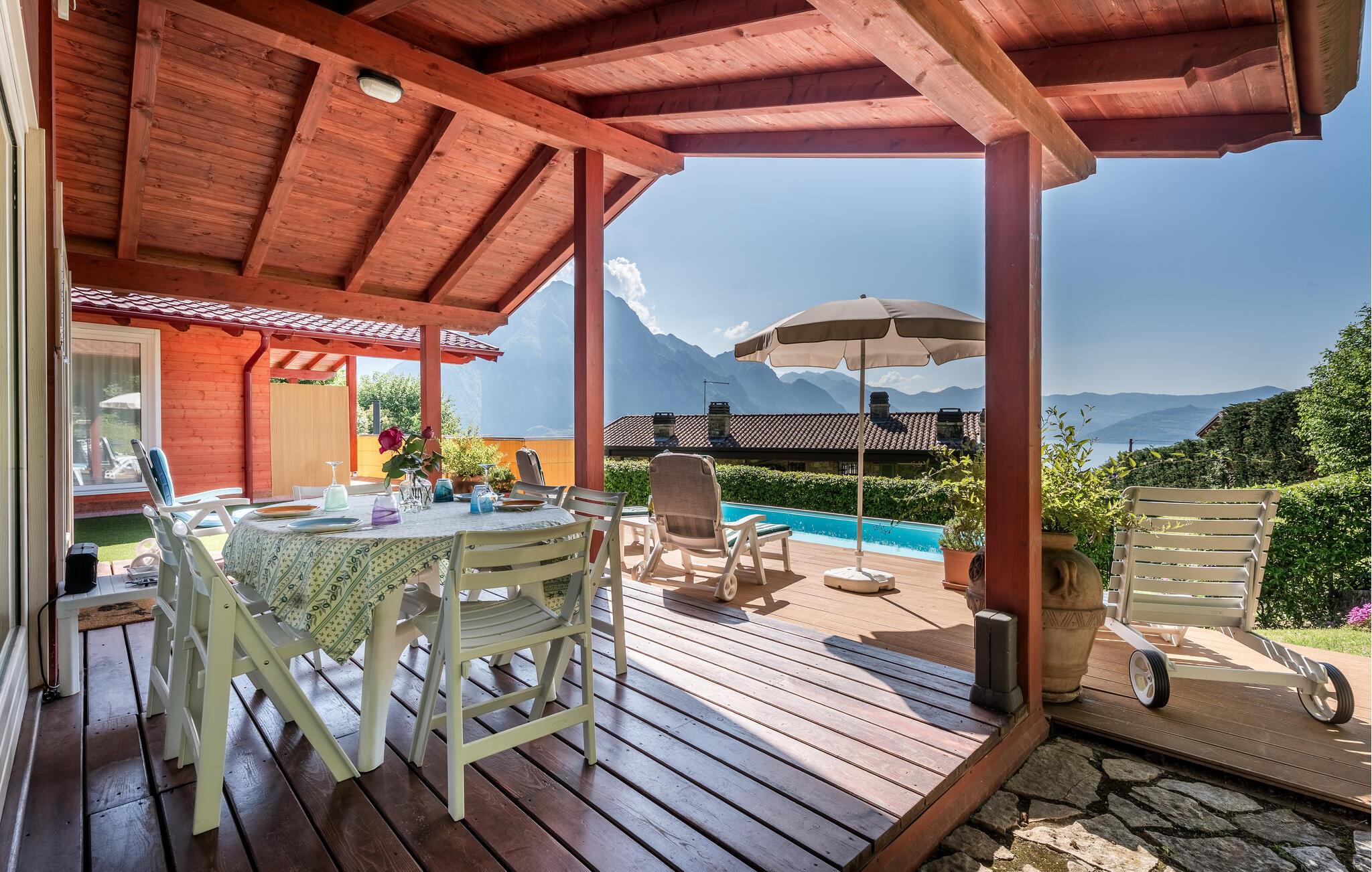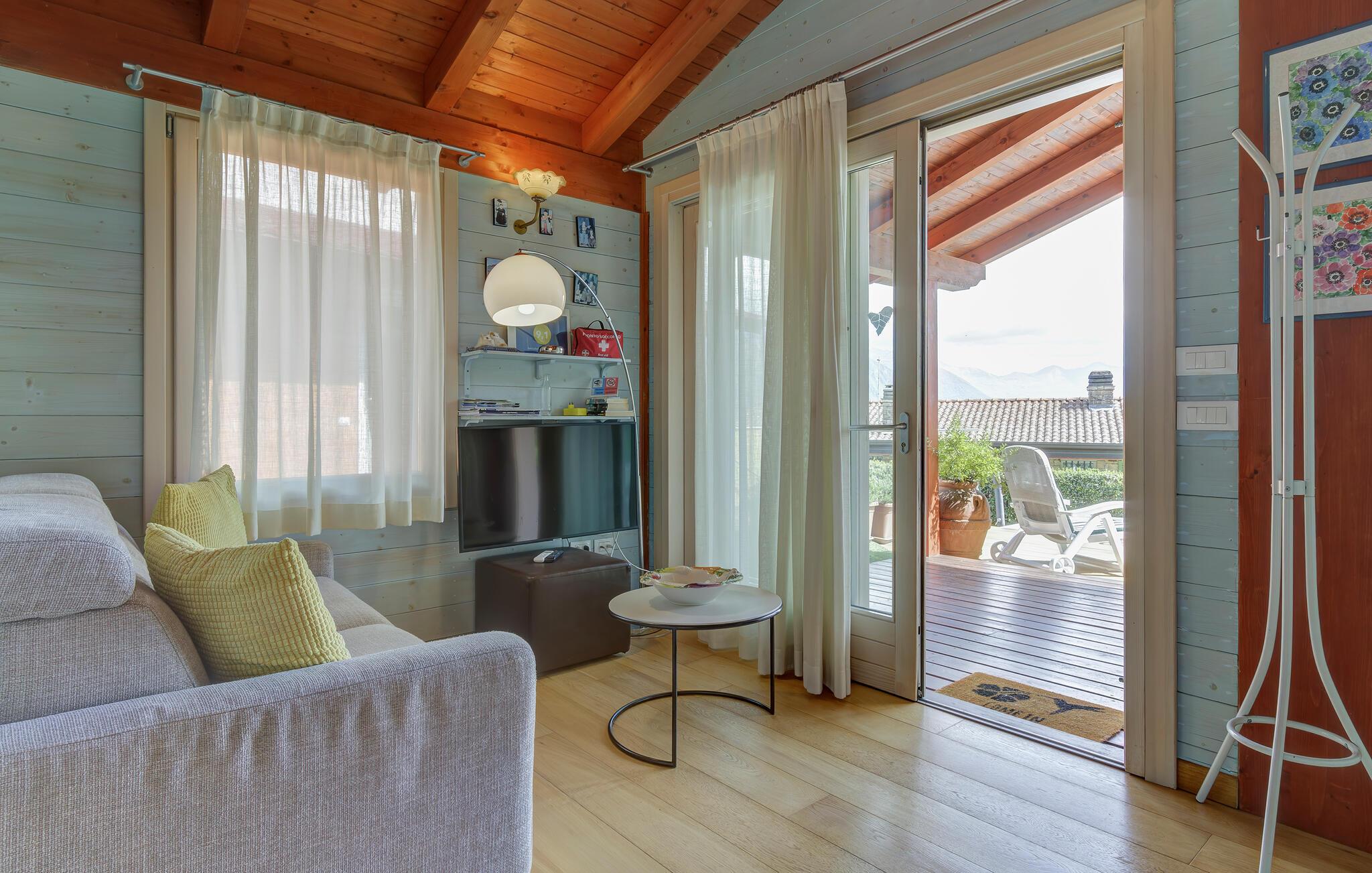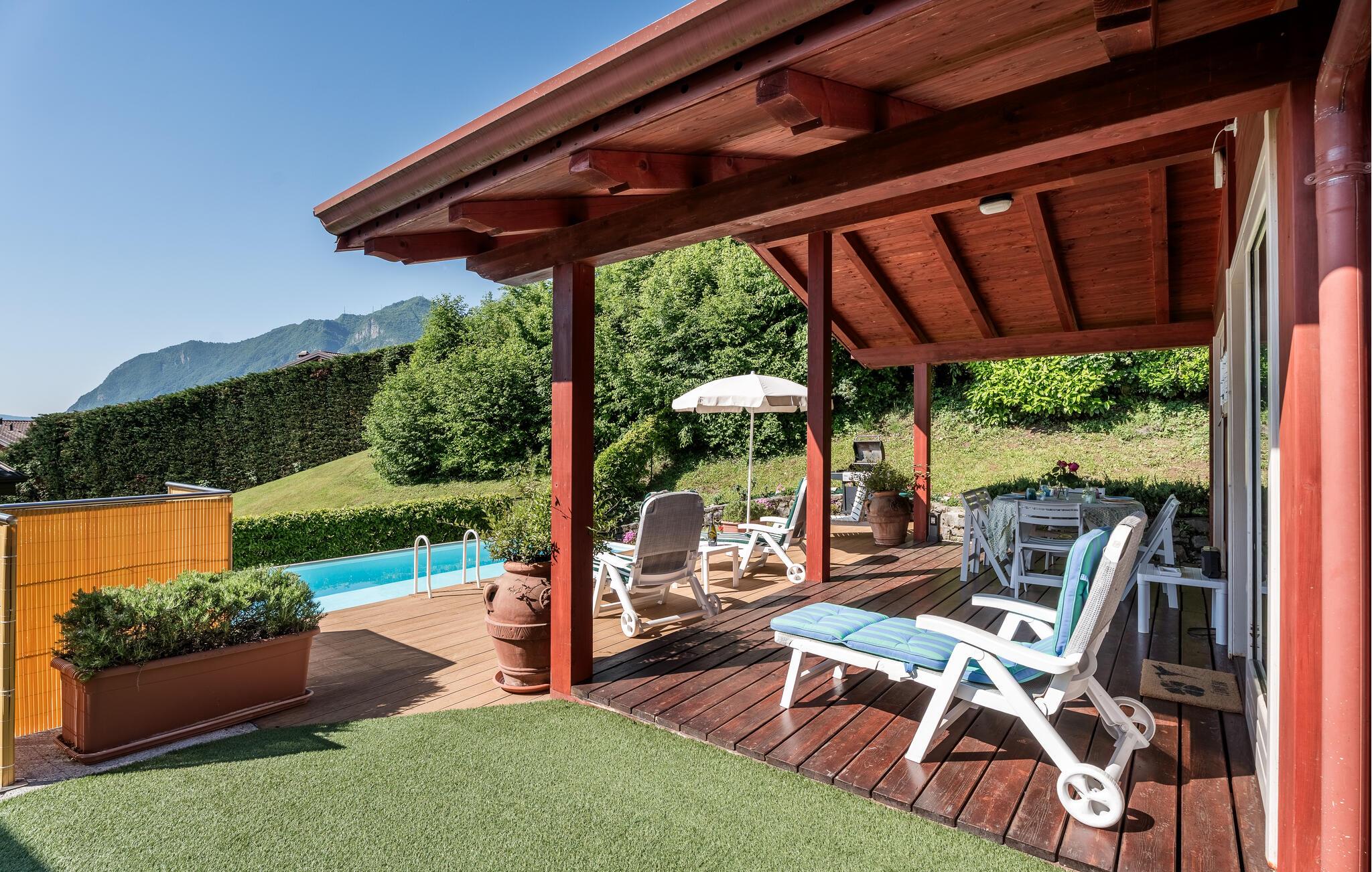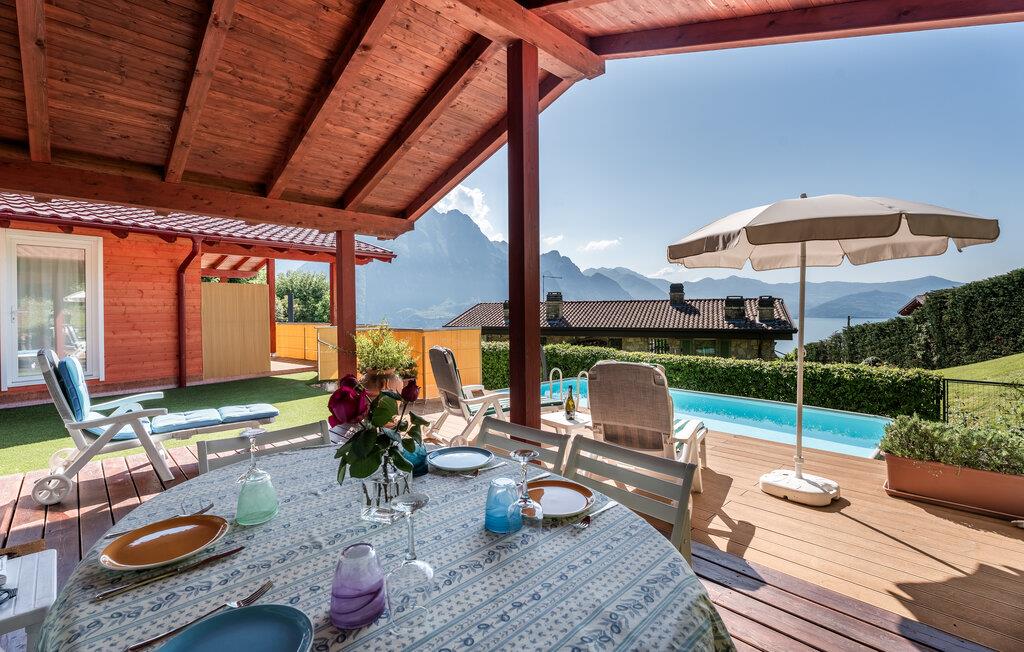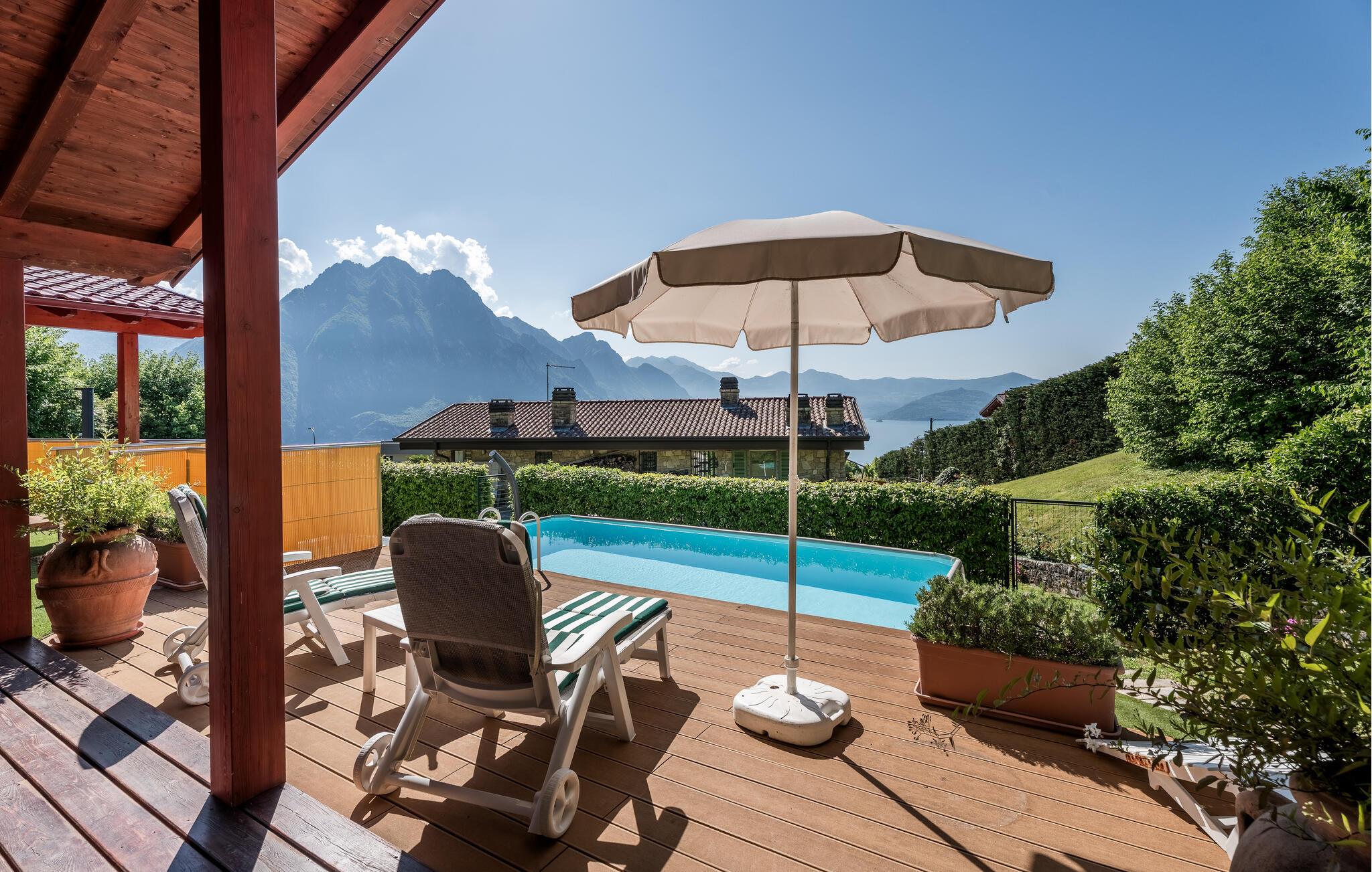 Uavhengig feriehus med privat basseng og panoramautsikt over Iseosjøen. Ferieboligen ligger i Riva di Solto, en sjarmerende landsby på vestsiden av Iseosjøen. Huset er på en etasje og består av en åpen stue / kjøkken med sovesofa, et soverom med dobbeltseng, et soverom med to enkeltsenger og et bad med dusj. Stuen fører til terrassen med basseng og med møbler og fluktstoler, ideelt for hyggelige, avslappende øyeblikk. Nyt den vakre panoramautsikten over den sjarmerende Corna Trentapassi, som er tilgjengelig til fots, og av innsjøen med den fascinerende Mont'Isola i midten. For fjellelskere ligger det berømte Monte Campione (25 km) med sine 2000 m høye topper, 30 km skiløyper og 11 skiheiser i nærheten. Ikke gå glipp av det berømte Boario Terme (26 km), byene Lovere (10 km) og Sarnico (18 km) ved bredden av Iseosjøen. Området byr på mange rekreasjonsmuligheter som fotturer, stavgang, roing, seiling og vakre utflukter i skogen. I nærheten ligger også den berømte Franciacorta med sine utsøkte viner.