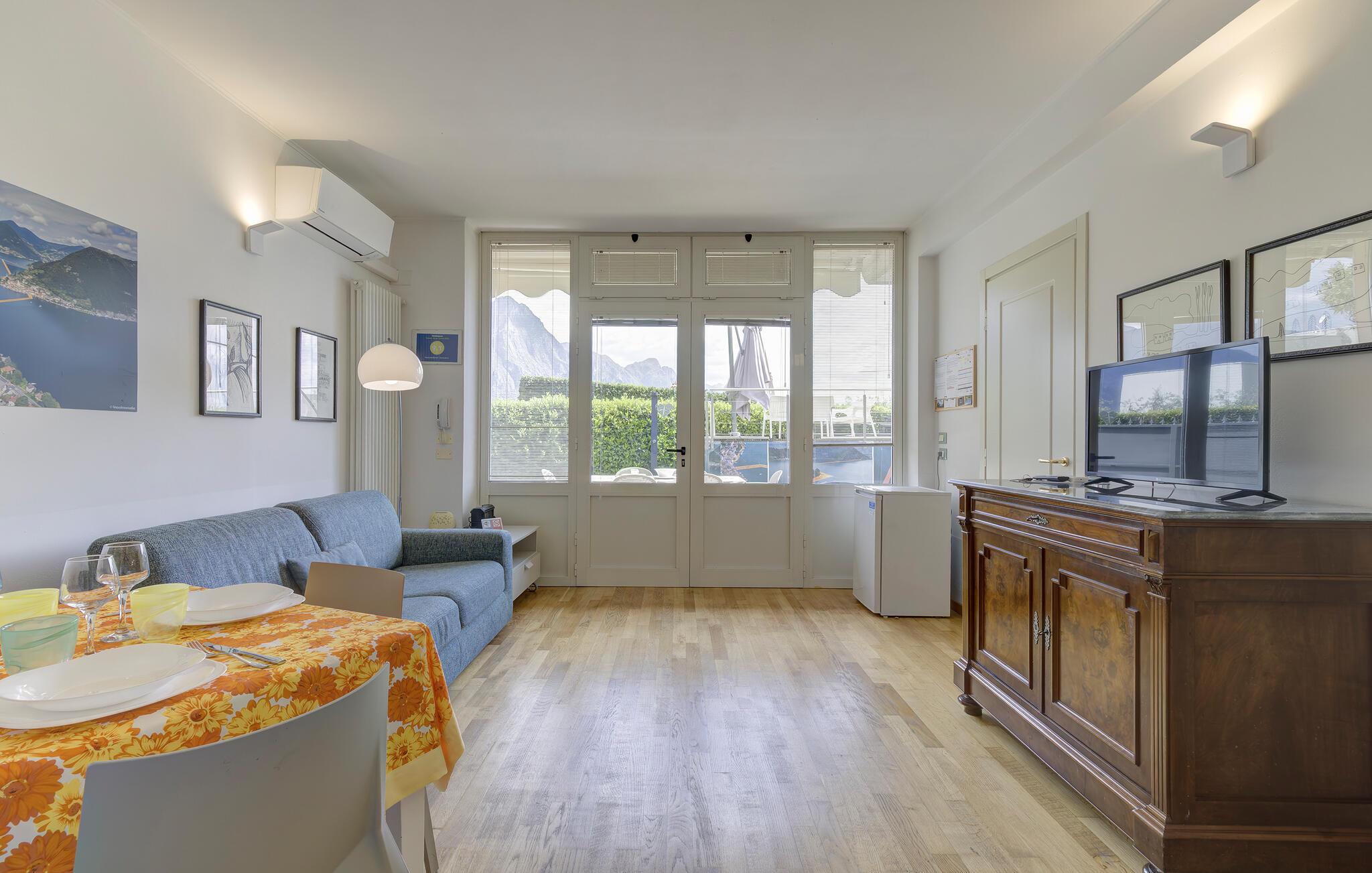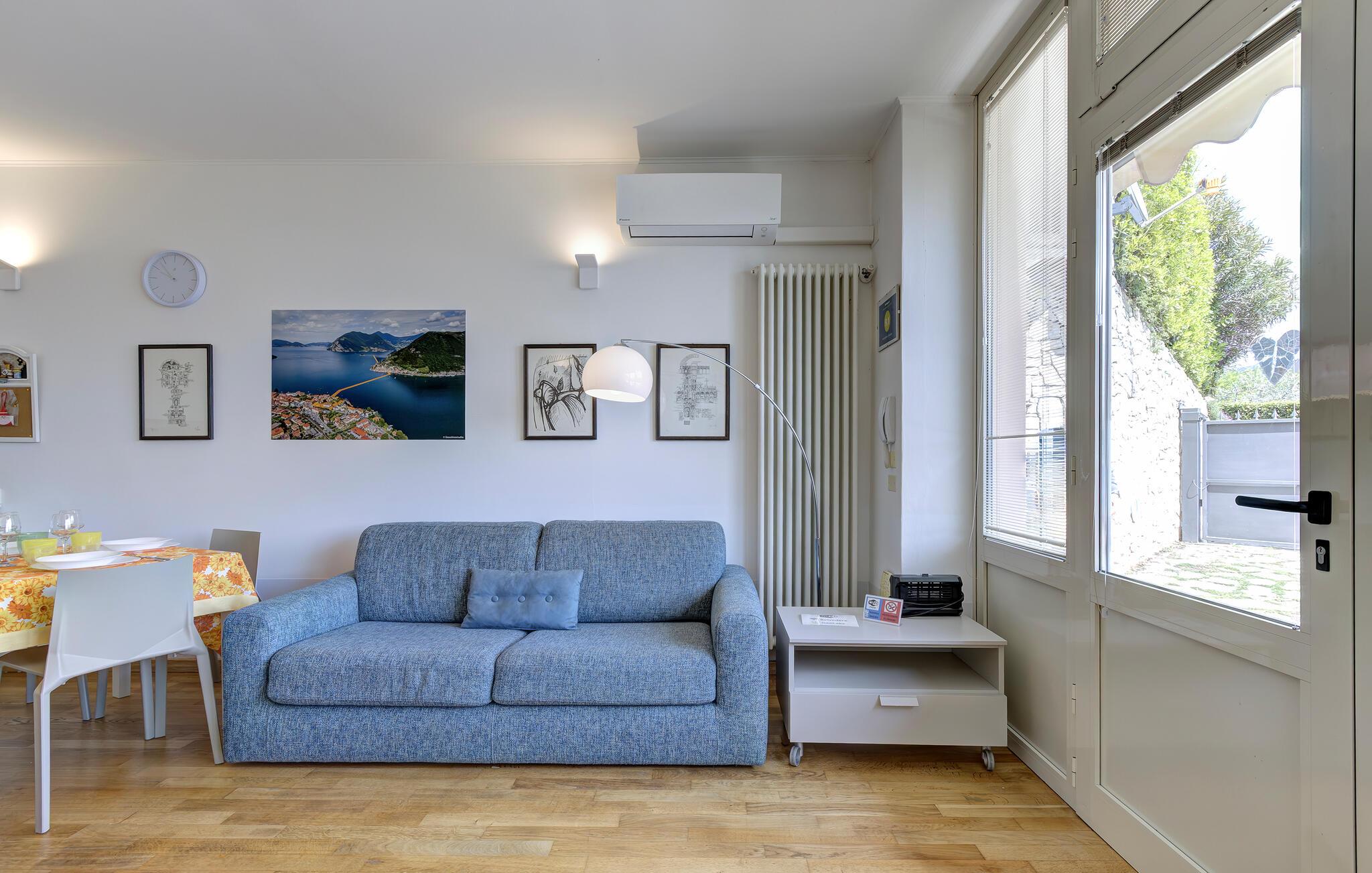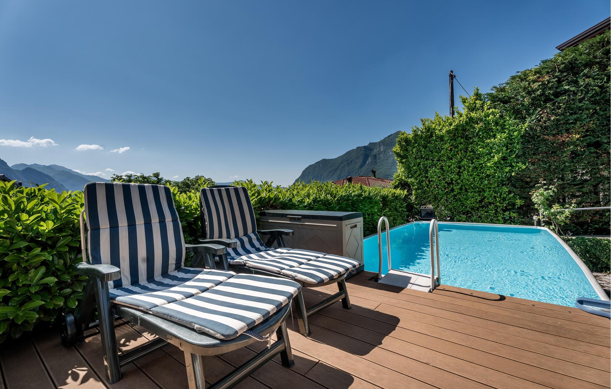Ferieleilighet med privat terrasse, lite basseng og utsikt over Iseosjøen. Ferieboligen ligger i Riva di Solto, en sjarmerende landsby på vestsiden av Iseosjøen. Innkvarteringen er på ett plan og består av et åpent kjøkken / stue med sovesofa, et soverom med dobbeltseng, et soverom med to enkeltsenger og et bad med dusj. Stuen fører til terrassen, som er utstyrt med møbler og fluktstoler, for hyggelige stunder med avslapning. Nyt den vakre panoramautsikten over den sjarmerende Corna Trentapassi, som er tilgjengelig til fots, og av innsjøen med den fascinerende Mont'Isola i midten. For fjellelskere ligger det berømte Monte Campione (25 km) med sine 2000 m høye topper, 30 km skiløyper og 11 skiheiser i nærheten. Ikke gå glipp av det berømte Boario Terme (26 km), byene Lovere (10 km) og Sarnico (18 km) ved bredden av Iseosjøen. Området byr på mange rekreasjonsmuligheter som fotturer, stavgang, roing, seiling og vakre utflukter i skogen. I nærheten ligger også den berømte Franciacorta med sine utsøkte viner.