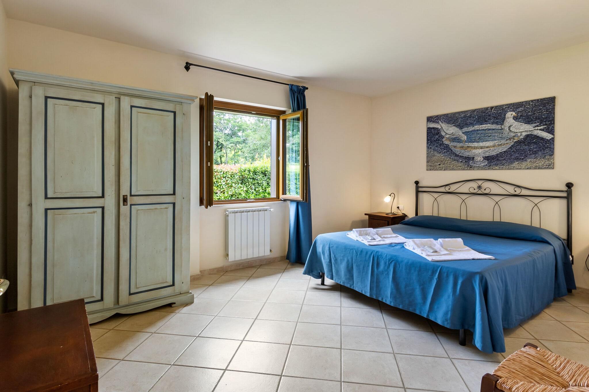 Nyt et avslappende opphold i denne sjarmerende, kjæledyrvennlige leiligheten for 4 gjester, som ligger i de bølgende åsene i Toscana nær Sorano. Med en vakkert anlagt privat hage og tilgang til førsteklasses velværefasiliteter, er dette hjemmet perfekt for par eller en liten familie som søker ro og komfort. Leiligheten ligger i første etasje og har en koselig stue med en dobbel sovesofa, TV og spisebord. Det store kjøkkenet er fullt utstyrt med kokeplate, stekeovn, kjøleskap og servant, ideelt for hjemmelagde måltider. Det er to komfortable soverom, hvert med en dobbeltseng, og to moderne bad med dusj, servant, toalett og bidet. Utendørs kan gjestene slappe av i det felles velværeområdet som inkluderer badstue, tyrkisk bad, boblebad og to oppvarmede svømmebassenger. Tennisbaner er også tilgjengelige for aktive gjester. Leiligheten tilbyr også en privat terrasse, solsenger, hagemøbler og en parasoll for å nyte det fredelige uterommet. Oppvarming, klimaanlegg og parkering er tilgjengelig, i tillegg til WiFi overalt. Enten du bader i termalbadene, utforsker de nærliggende toskanske landsbyene eller bare slapper av ved bassenget, tilbyr denne leiligheten et perfekt tilfluktssted i hjertet av naturen.