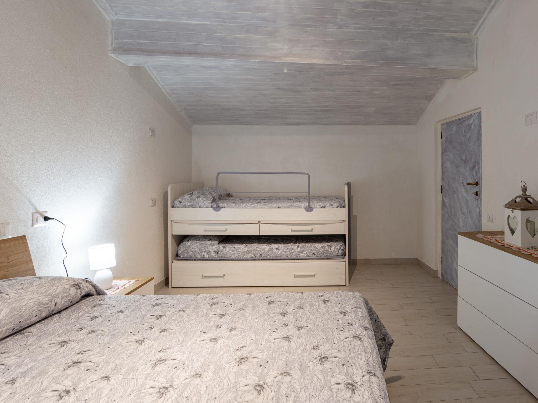 3-room house 100 m2 on 3 levels, on the upper ground floor. Rustic and tasteful furnishings: open living room with TV. Exit to the balcony. 1 double bedroom. Large, open kitchen (oven, dishwasher, 4 induction hot plates, toaster, electric coffee machine) with dining table. Exit to the terrace. Hip bath/bidet/WC. Heating. Heating not available in all rooms. Upper floor: 1 room with 1 x 2 bunk beds, 1 double bed. Small balcony, small terrace, large patio. Terrace furniture, balcony furniture, barbecue, deck chairs (2). Marvellous view of the mountains. Facilities: washing machine, children's high chair, baby cot for up to 2 year olds, hair dryer. Internet (WiFi, free). Please note: non-smoking house. Maximum 1 pet/ dog allowed. IT013216C2F82B9EYI
