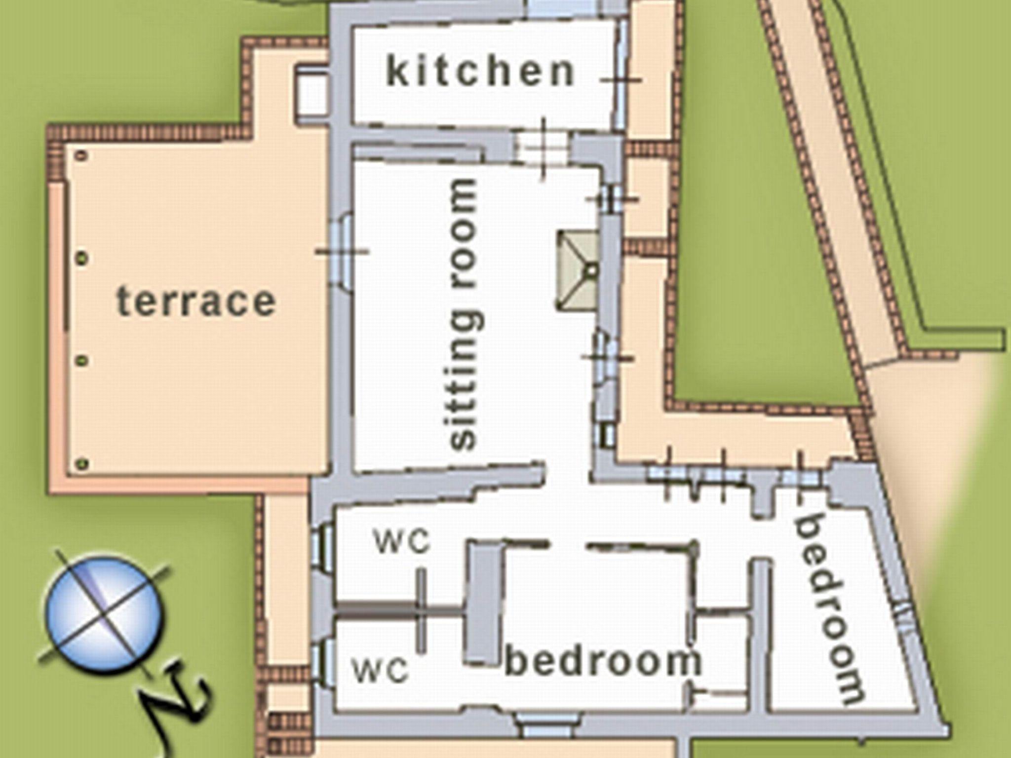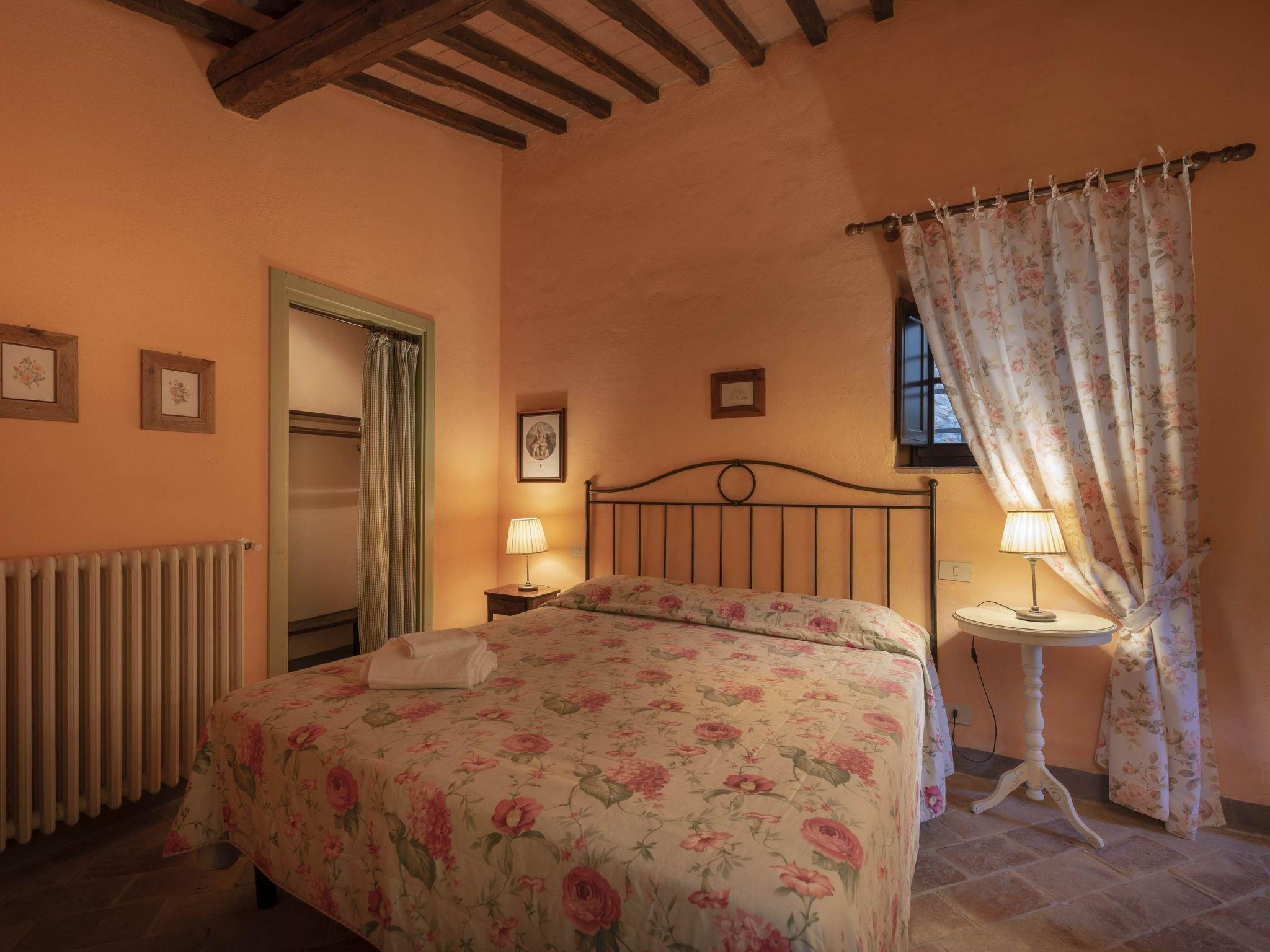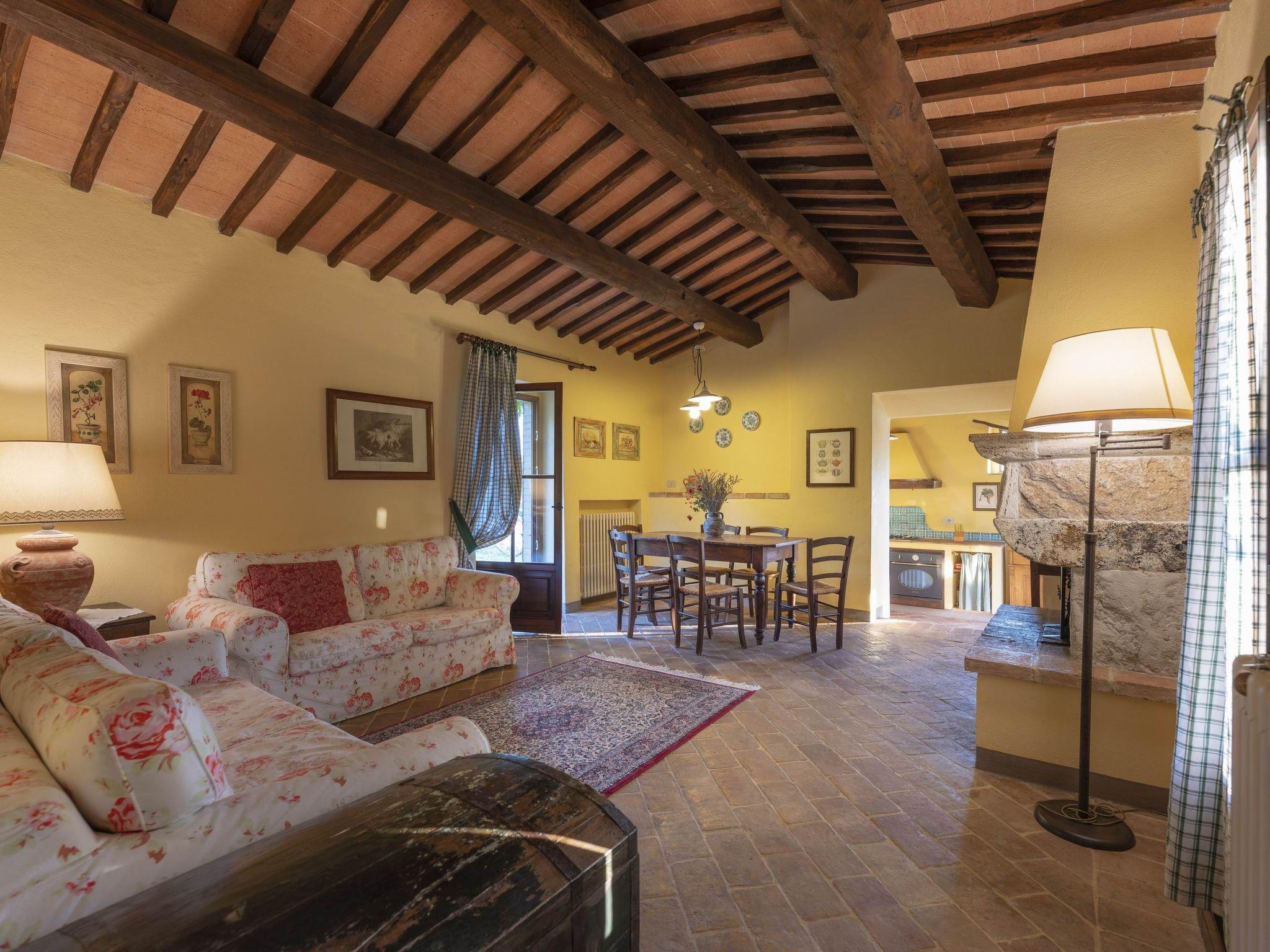 The 77 m² flat for 4+2 persons (sofa bed suitable for children up to 1.50 m tall) is located on the ground floor of an annex directly adjacent to the main building. Ground floor: living room with fireplace and sofa, dining area, kitchen, double room with walk-in wardrobe, bathroom with shower, twin room with walk-in wardrobe, bathroom with shower. From the living room you have access to the covered terrace equipped with table and chairs, from which you can enjoy a wonderful view of the pool and the surrounding countryside.