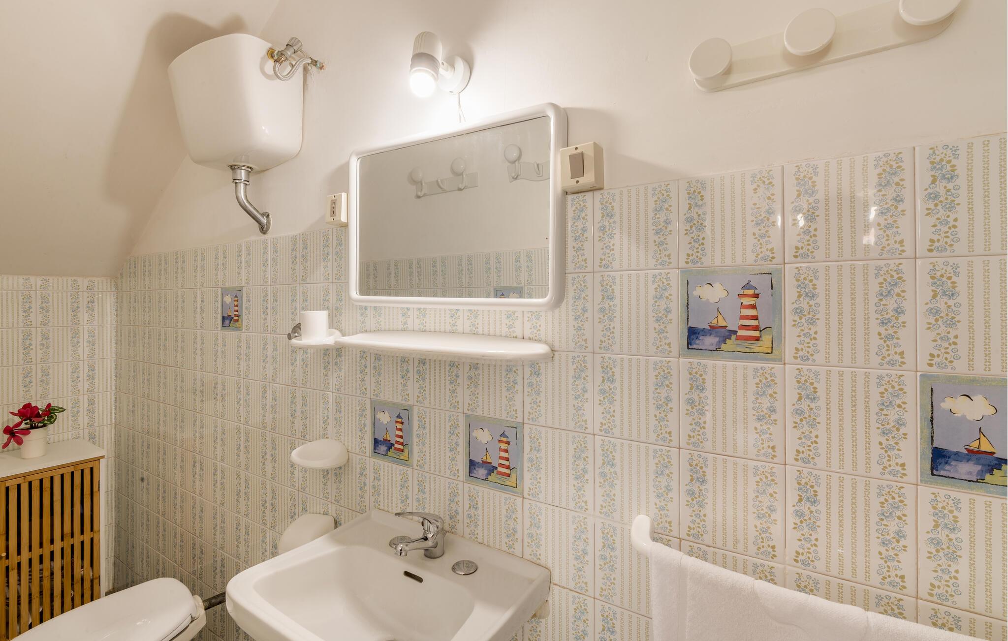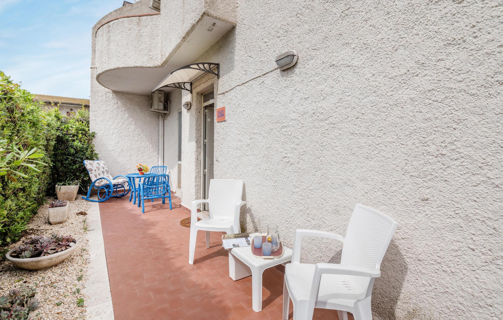 Stor del av en tomannsbolig med privat hage, bare 50 meter fra stranden i Lido di Tarquinia. I hagen er det en komfortabel skyggefull veranda for uteservering, en grill og solsenger, ideelt for å slappe av etter en vakker dag på stranden. Sandstranden ligger bare noen få skritt unna, og det er mulig å leie parasoller (mot betaling). En del av stranden er også tilrettelagt for funksjonshemmede, og 300 meter unna er det også en del av stranden som er dedikert til våre firbente venner. Bak huset er det en furuskog og en stor offentlig parkeringsplass. Tarquinia og det etruskiske museet ligger 7,6 km unna. Det er sentrum av det sørlige Etruria, et enestående symbol på etruskisk kunst, med en fascinerende middelaldersk gamleby og viktige arkeologiske utgravninger, som har blitt erklært som UNESCOs verdensarvliste. For en dagstur til Roma: Toget går fra jernbanestasjonen 3 km unna og ankommer hovedstaden på 45 minutter. Beliggenheten er strategisk ideell for å besøke Tuscia-regionen i den nordlige delen av det som nå er Lazio. Civitavecchia og havnen ligger 21 km unna, og Viterbo med termalbadene Terme dei Papi ligger 51 km unna. Boligen er innredet på to plan: Første etasje med stor stue med sovesofa (1 person) og spiseplass, kjøkken med direkte utgang til hagen, WC. Første etasje: soverom med dobbeltseng med utgang til balkong med havutsikt, soverom med dobbeltseng med balkong og utsikt over furuskogen, soverom med køyeseng med balkong og utsikt over furuskogen, bad med dusj. Alle rommene har myggnett.