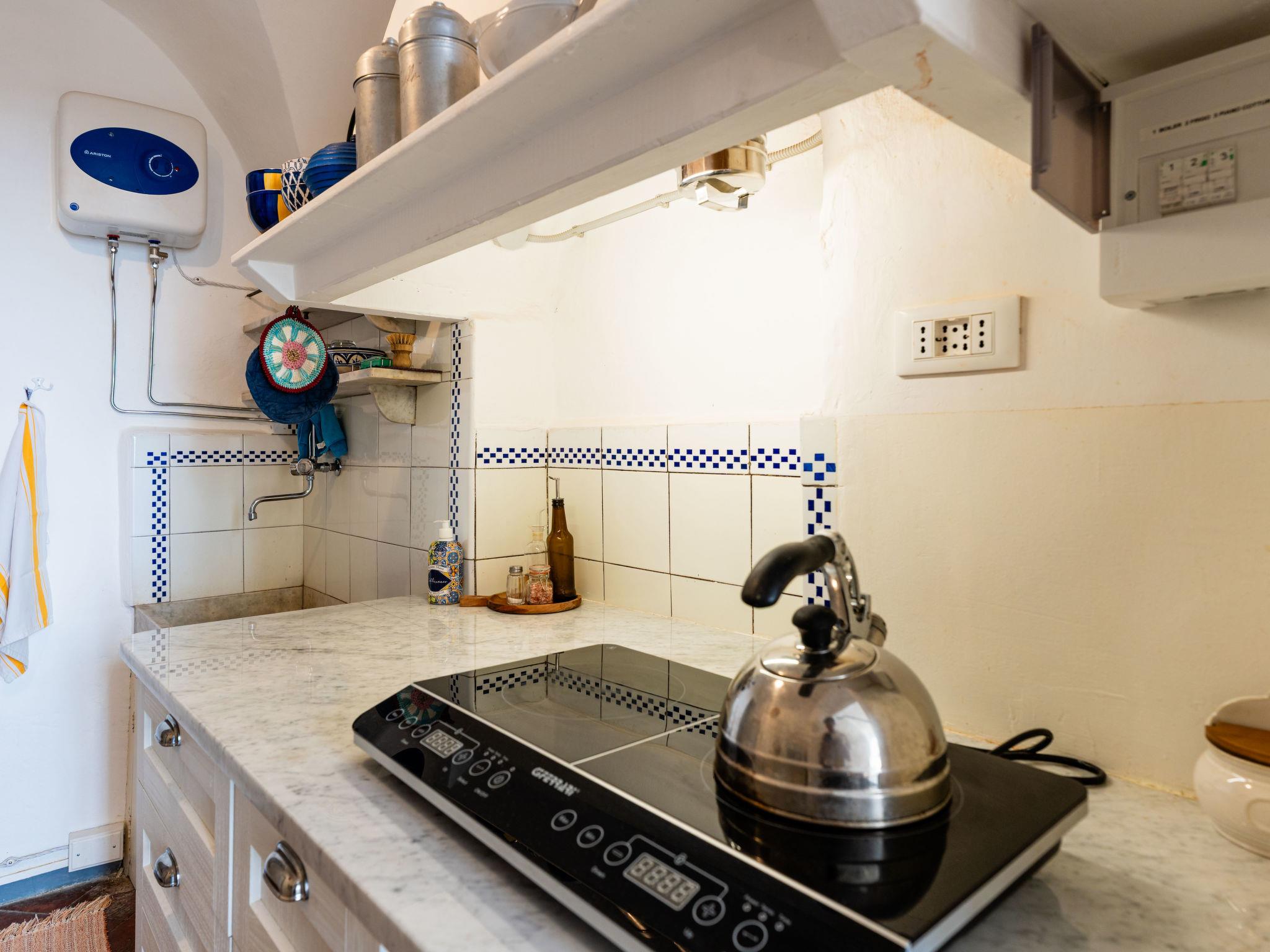 "Ca'de Cicin", 3-room apartment 90 m2, on the ground floor. Antique and tasteful furnishings: living/dining room with 1 sofabed (90 cm, length 200 cm), shower/bidet/WC. 1 room with 1 bed (80 cm, length 180 cm). Kitchenette (2 induction hot plates, microwave). 2nd upper floor: 1 double bedroom. Exit to the terrace. Kitchenette (1 induction hot plates, toaster, kettle). Shower/bidet/WC. No heating option. Terrace 15 m2. Terrace furniture. View of the sea and the resort. Facilities: children's high chair, baby cot for up to 2 year olds, hair dryer. Internet (WiFi, free). Please note: private entrance, smoke alarm, fire extinguisher. pellet heating. IT008060B4NW896B6C