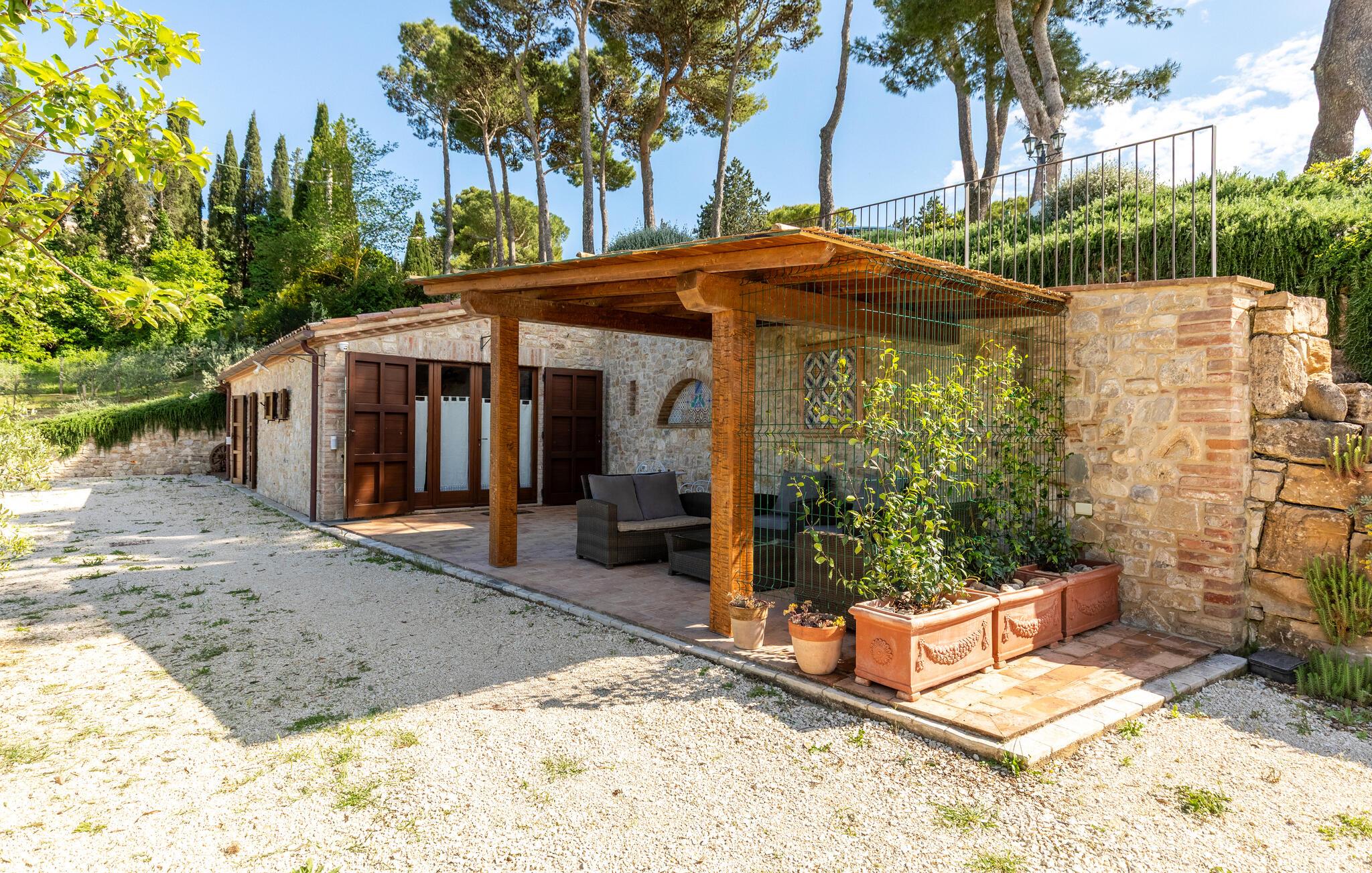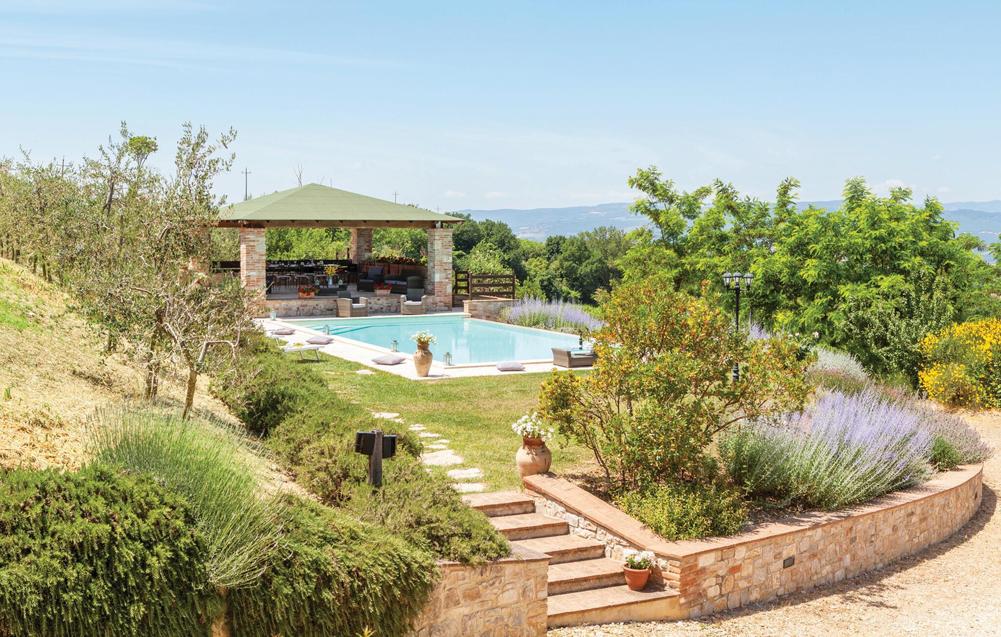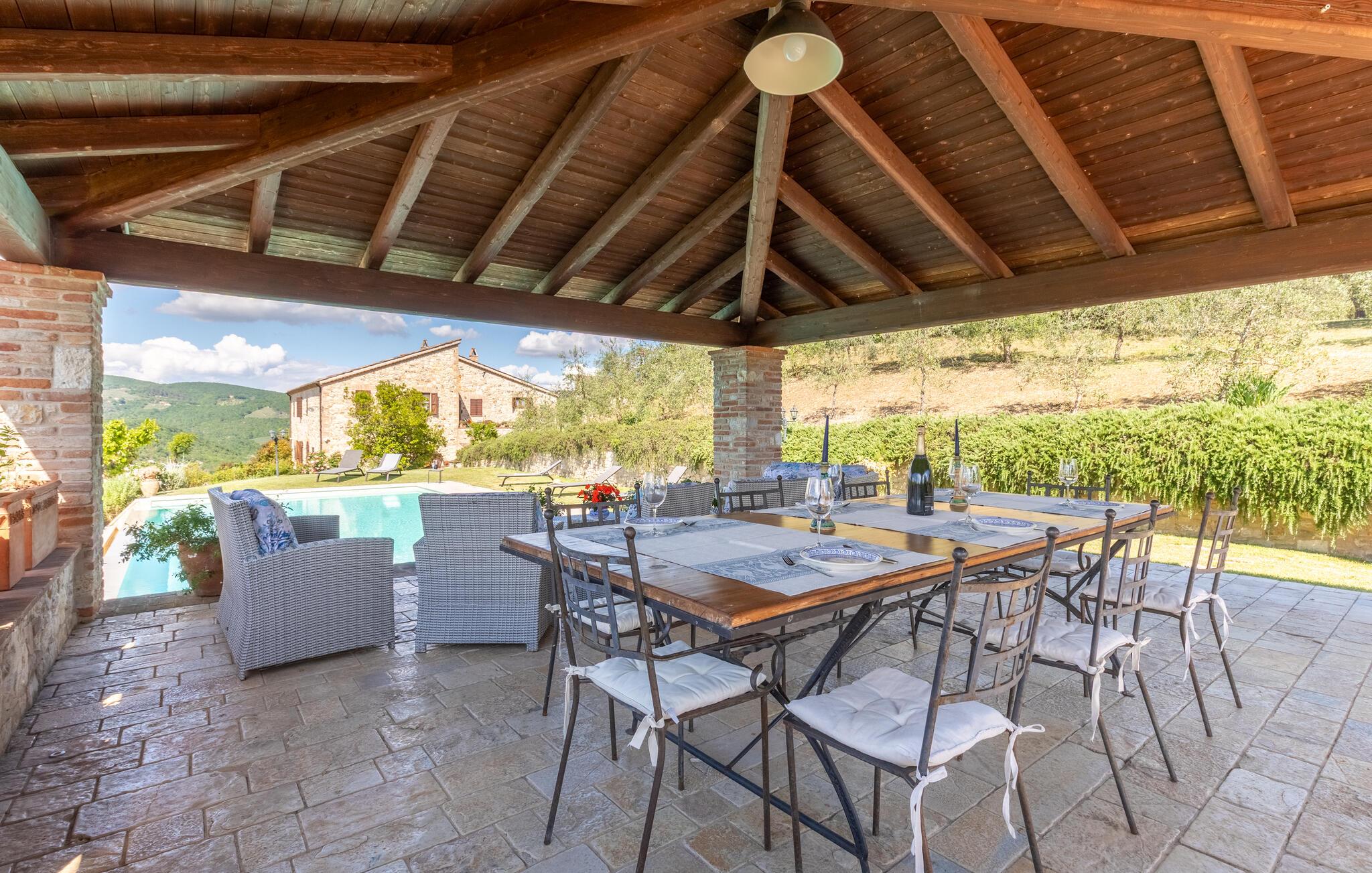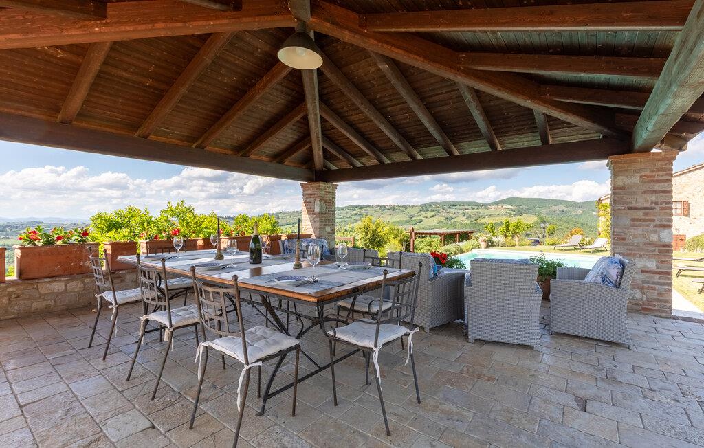 Hovedhuset tilbyr den vakreste panoramautsikten: Fra den møblerte terrassen kan du nyte utsikten over bassenget og de bølgende åsene i Umbria. Bare noen få meter unna ligger dependance og i den tredje bygningen bor huseierne av og til. Til eksklusiv disposisjon for gjestene i den velholdte hagen: Evighetsbasseng, stor panoramapaviljong for uteservering, tilstøtende steingrill med kjøkken og peis. Tjenester på forespørsel: matlagingskurs, vinkjellerturer, vinsmaking, trøffeljakt. Autentiske dyrebare materialer er fortsatt synlige i denne rustikke borgoen, møblene er laget av antikviteter og flisene på grillen er fra Sicilia. Todi-området er vert for oenogastronomiske, kulturelle og musikalske arrangementer i løpet av sommeren. Omtrent 150 meter unna ligger det karakteristiske middelalderslottet Petroro, som delvis tilhører samme eier.